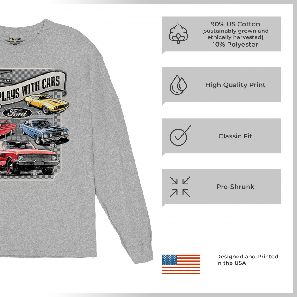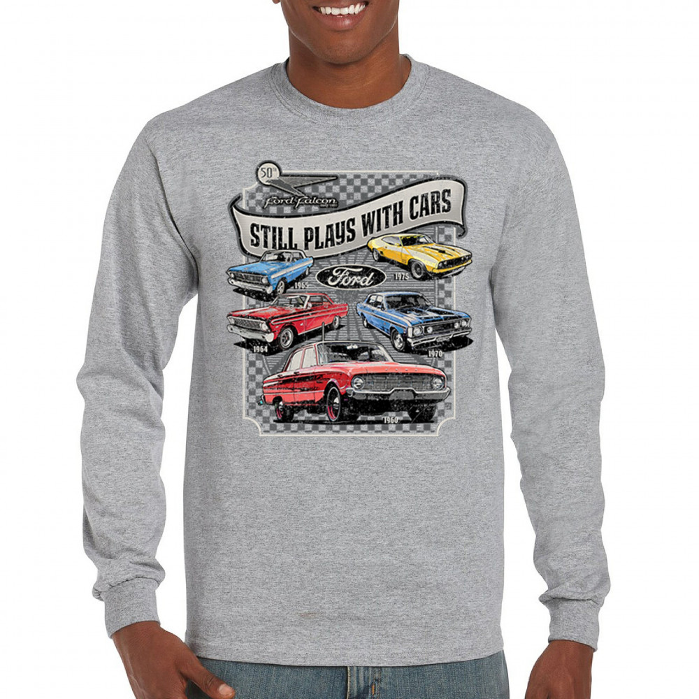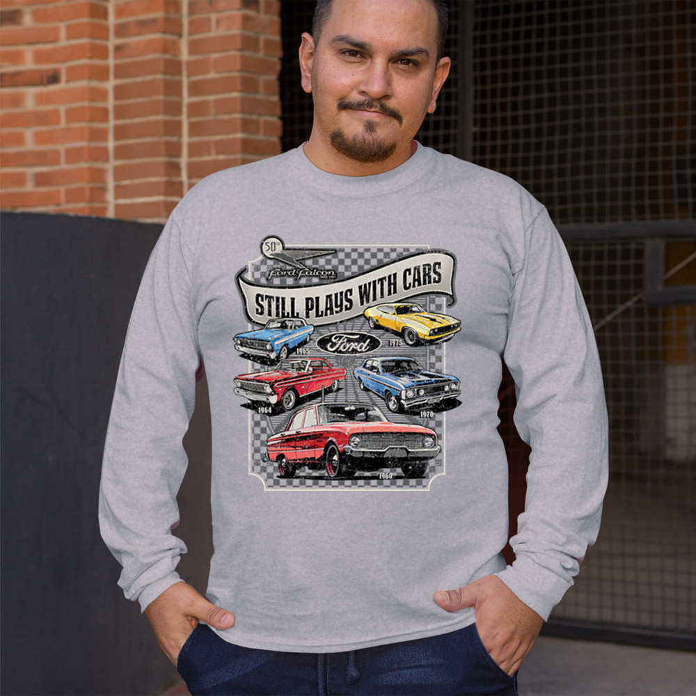 Still Plays With Cars pays tribute to the Ford Falcon, showcasing legendary models from the 60s and 70s for true vintage car lovers. Perfect for gearheads, hot rod fans, and classic car collectors, this design celebrates retro automobile culture, vintage horsepower, and old school rides. A great value piece for anyone devoted to the classic car scene.