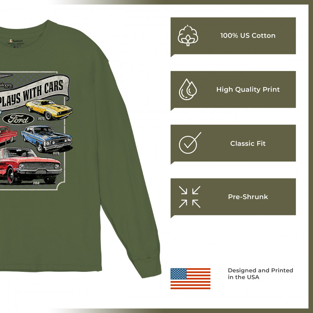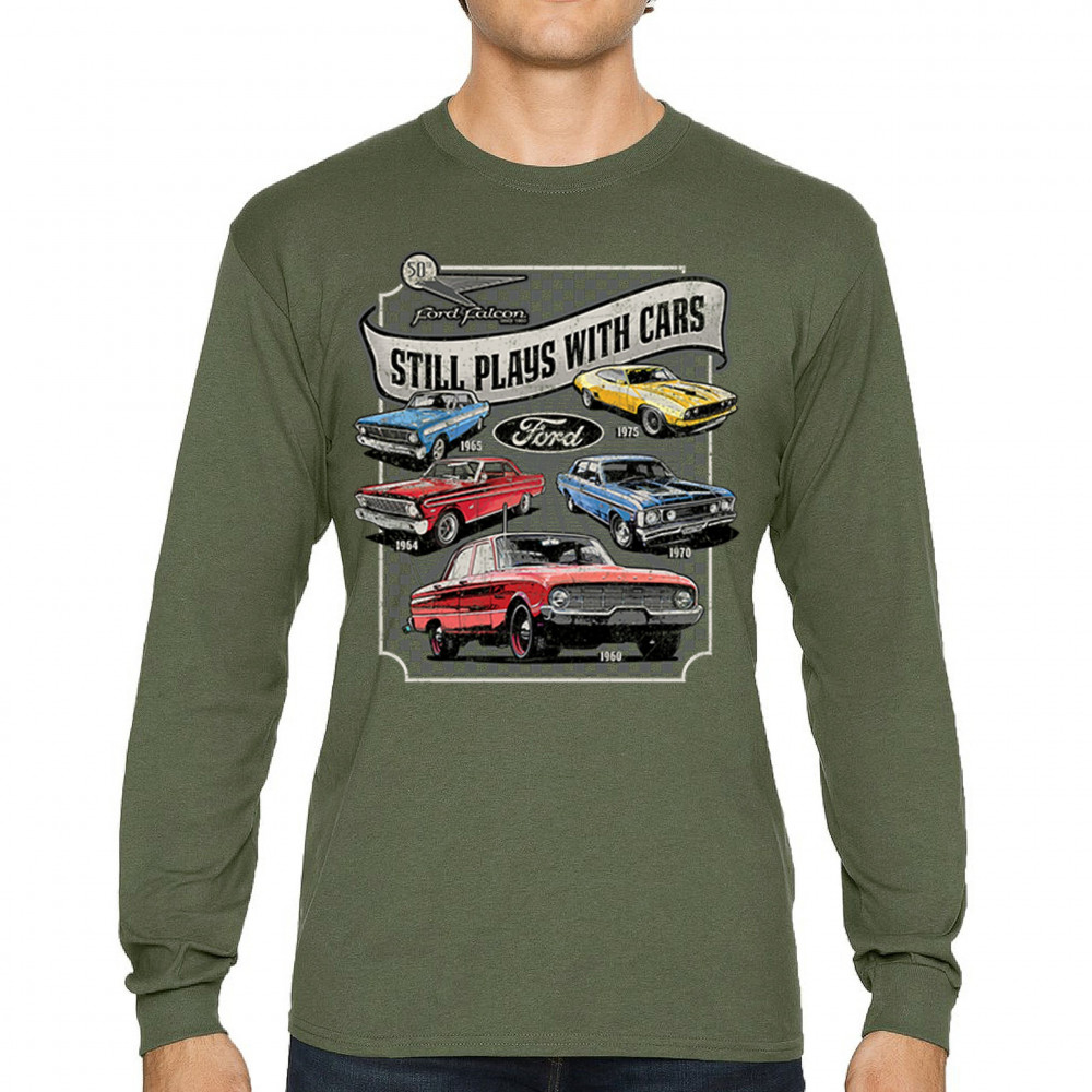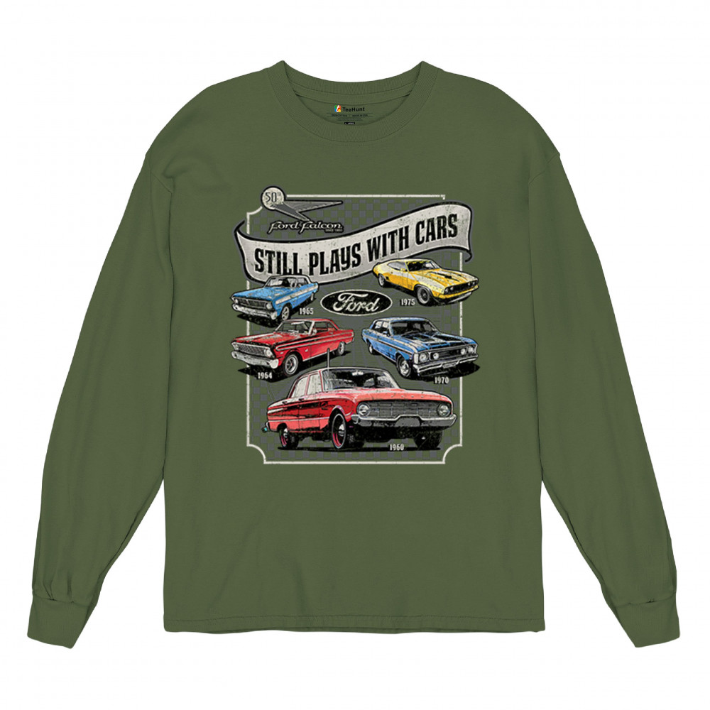 Still Plays With Cars pays tribute to the Ford Falcon, showcasing legendary models from the 60s and 70s for true vintage car lovers. Perfect for gearheads, hot rod fans, and classic car collectors, this design celebrates retro automobile culture, vintage horsepower, and old school rides. A great value piece for anyone devoted to the classic car scene.