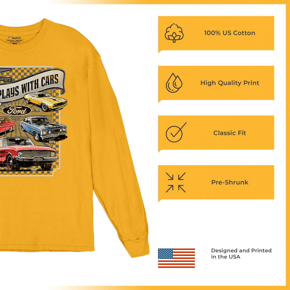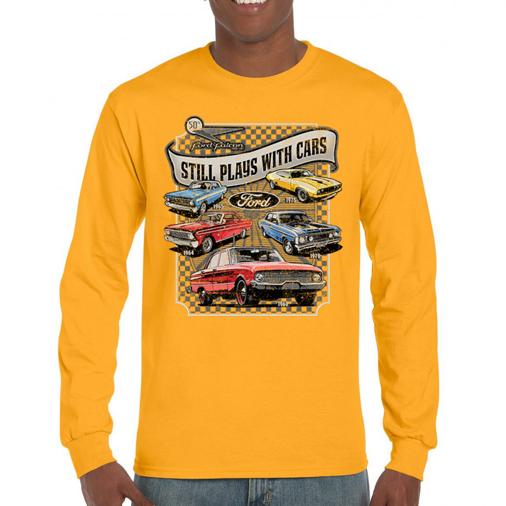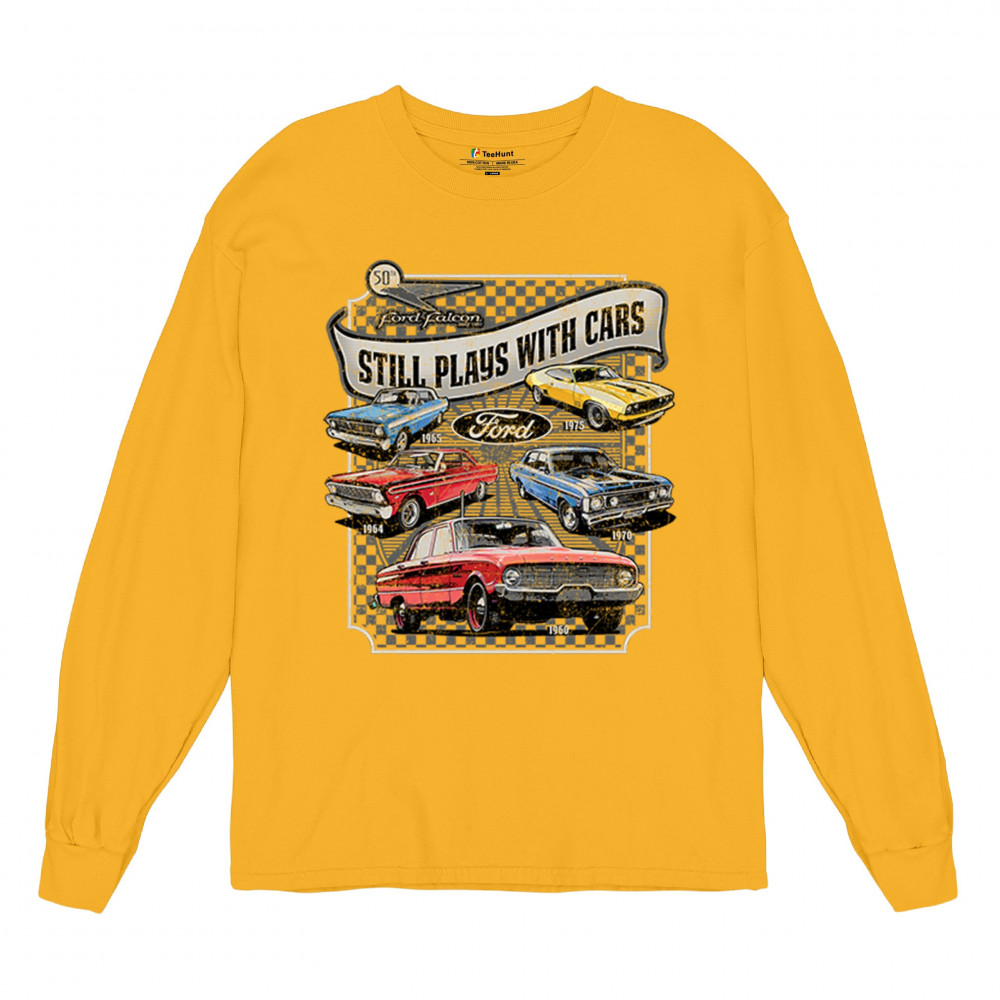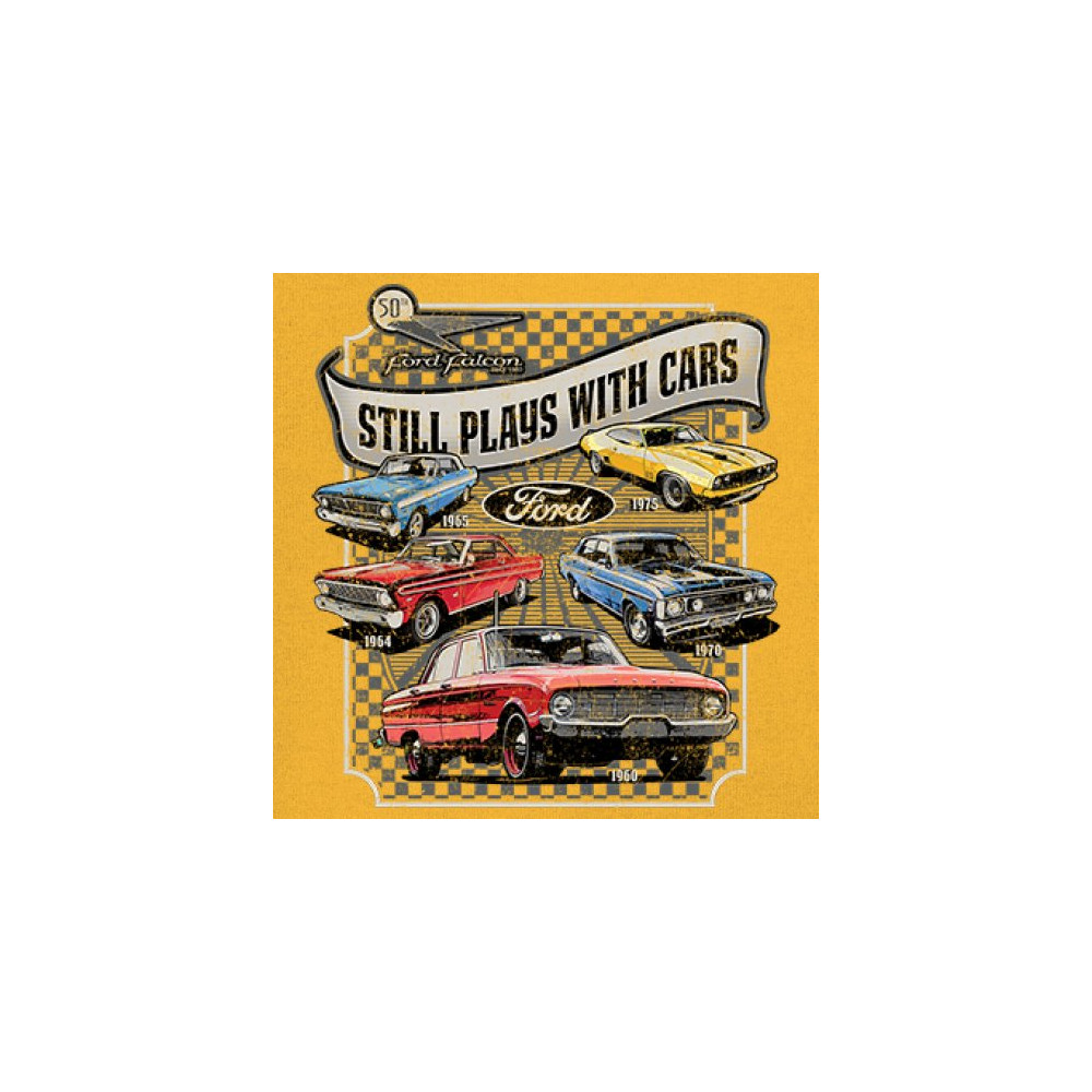 Still Plays With Cars pays tribute to the Ford Falcon, showcasing legendary models from the 60s and 70s for true vintage car lovers. Perfect for gearheads, hot rod fans, and classic car collectors, this design celebrates retro automobile culture, vintage horsepower, and old school rides. A great value piece for anyone devoted to the classic car scene.