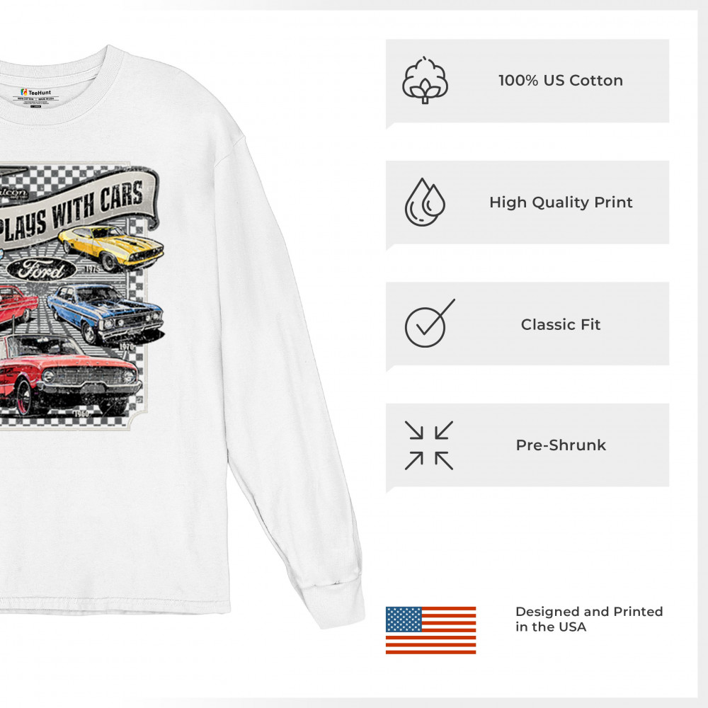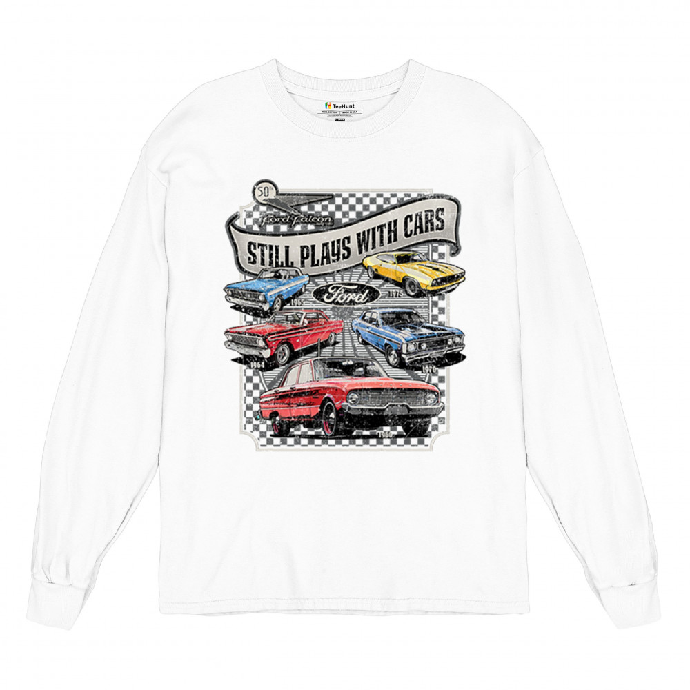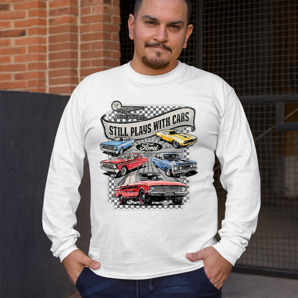 Still Plays With Cars pays tribute to the Ford Falcon, showcasing legendary models from the 60s and 70s for true vintage car lovers. Perfect for gearheads, hot rod fans, and classic car collectors, this design celebrates retro automobile culture, vintage horsepower, and old school rides. A great value piece for anyone devoted to the classic car scene.
