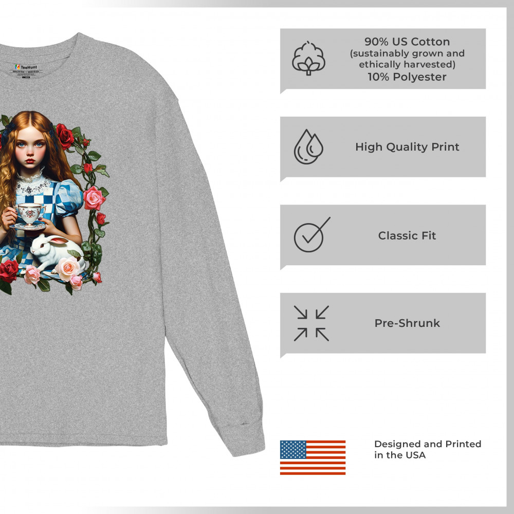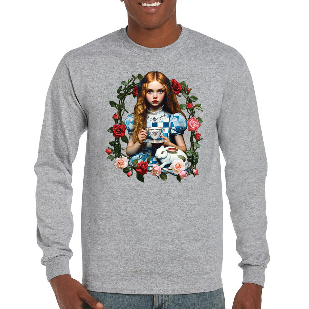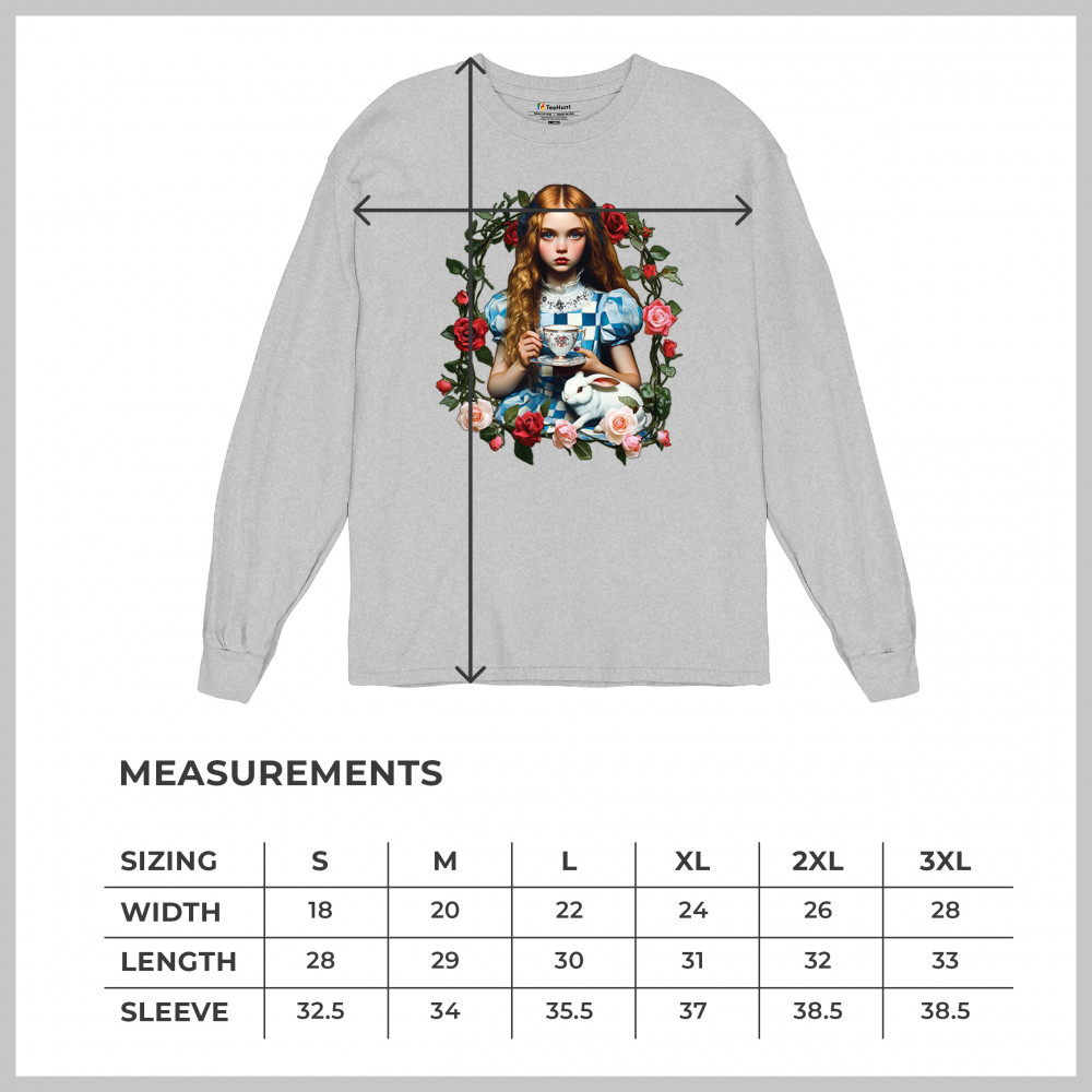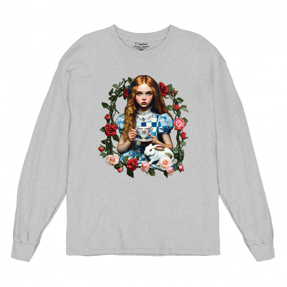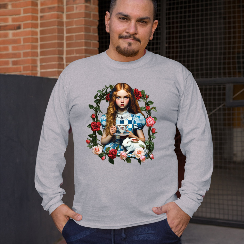 Step into a storybook dream with this Wonderland-inspired design featuring a young girl at a tea party with her white rabbit companion. Framed by roses, it evokes vintage charm, fantasy, and magical nostalgia. Ideal for bookworms, collectors, and lovers of fairytales, it blends whimsical elegance with timeless childhood wonder.