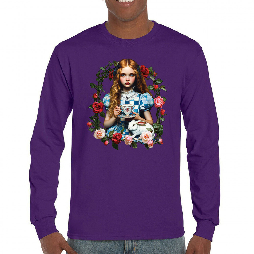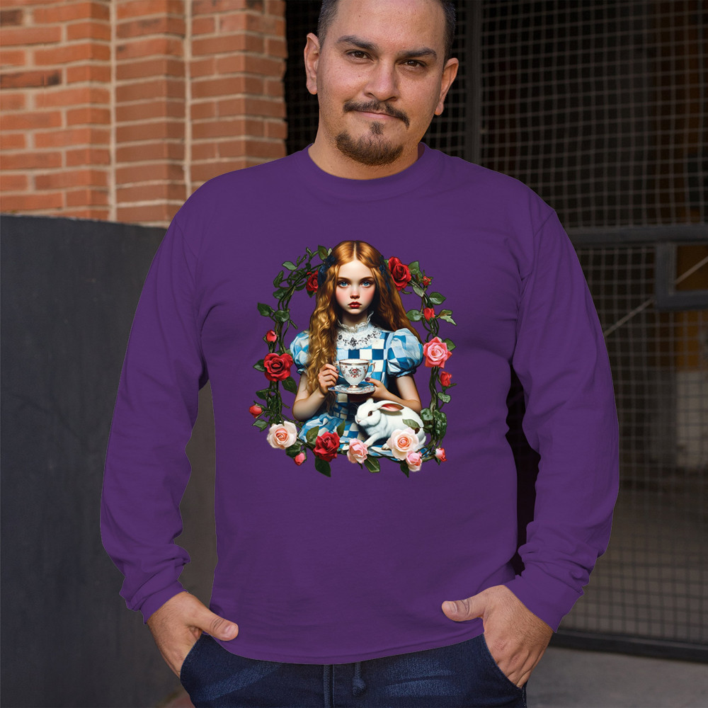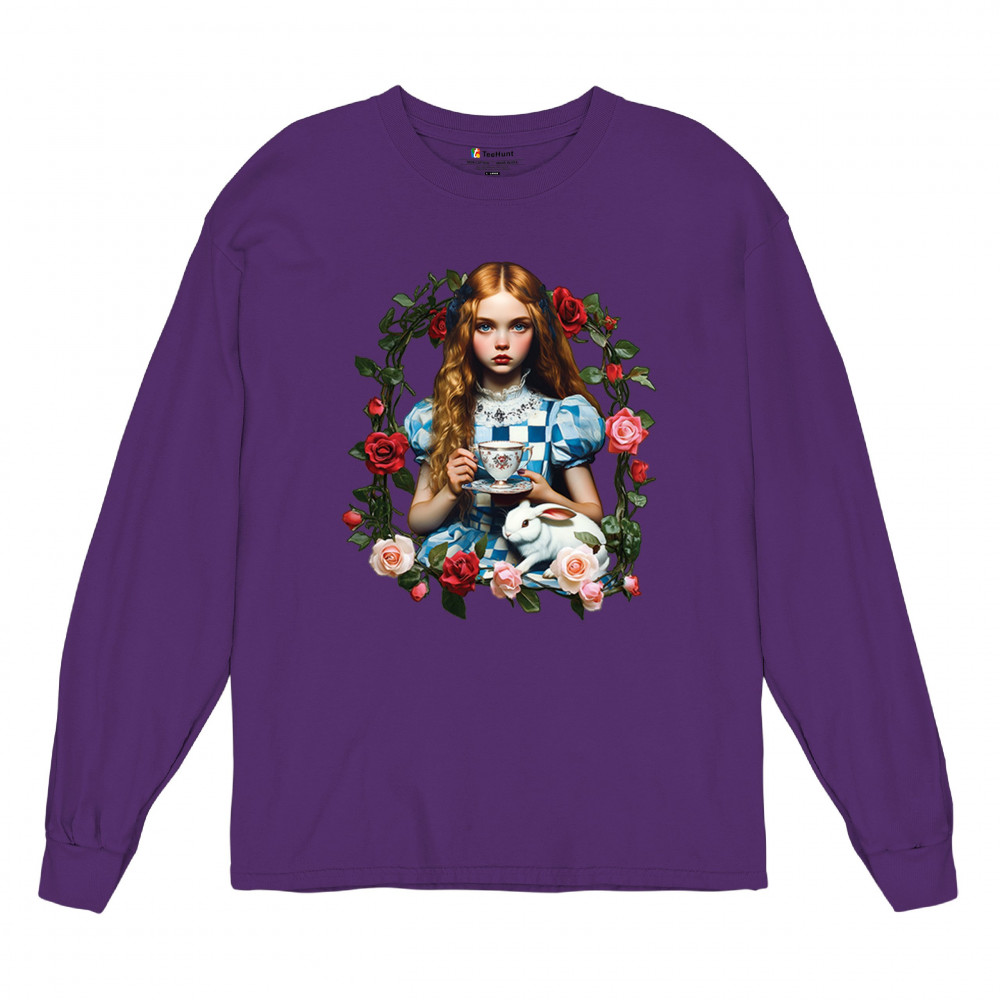 Step into a storybook dream with this Wonderland-inspired design featuring a young girl at a tea party with her white rabbit companion. Framed by roses, it evokes vintage charm, fantasy, and magical nostalgia. Ideal for bookworms, collectors, and lovers of fairytales, it blends whimsical elegance with timeless childhood wonder.