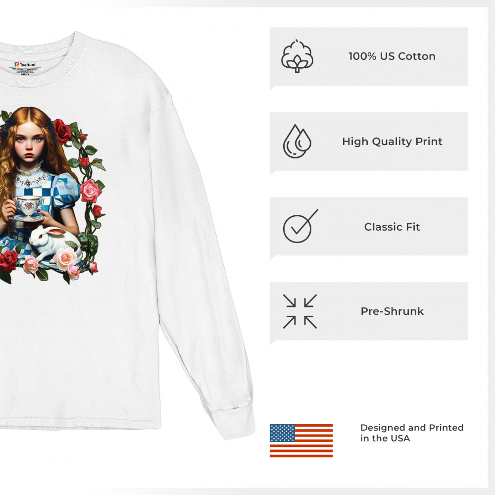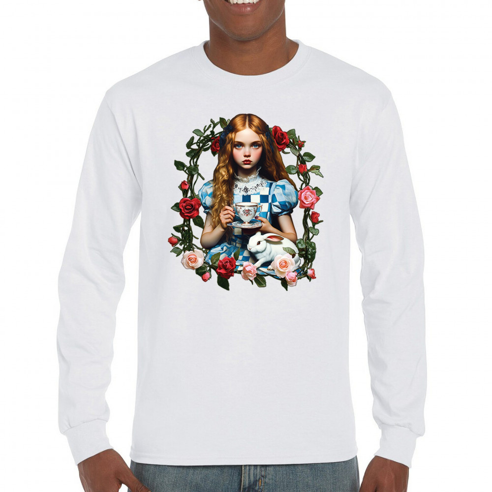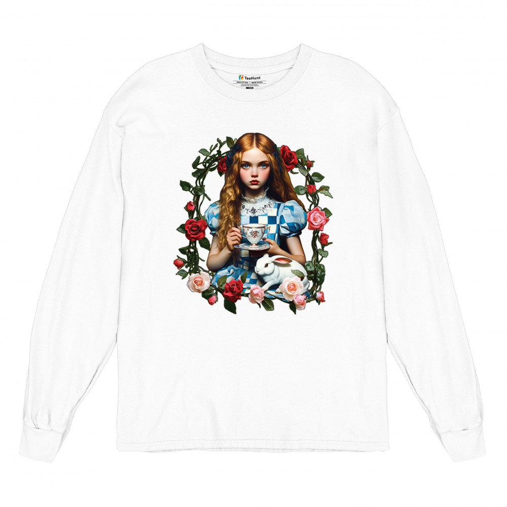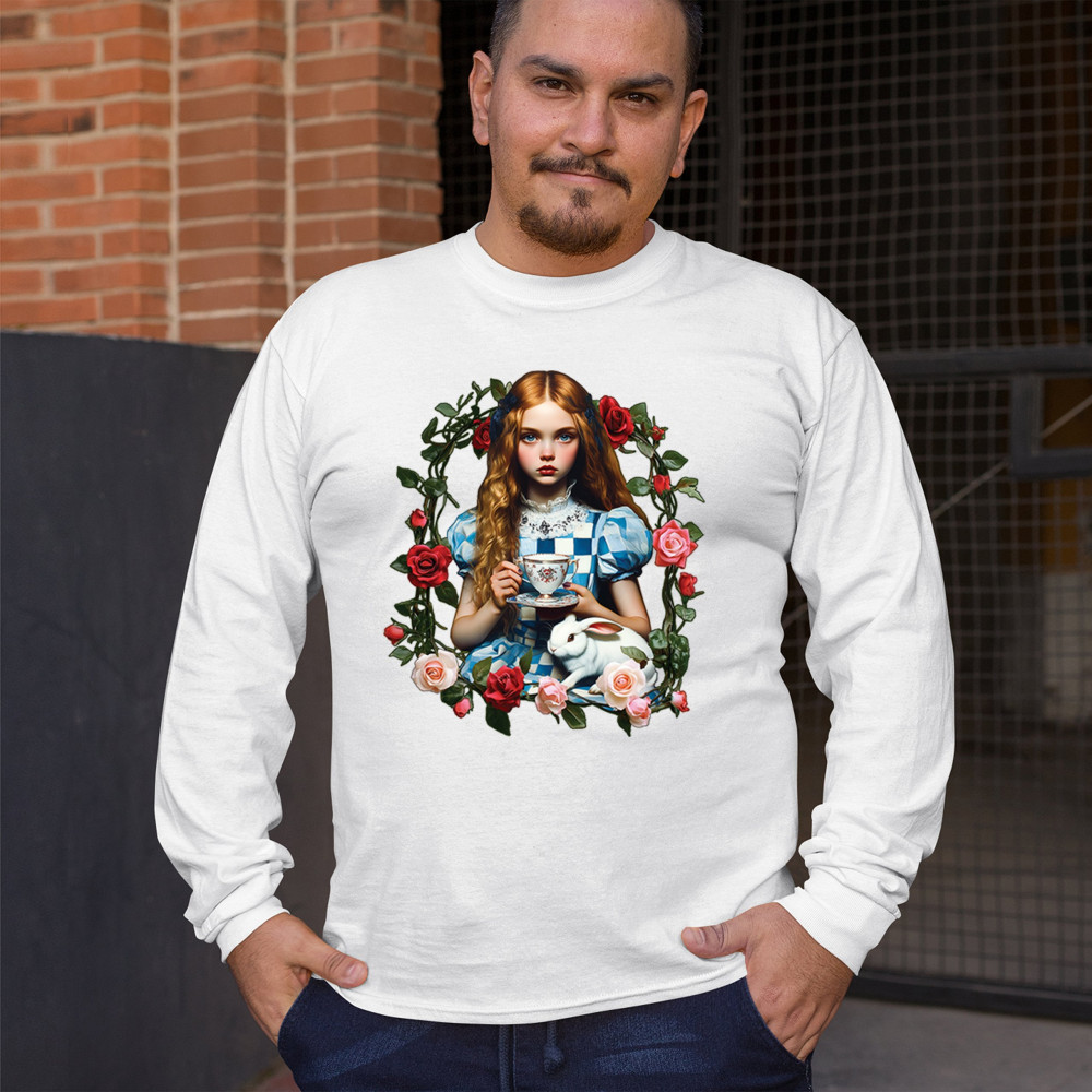 Step into a storybook dream with this Wonderland-inspired design featuring a young girl at a tea party with her white rabbit companion. Framed by roses, it evokes vintage charm, fantasy, and magical nostalgia. Ideal for bookworms, collectors, and lovers of fairytales, it blends whimsical elegance with timeless childhood wonder.