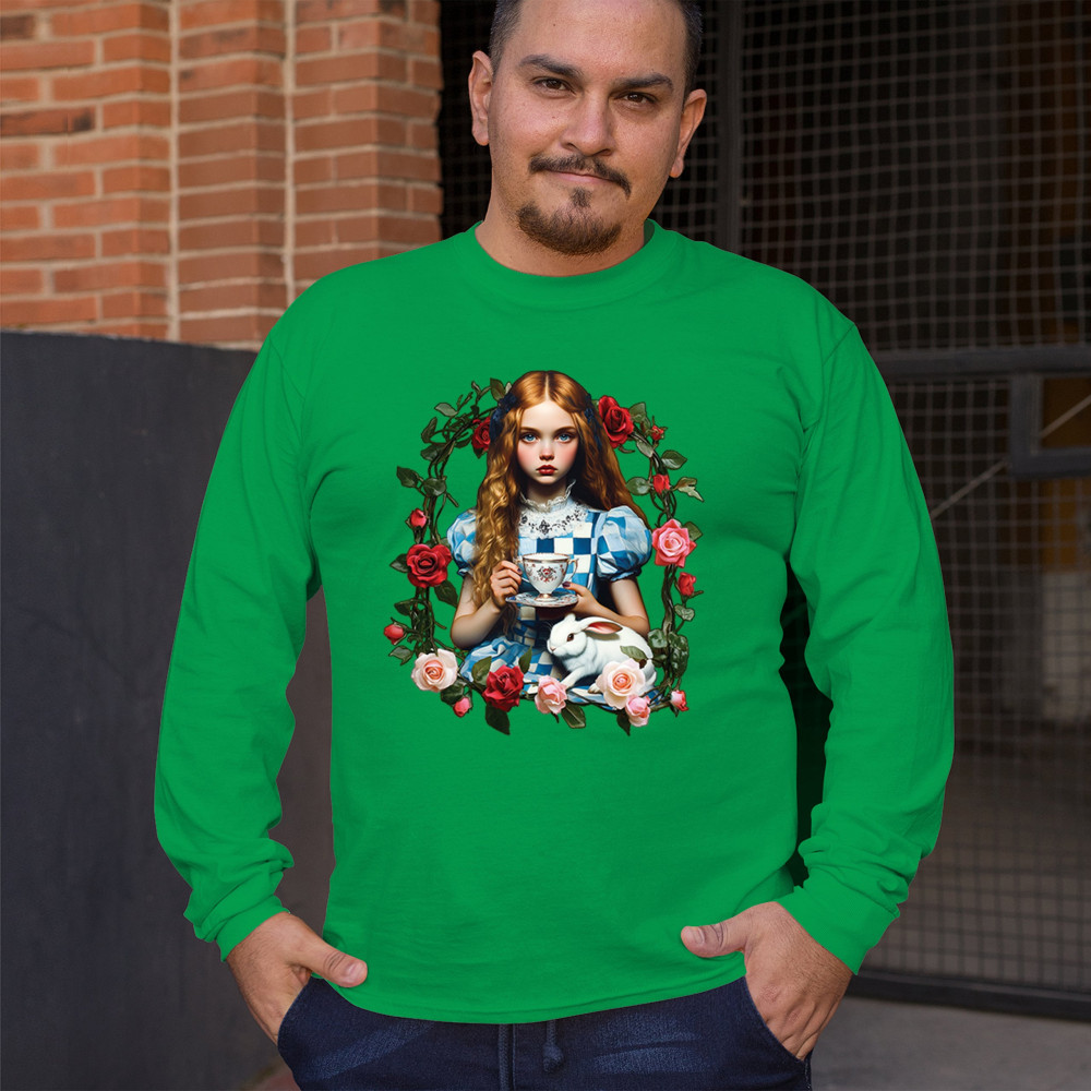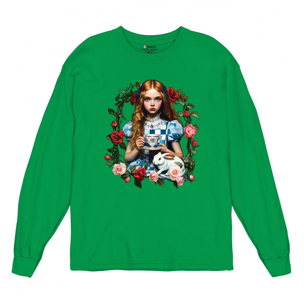 Step into a storybook dream with this Wonderland-inspired design featuring a young girl at a tea party with her white rabbit companion. Framed by roses, it evokes vintage charm, fantasy, and magical nostalgia. Ideal for bookworms, collectors, and lovers of fairytales, it blends whimsical elegance with timeless childhood wonder.