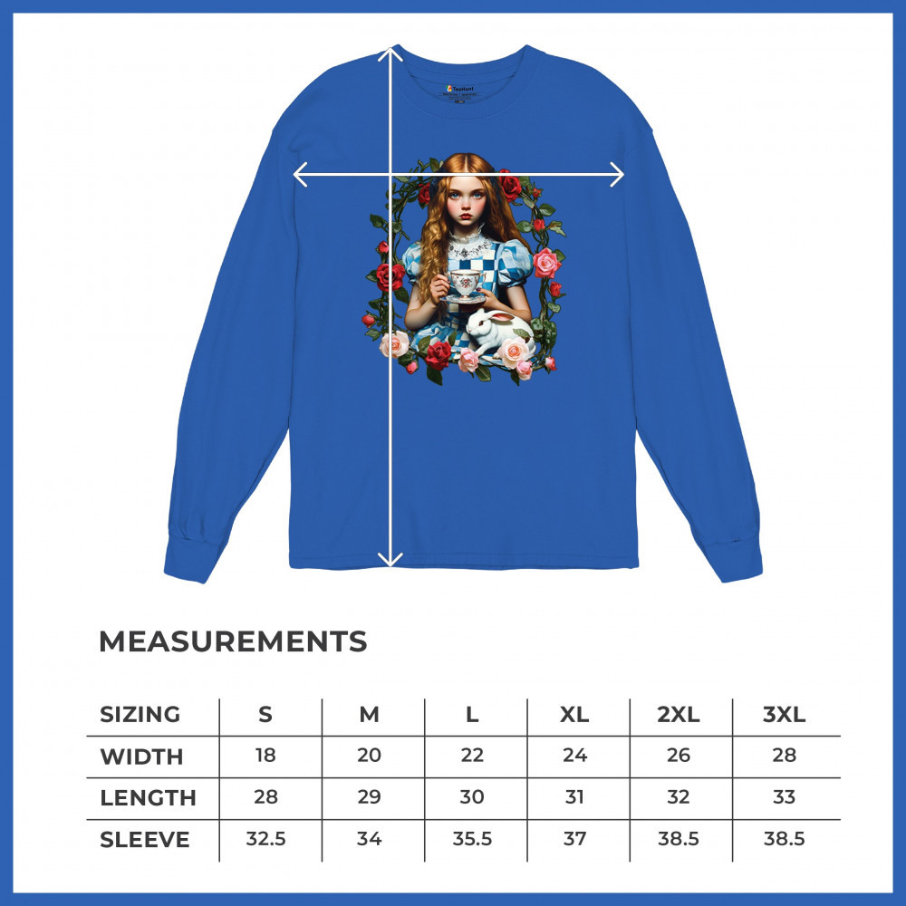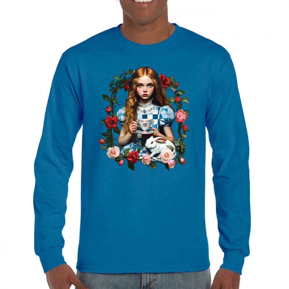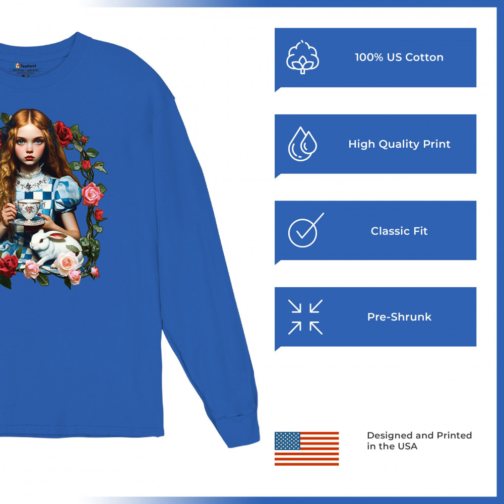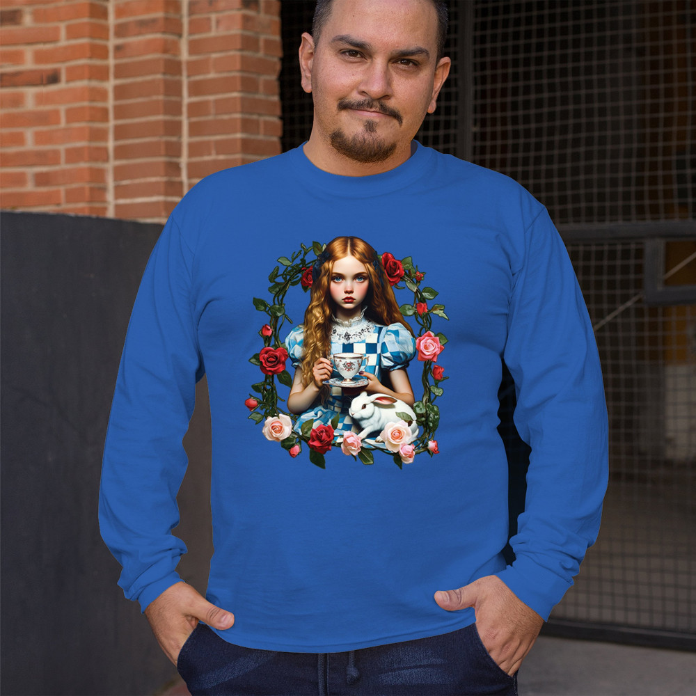 Step into a storybook dream with this Wonderland-inspired design featuring a young girl at a tea party with her white rabbit companion. Framed by roses, it evokes vintage charm, fantasy, and magical nostalgia. Ideal for bookworms, collectors, and lovers of fairytales, it blends whimsical elegance with timeless childhood wonder.