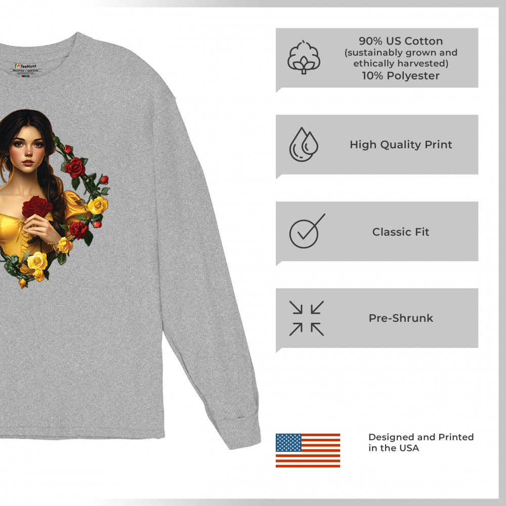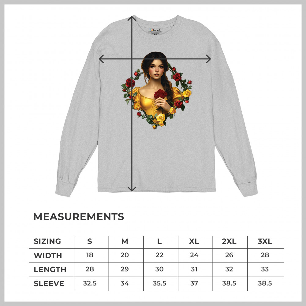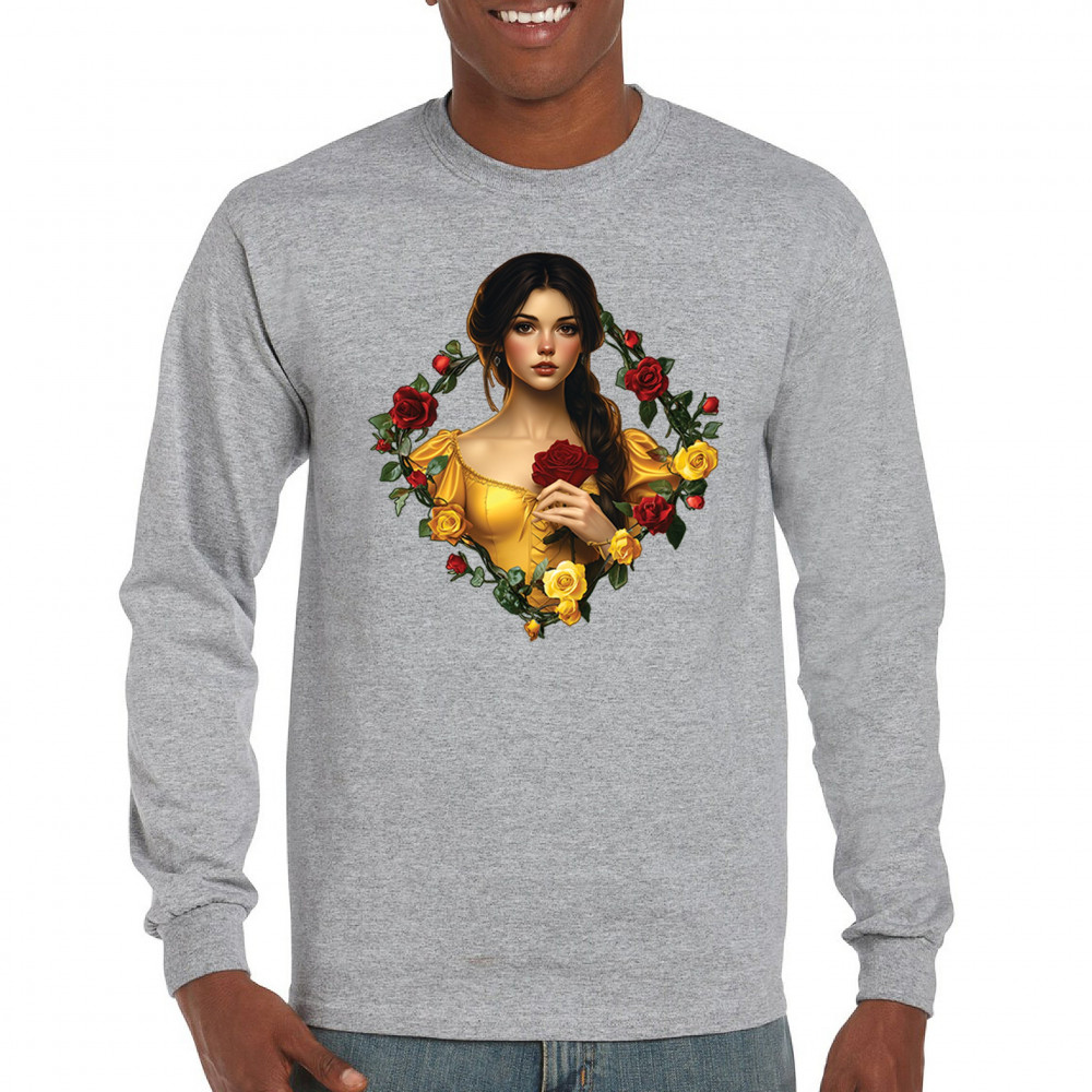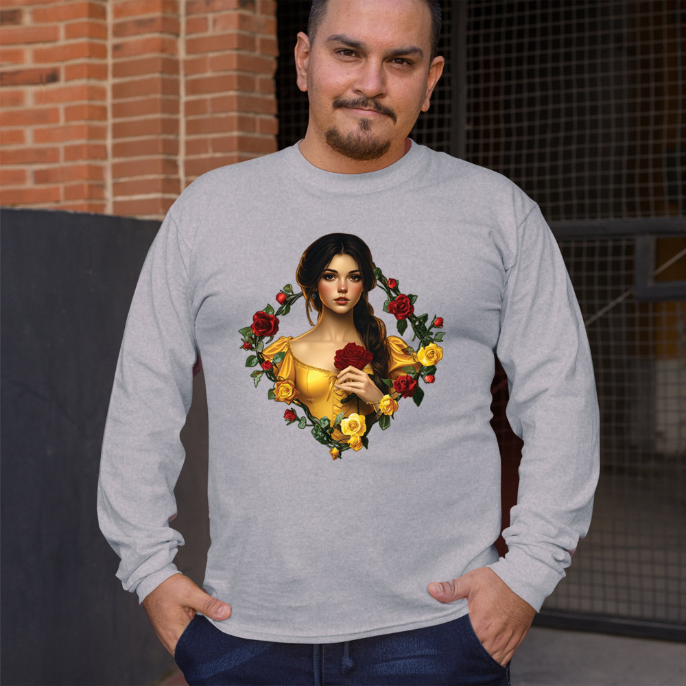 Inspired by classic fairytales, this design features a girl in a yellow gown holding a red rose, framed by rich red and yellow roses. A tribute to Beauty and the Beast, it radiates warmth, romance, and timeless fantasy. Perfect for storybook lovers, enchanted art collectors, or those drawn to magical, symbolic imagery filled with beauty and grace.