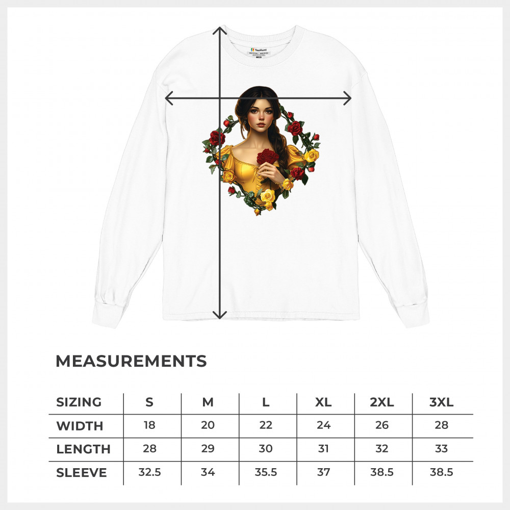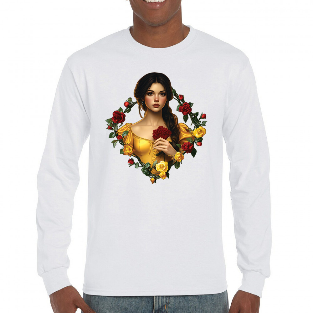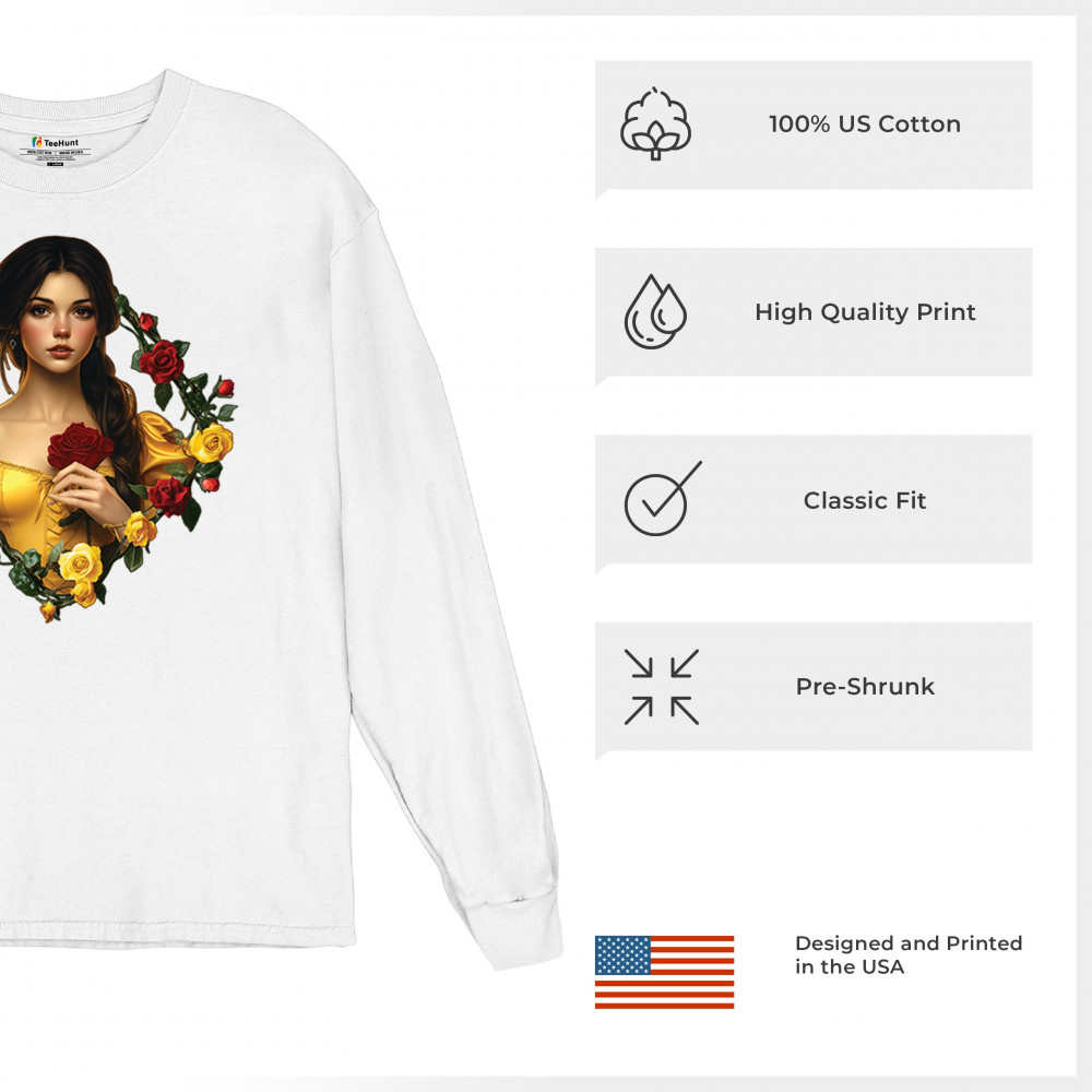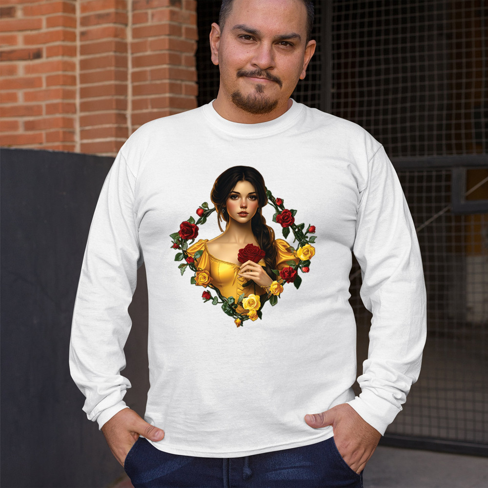 Inspired by classic fairytales, this design features a girl in a yellow gown holding a red rose, framed by rich red and yellow roses. A tribute to Beauty and the Beast, it radiates warmth, romance, and timeless fantasy. Perfect for storybook lovers, enchanted art collectors, or those drawn to magical, symbolic imagery filled with beauty and grace.