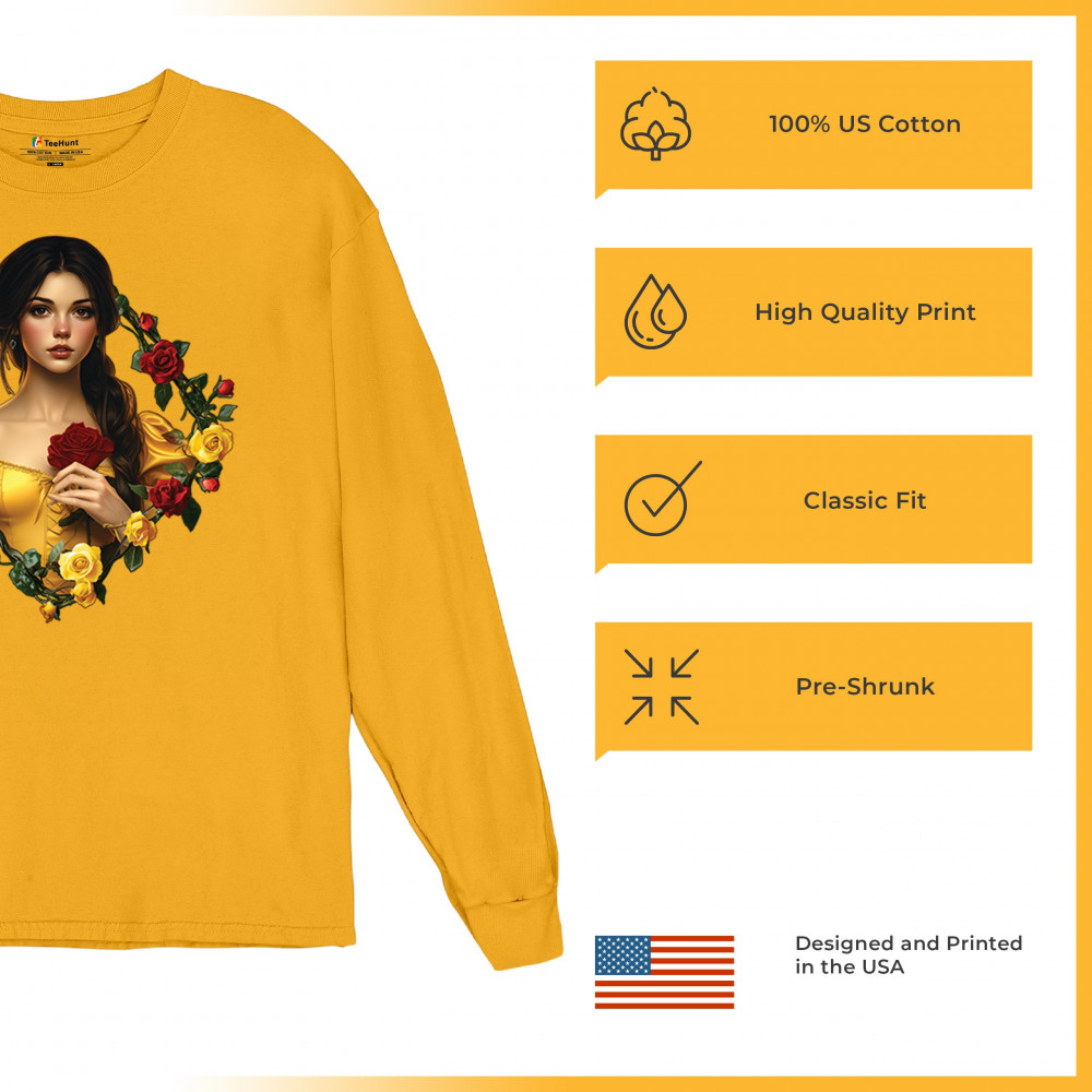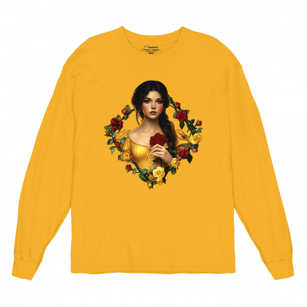 Inspired by classic fairytales, this design features a girl in a yellow gown holding a red rose, framed by rich red and yellow roses. A tribute to Beauty and the Beast, it radiates warmth, romance, and timeless fantasy. Perfect for storybook lovers, enchanted art collectors, or those drawn to magical, symbolic imagery filled with beauty and grace.