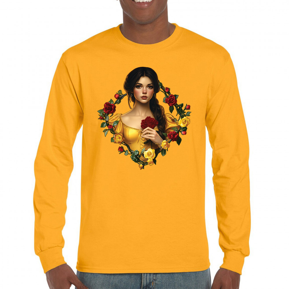 Romantic fantasy design of girl in yellow gown with red rose. Inspired by Beauty and the Beast, full of fairytale magic and classic charm.