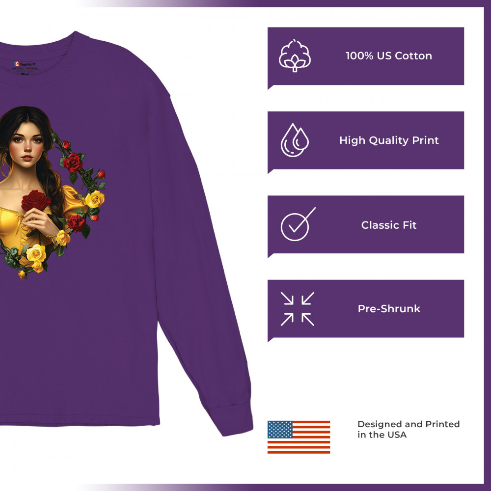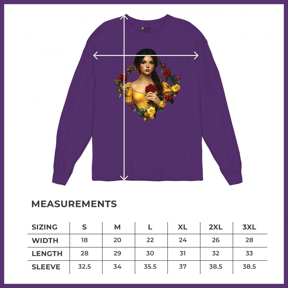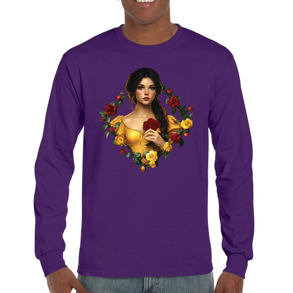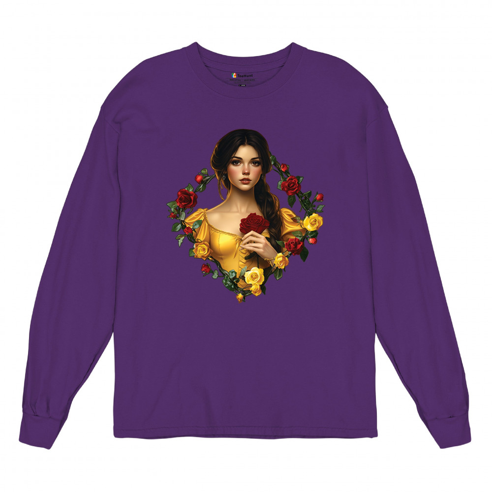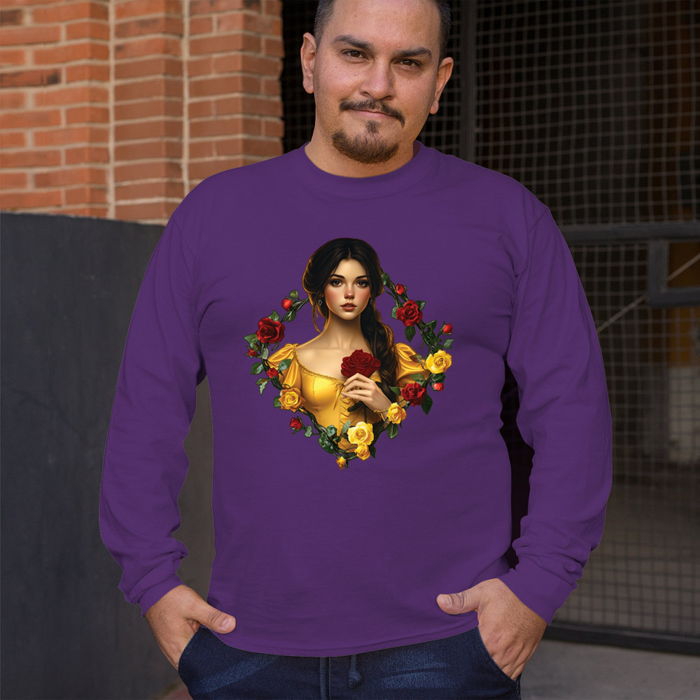Inspired by classic fairytales, this design features a girl in a yellow gown holding a red rose, framed by rich red and yellow roses. A tribute to Beauty and the Beast, it radiates warmth, romance, and timeless fantasy. Perfect for storybook lovers, enchanted art collectors, or those drawn to magical, symbolic imagery filled with beauty and grace.