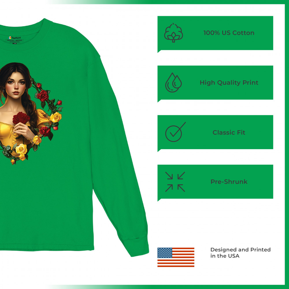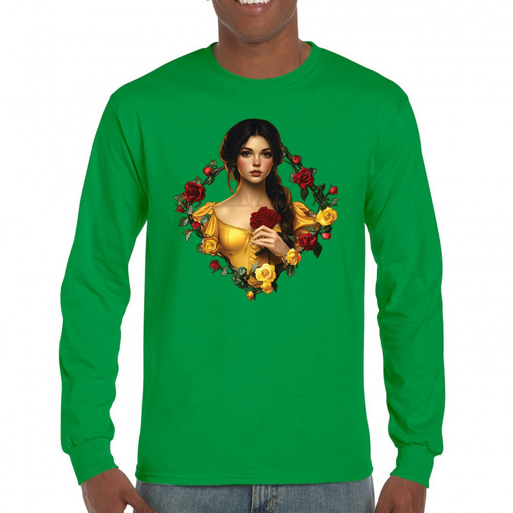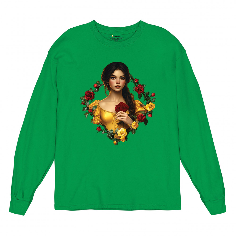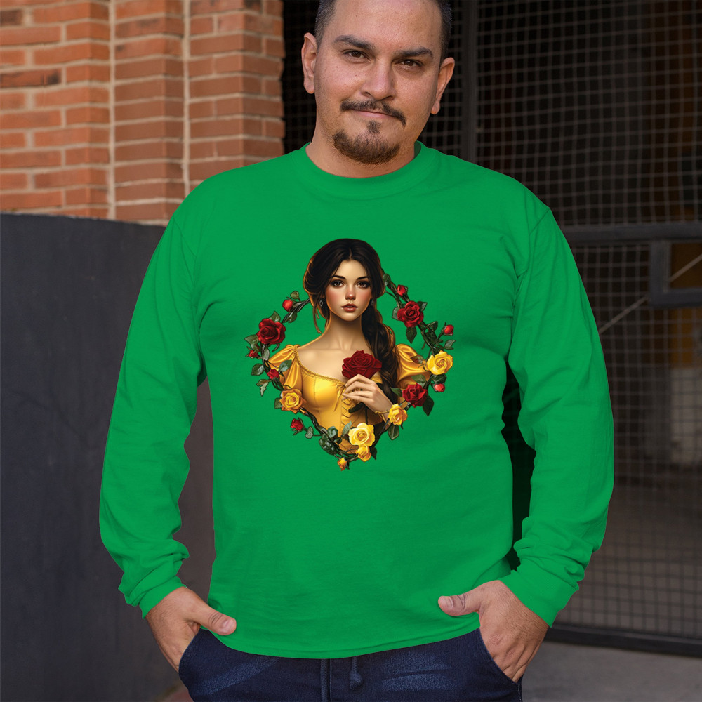 Inspired by classic fairytales, this design features a girl in a yellow gown holding a red rose, framed by rich red and yellow roses. A tribute to Beauty and the Beast, it radiates warmth, romance, and timeless fantasy. Perfect for storybook lovers, enchanted art collectors, or those drawn to magical, symbolic imagery filled with beauty and grace.