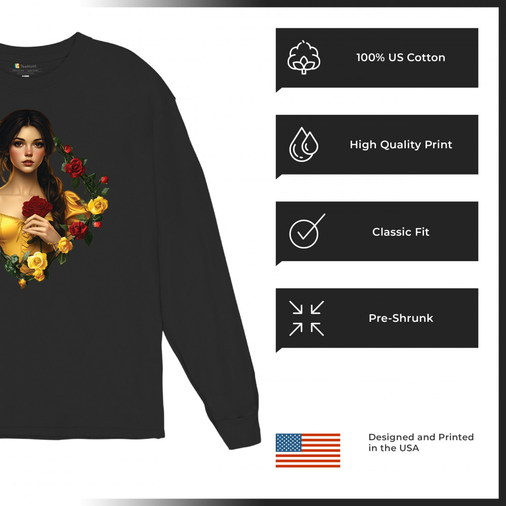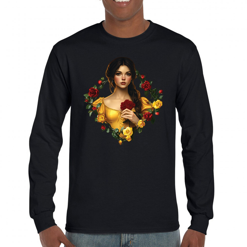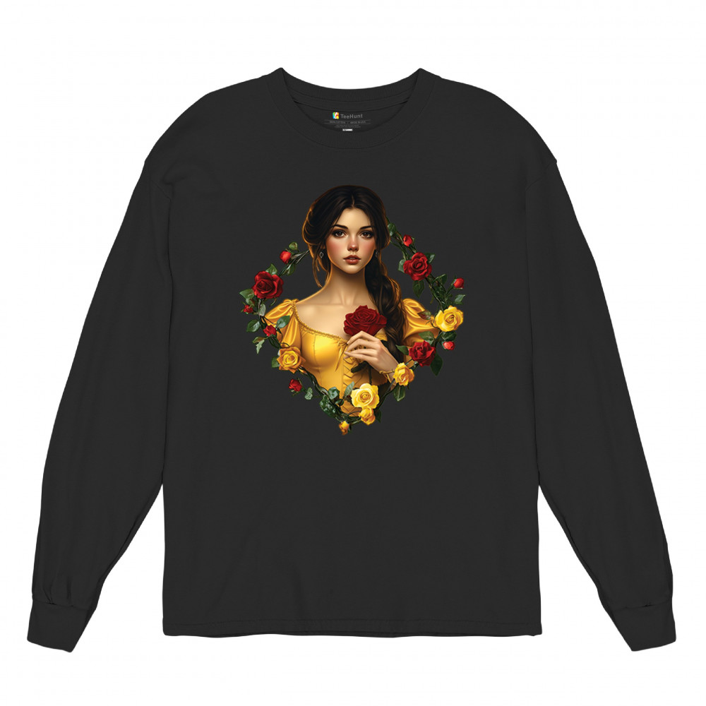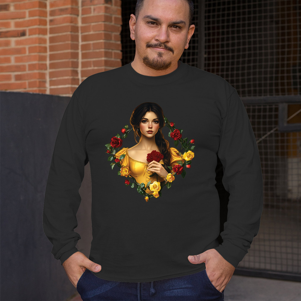 Inspired by classic fairytales, this design features a girl in a yellow gown holding a red rose, framed by rich red and yellow roses. A tribute to Beauty and the Beast, it radiates warmth, romance, and timeless fantasy. Perfect for storybook lovers, enchanted art collectors, or those drawn to magical, symbolic imagery filled with beauty and grace.