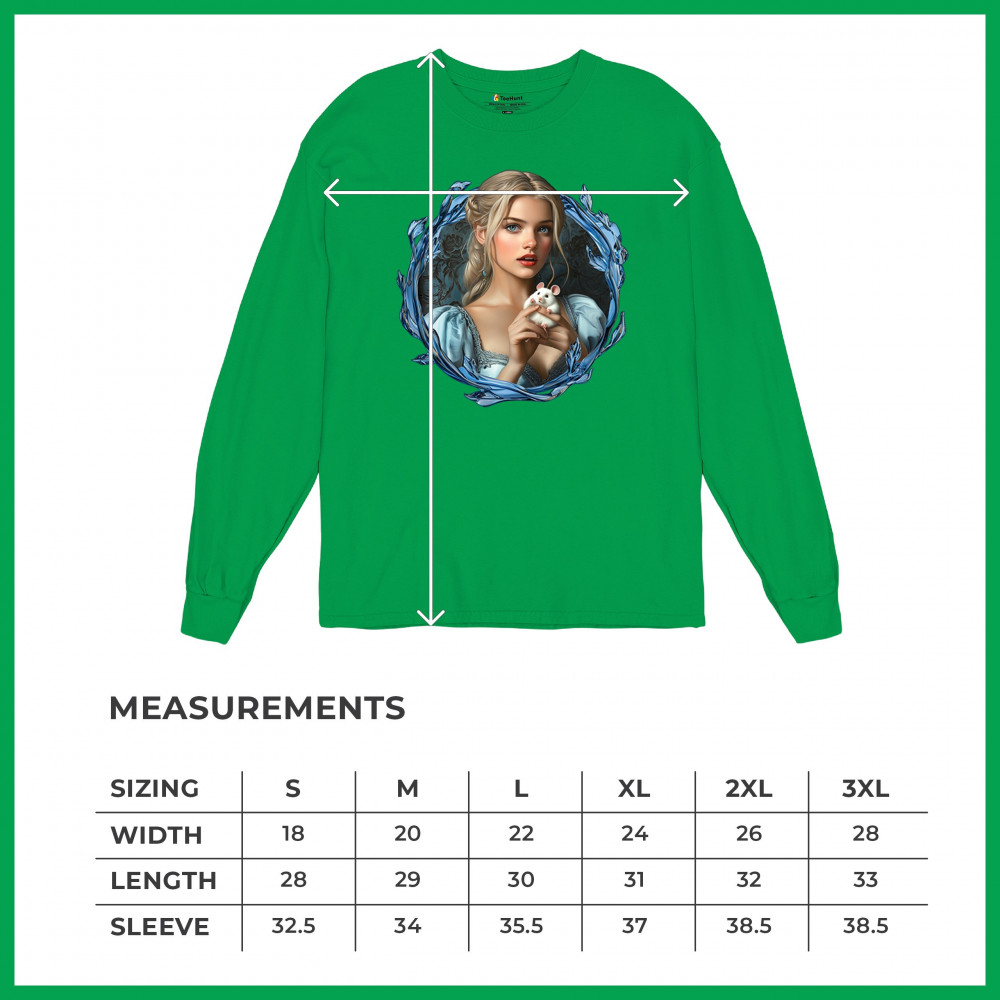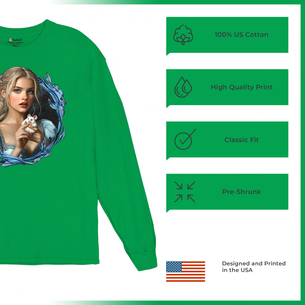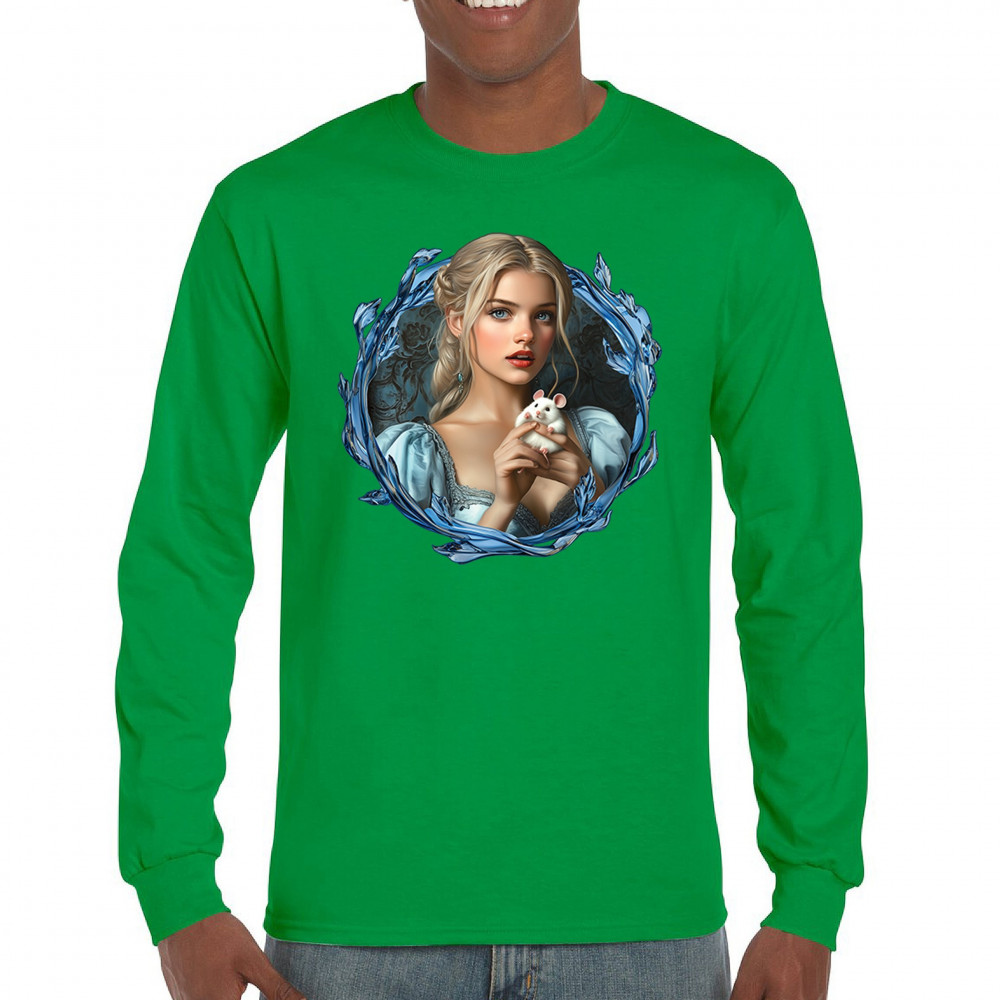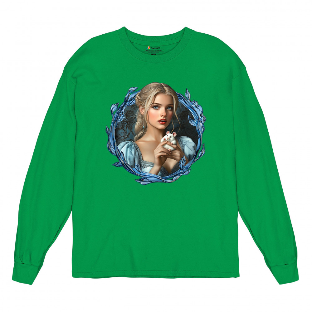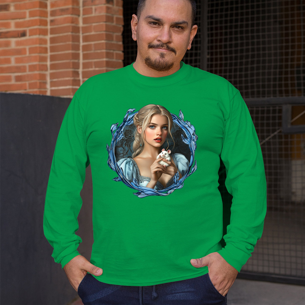 A whimsical design inspired by fairytales and Cinderella magic, featuring a blonde girl in a blue dress holding a white mouse. The icy blue leaf frame evokes enchantment and transformation. With soft, vintage tones and a dreamy feel, it’s a charming tribute to kindness, fantasy, animal companionship, and gentle storytelling magic.