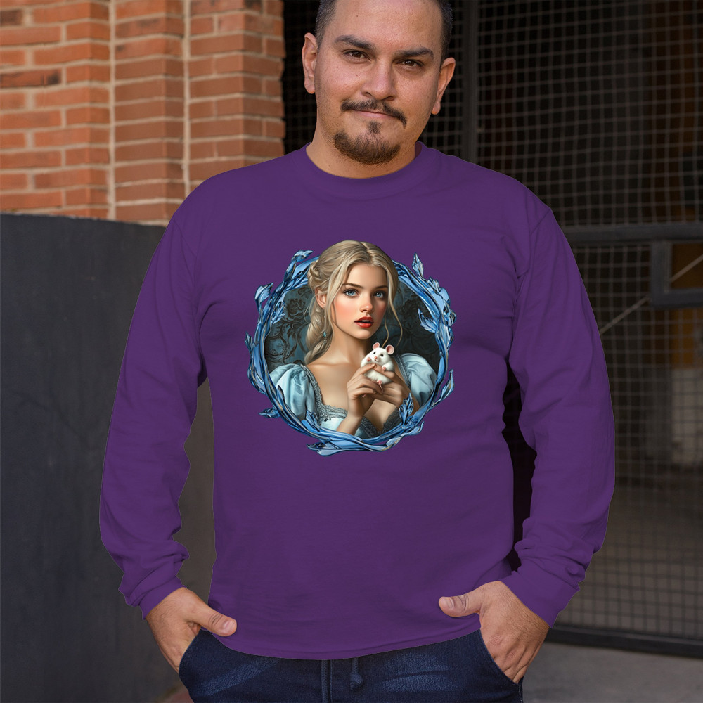 A whimsical design inspired by fairytales and Cinderella magic, featuring a blonde girl in a blue dress holding a white mouse. The icy blue leaf frame evokes enchantment and transformation. With soft, vintage tones and a dreamy feel, it’s a charming tribute to kindness, fantasy, animal companionship, and gentle storytelling magic.