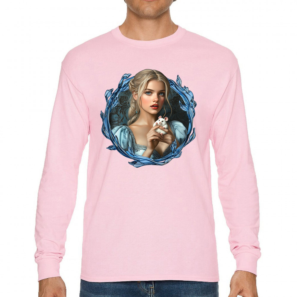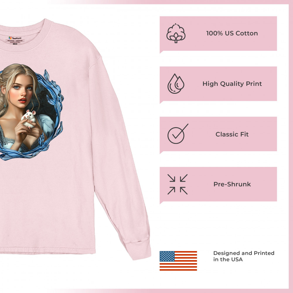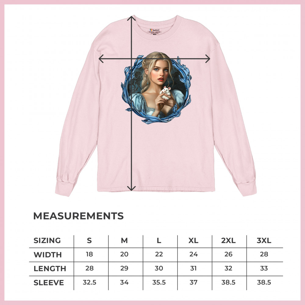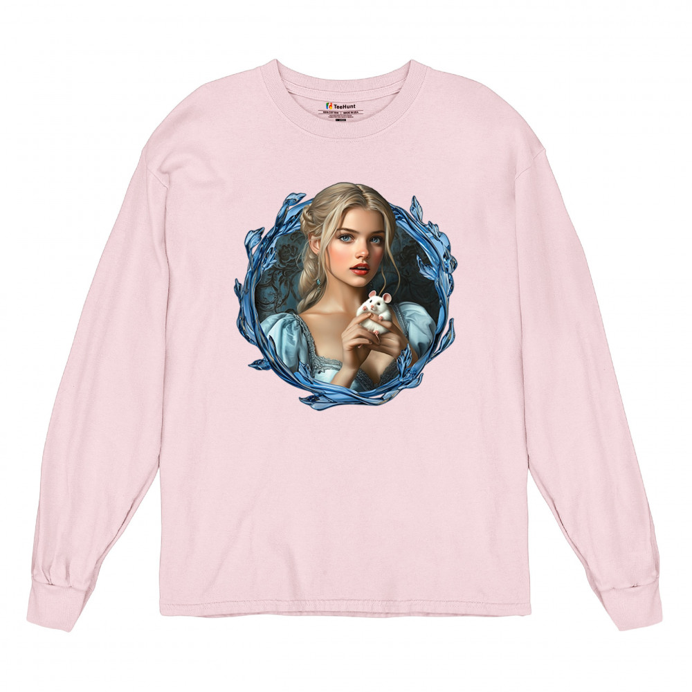 A whimsical design inspired by fairytales and Cinderella magic, featuring a blonde girl in a blue dress holding a white mouse. The icy blue leaf frame evokes enchantment and transformation. With soft, vintage tones and a dreamy feel, it’s a charming tribute to kindness, fantasy, animal companionship, and gentle storytelling magic.