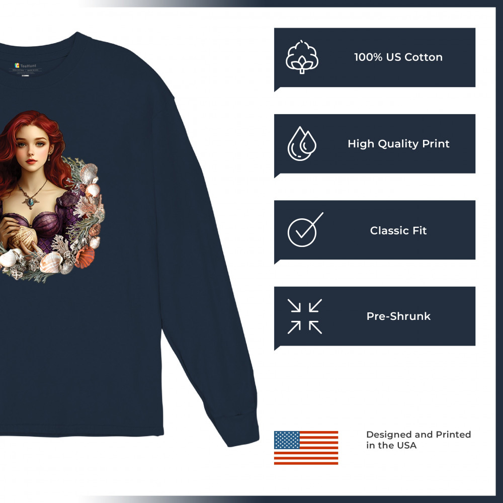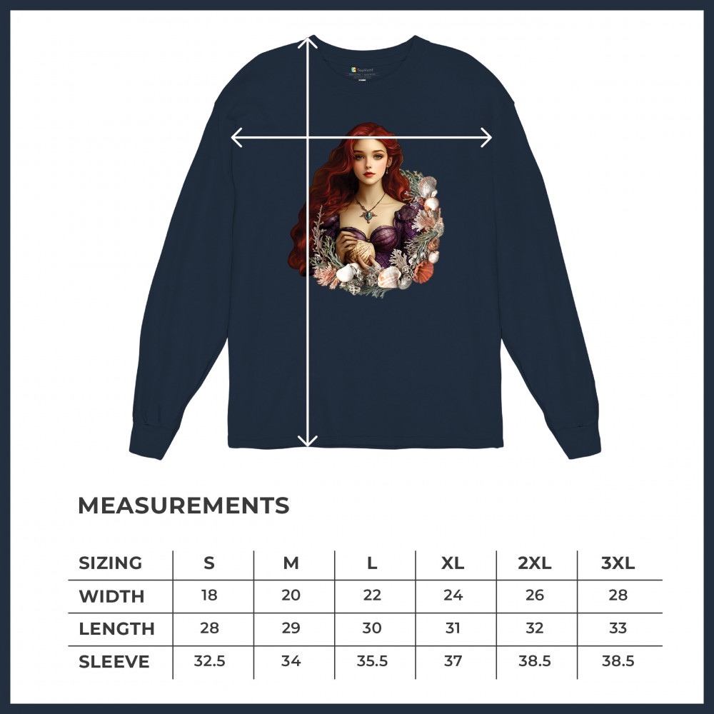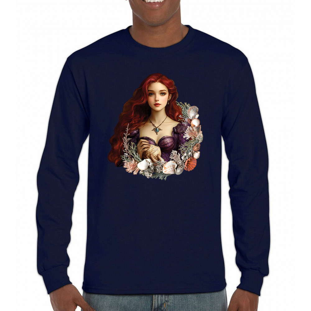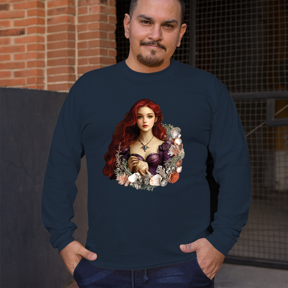 Inspired by mystical ocean themes, this design features a fantasy red-haired girl in a seashell dress, cradling a large shell. She is framed by coral, seaweed, and a shimmering array of ocean shells. With nods to classic mermaid lore and fairytale storytelling, it's perfect for fans of fantasy creatures, marine magic, and romantic ocean legends.