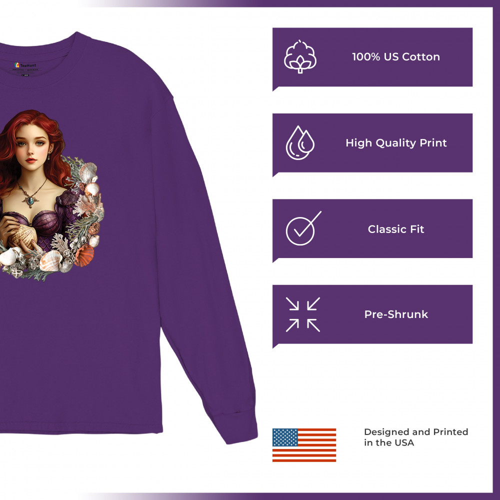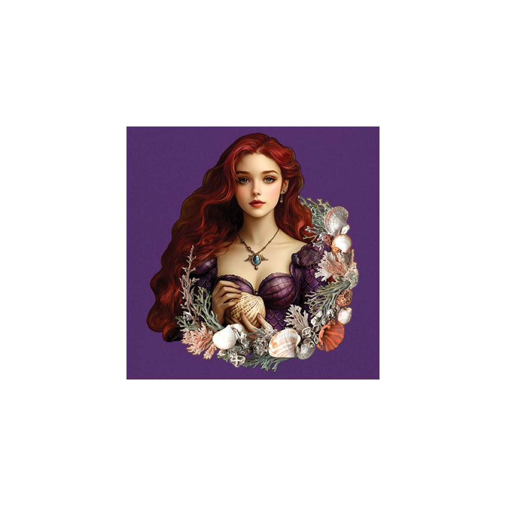 Inspired by mystical ocean themes, this design features a fantasy red-haired girl in a seashell dress, cradling a large shell. She is framed by coral, seaweed, and a shimmering array of ocean shells. With nods to classic mermaid lore and fairytale storytelling, it's perfect for fans of fantasy creatures, marine magic, and romantic ocean legends.