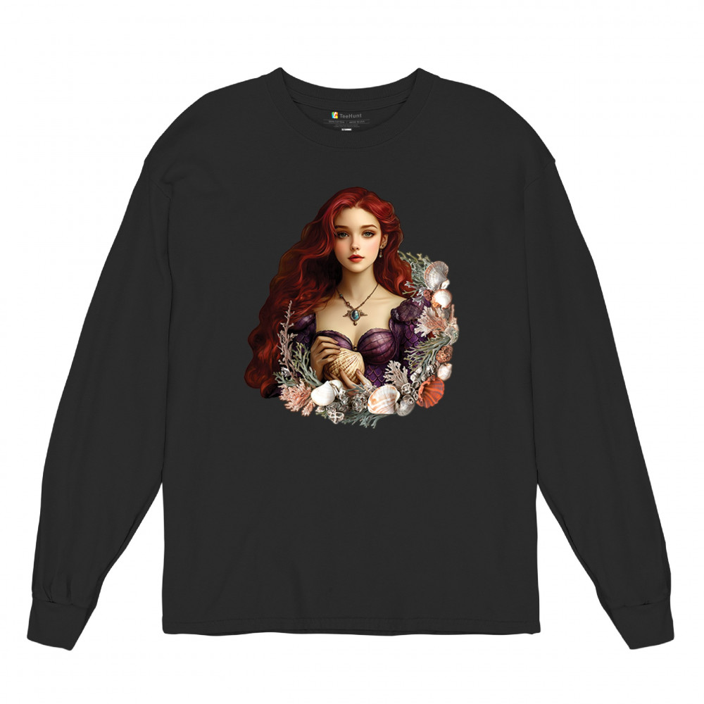 Inspired by mystical ocean themes, this design features a fantasy red-haired girl in a seashell dress, cradling a large shell. She is framed by coral, seaweed, and a shimmering array of ocean shells. With nods to classic mermaid lore and fairytale storytelling, it's perfect for fans of fantasy creatures, marine magic, and romantic ocean legends.