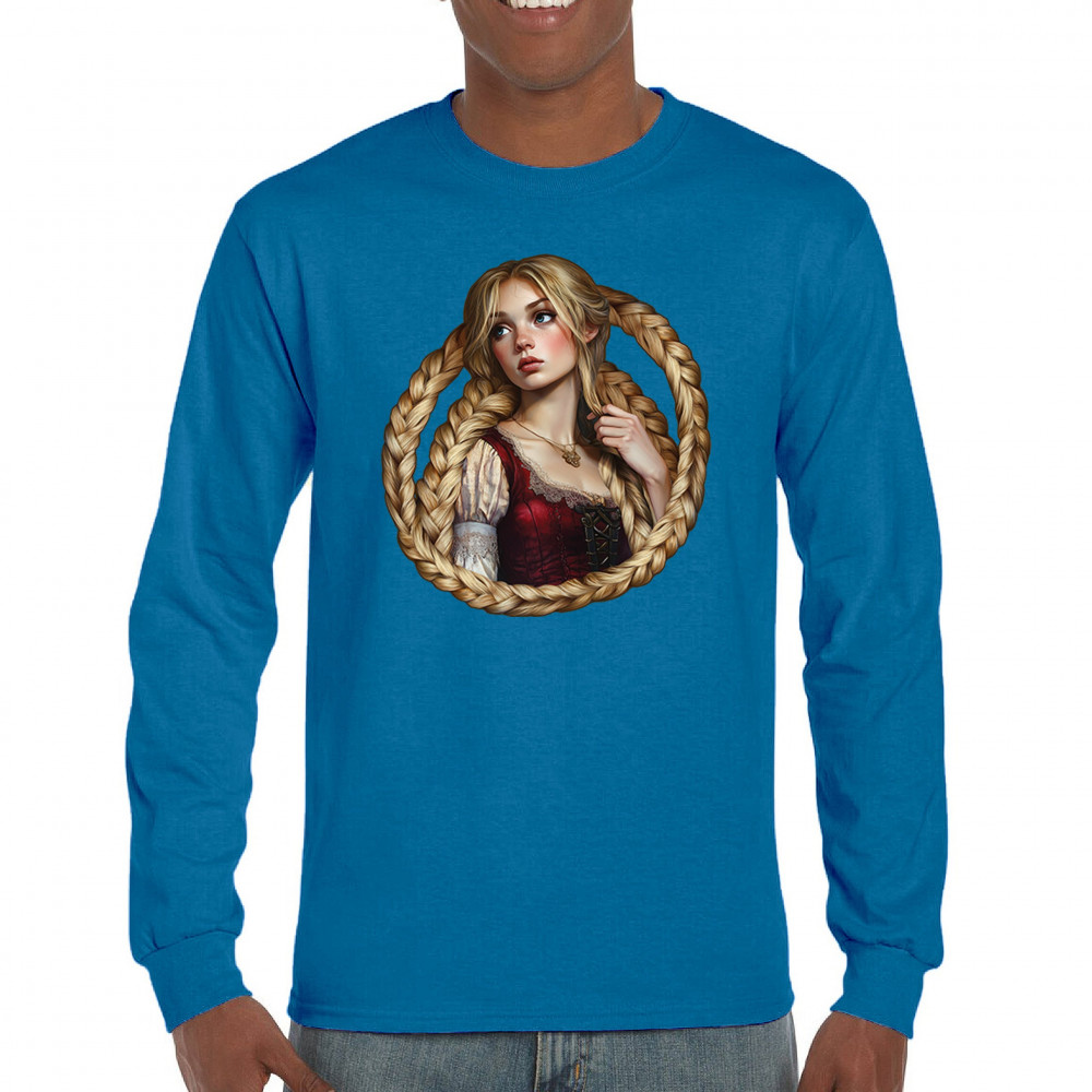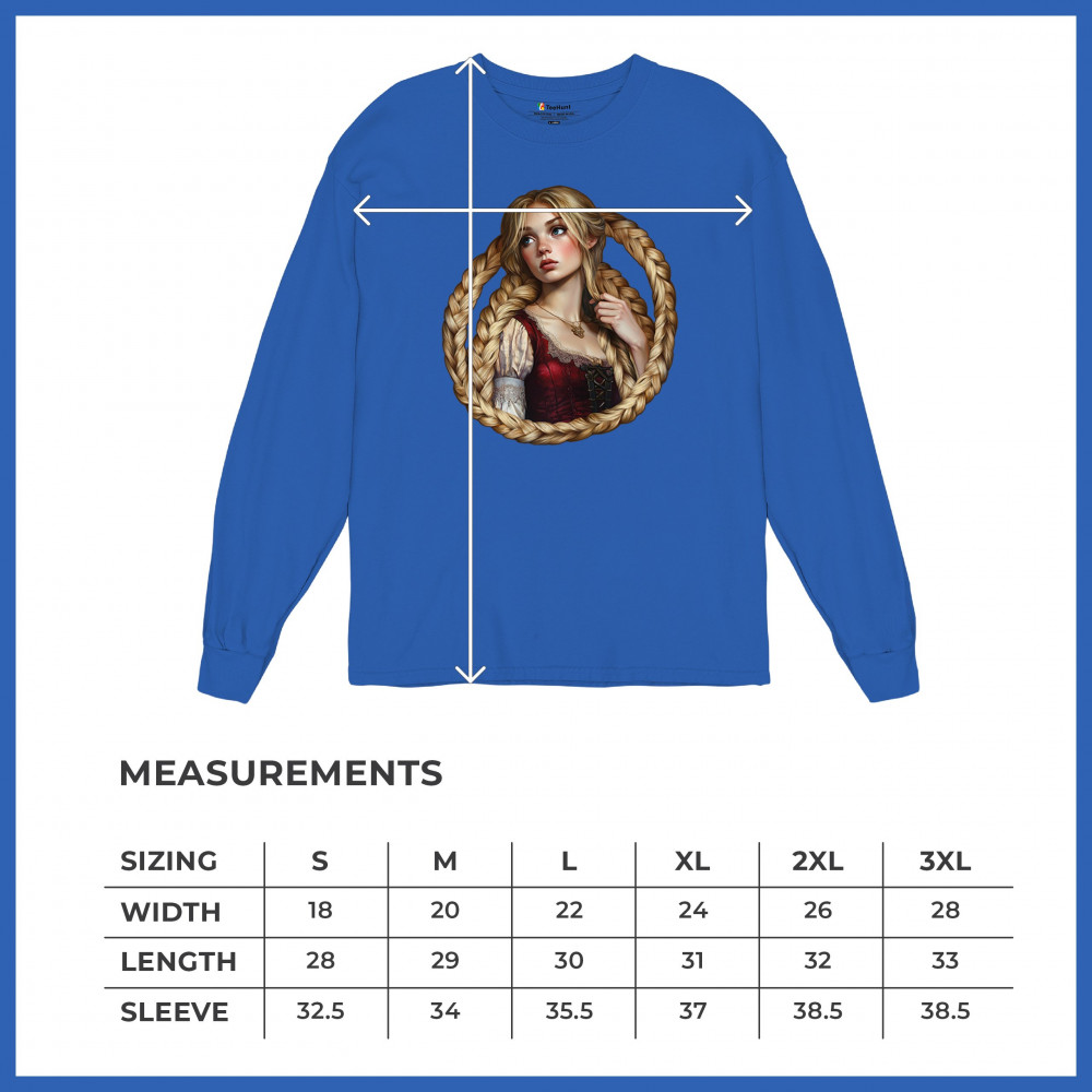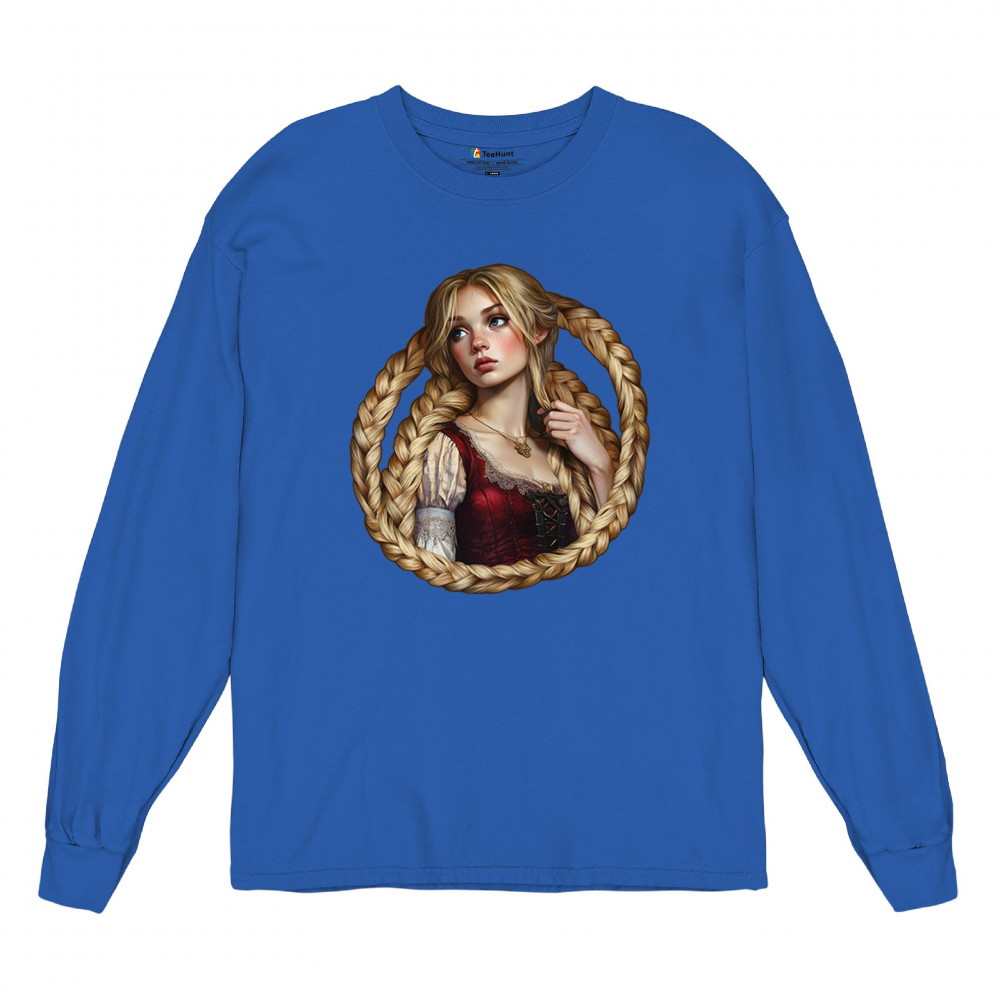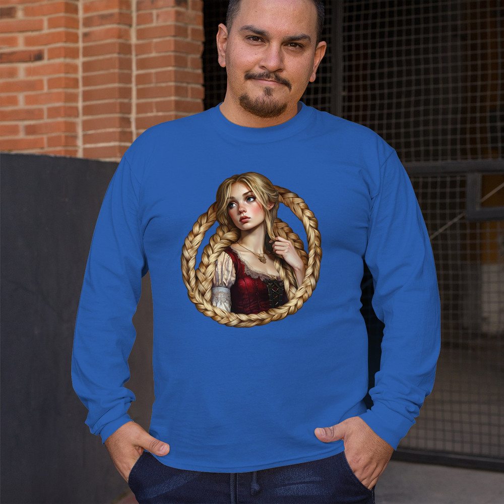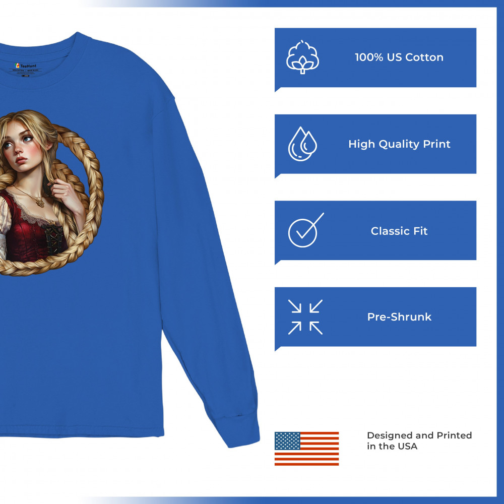 A dreamy design featuring a blonde girl with long braided hair encircling her like a frame. With vintage dress details and a wistful look, this artwork channels the essence of fairytales, romantic legends, and gentle feminine power. Ideal for fantasy lovers, folklore fans, and collectors of magical storybook themes.