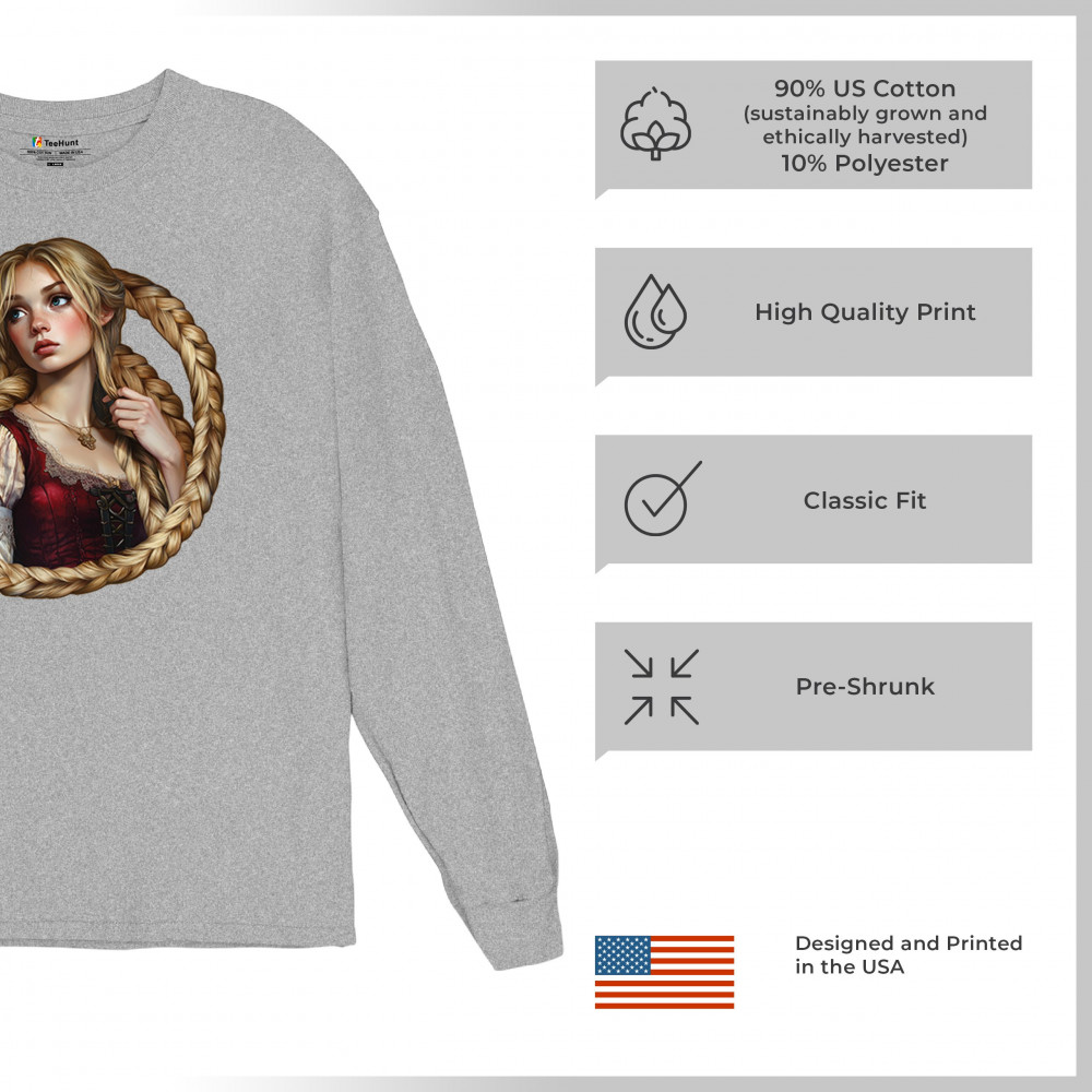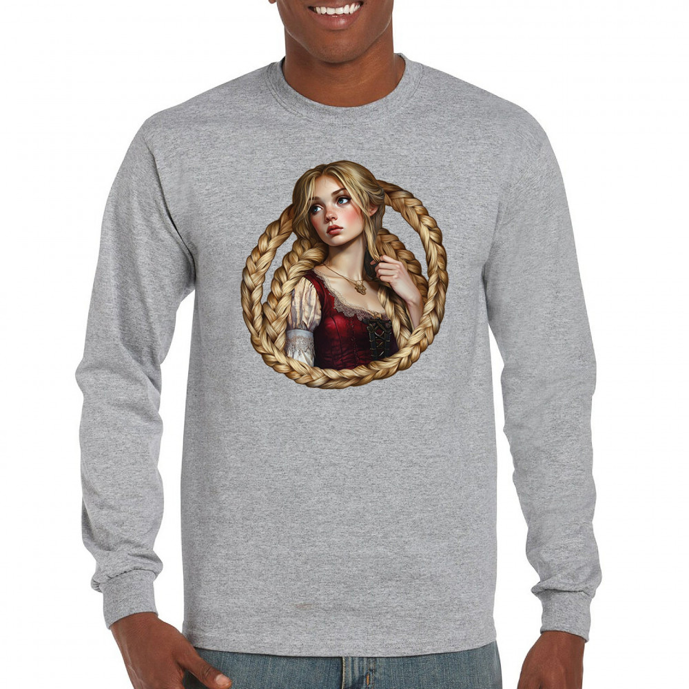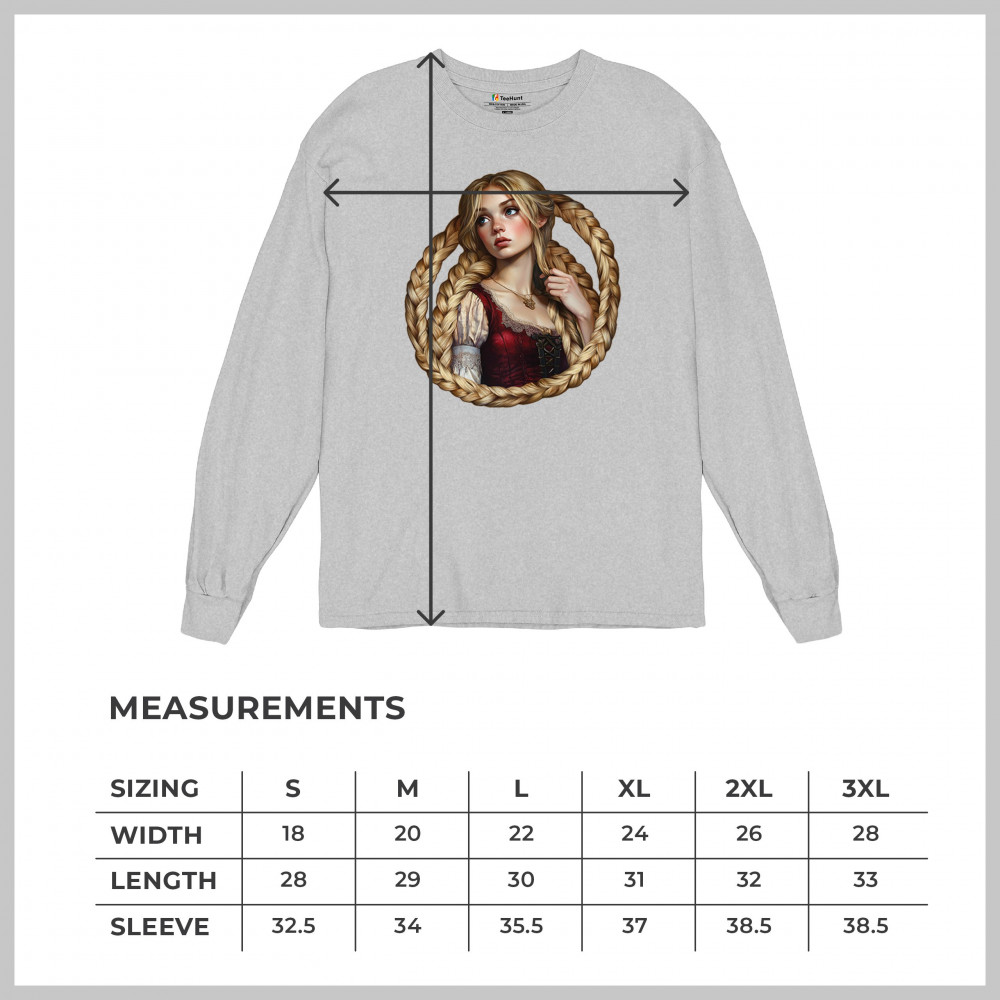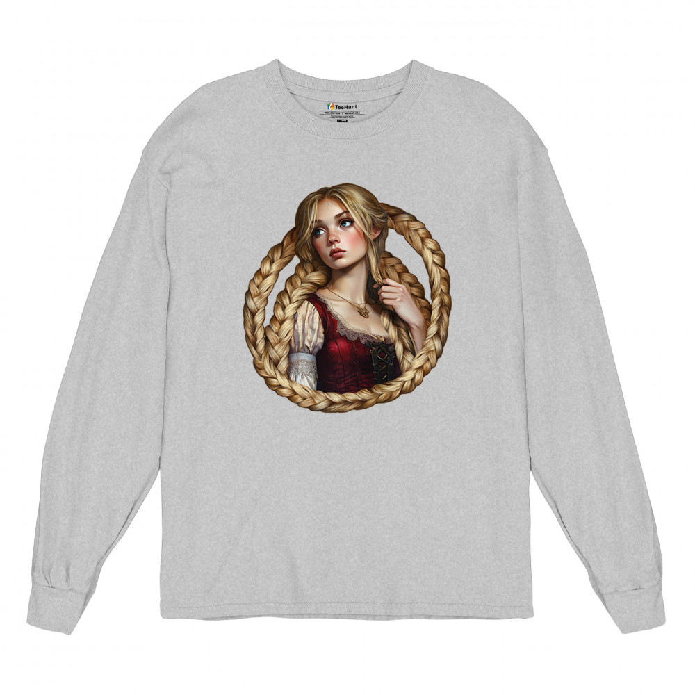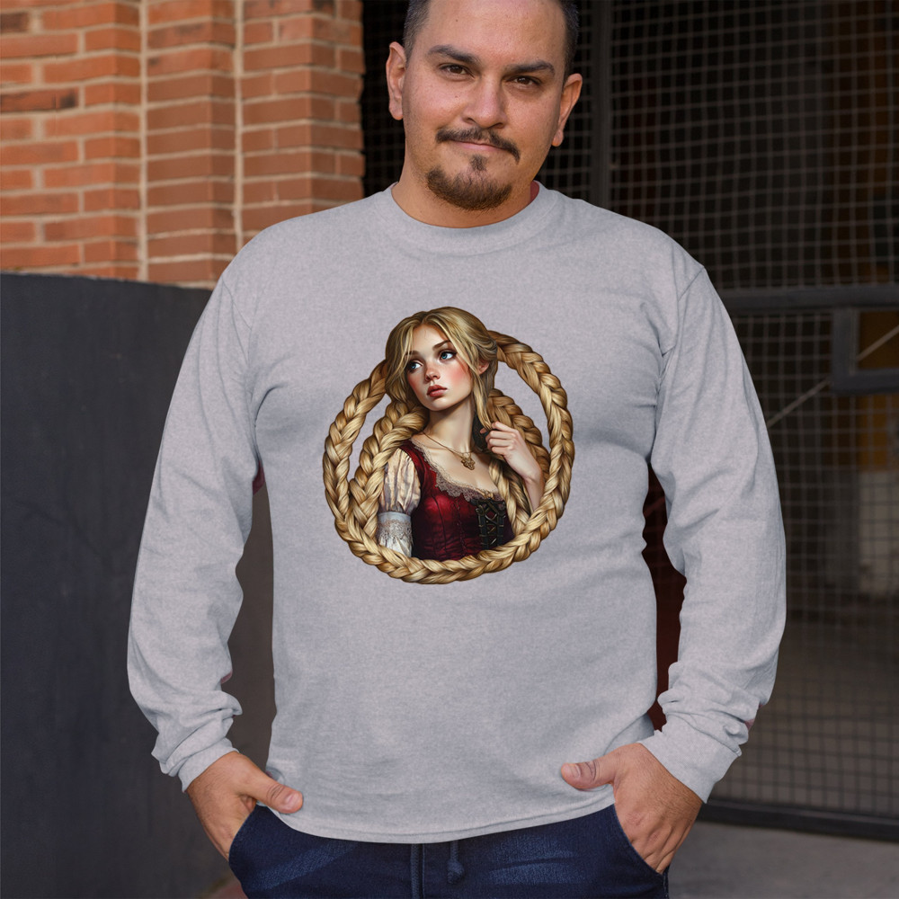 A dreamy design featuring a blonde girl with long braided hair encircling her like a frame. With vintage dress details and a wistful look, this artwork channels the essence of fairytales, romantic legends, and gentle feminine power. Ideal for fantasy lovers, folklore fans, and collectors of magical storybook themes.