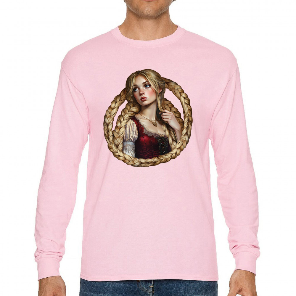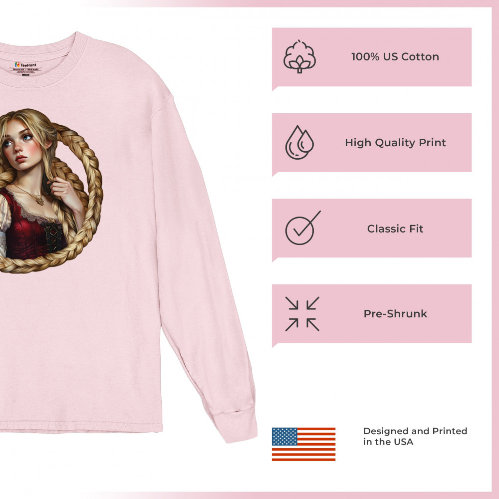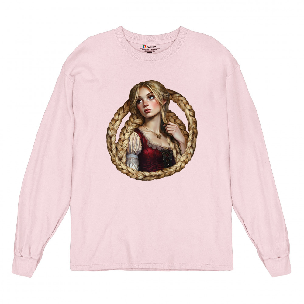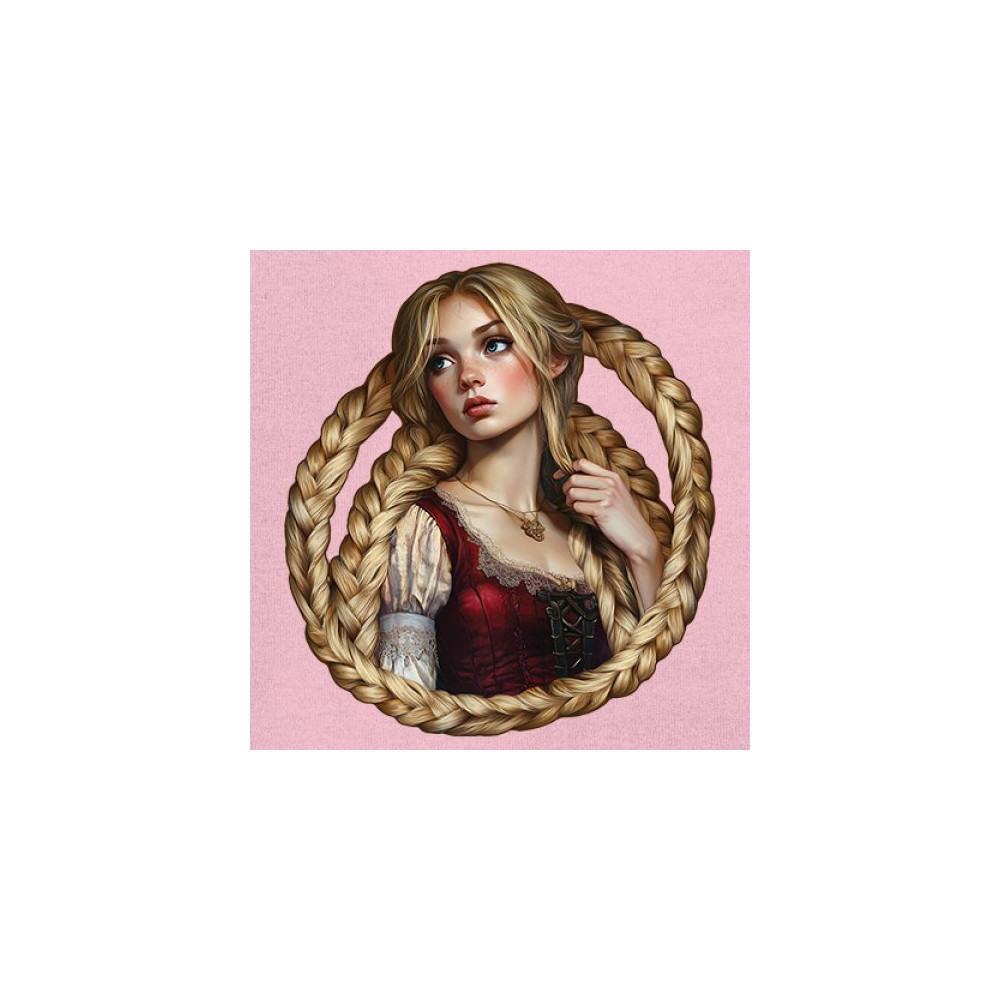 A dreamy design featuring a blonde girl with long braided hair encircling her like a frame. With vintage dress details and a wistful look, this artwork channels the essence of fairytales, romantic legends, and gentle feminine power. Ideal for fantasy lovers, folklore fans, and collectors of magical storybook themes.