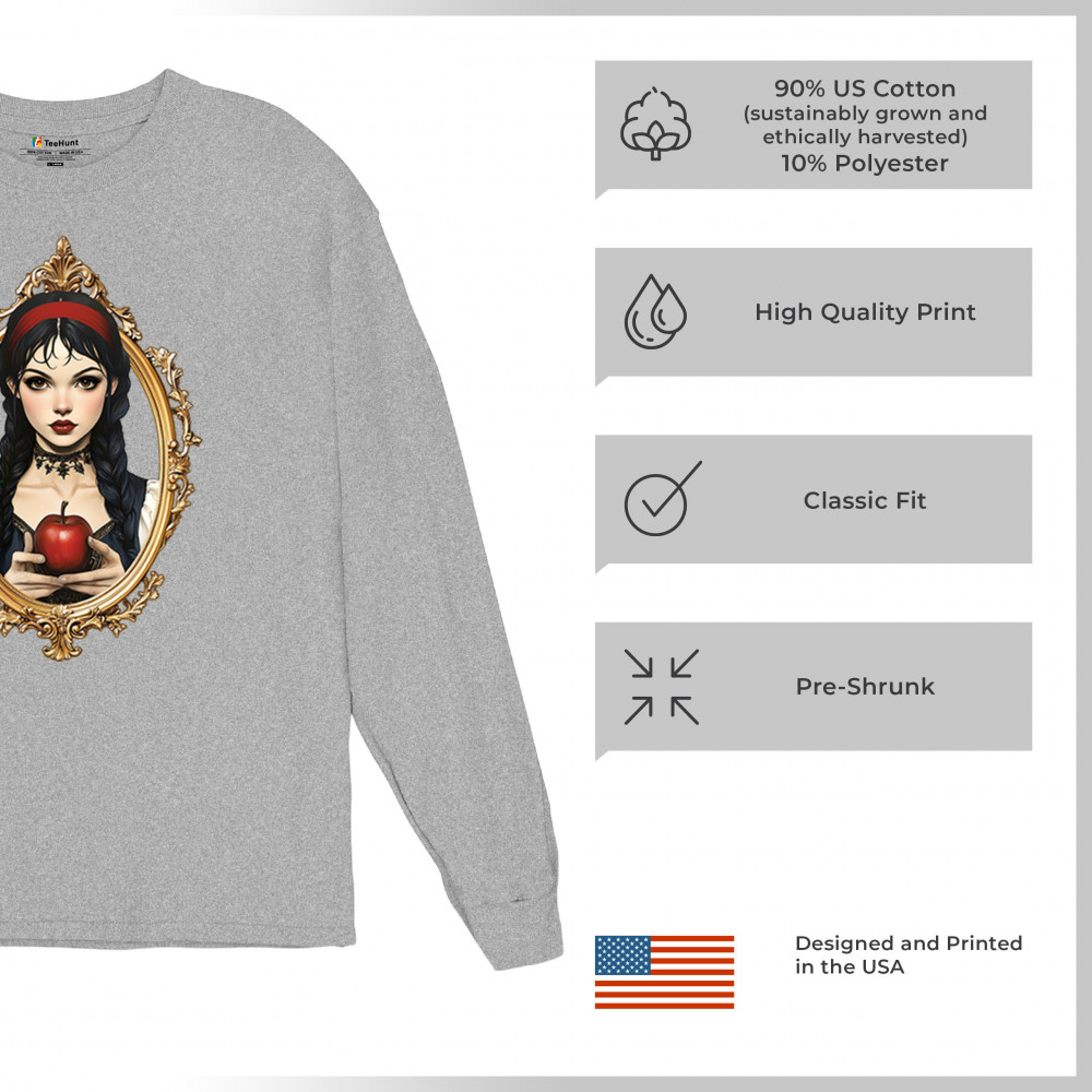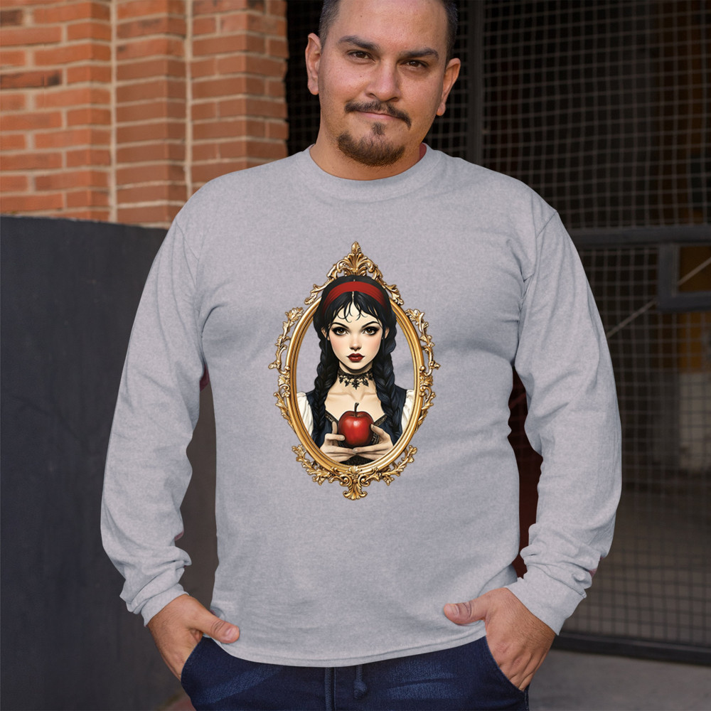 Dark fairytale design with red apple, gold frame, and Snow White vibes. A dreamy blend of fantasy, gothic style, and magical storytelling.
