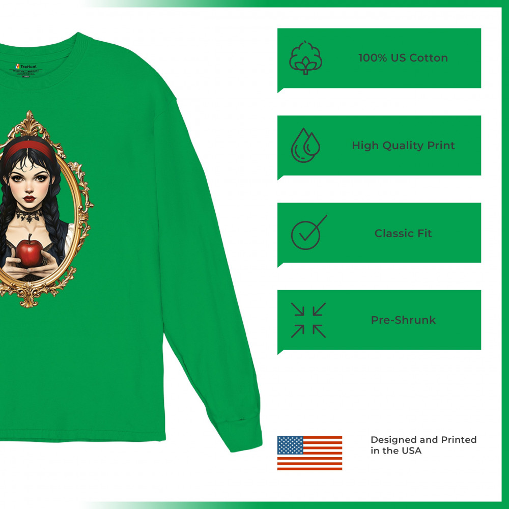 Dark fairytale design with red apple, gold frame, and Snow White vibes. A dreamy blend of fantasy, gothic style, and magical storytelling.