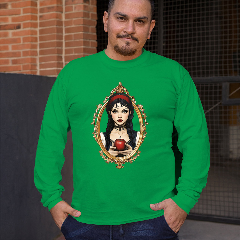 This enchanting design brings to life a gothic-inspired girl holding a red apple, encased in a regal vintage mirror frame. With elements pulled from Snow White, fairytales, and fantasy symbolism, it blends innocence and temptation with dark romanticism. Perfect for dreamers, collectors, and lovers of magical narratives and visual elegance.