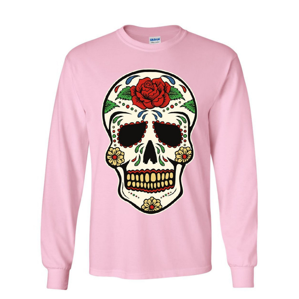 SUGAR SKULL CALAVERA DIA DE LOS MUERTOS sugar skull calavera long sleeve t-shirt dia de los muertos day of the dead tee light pink