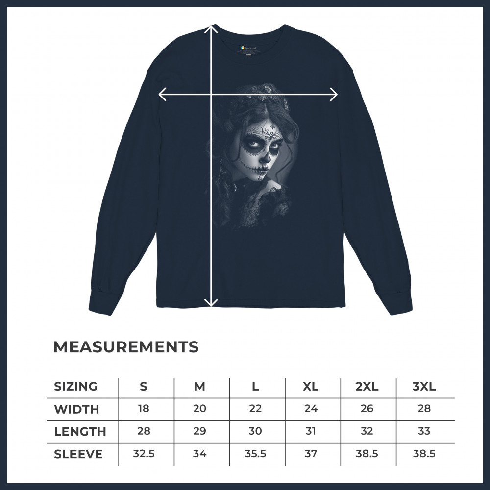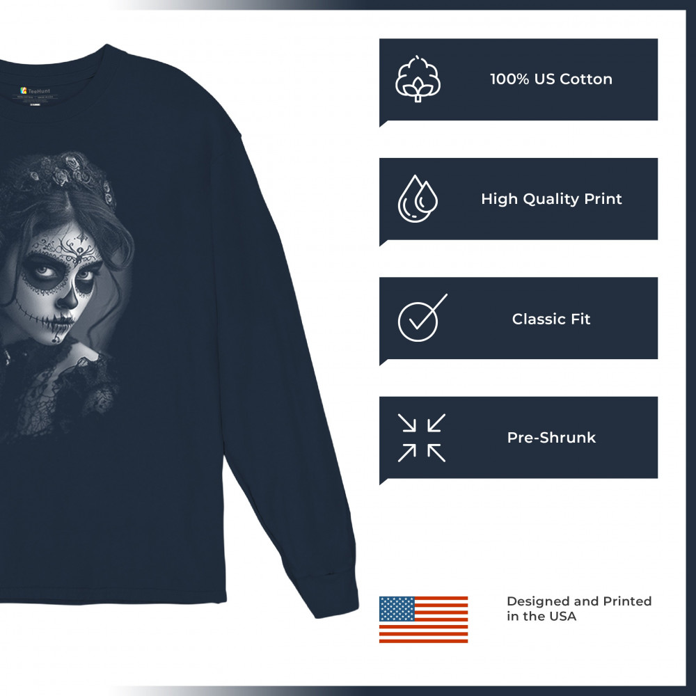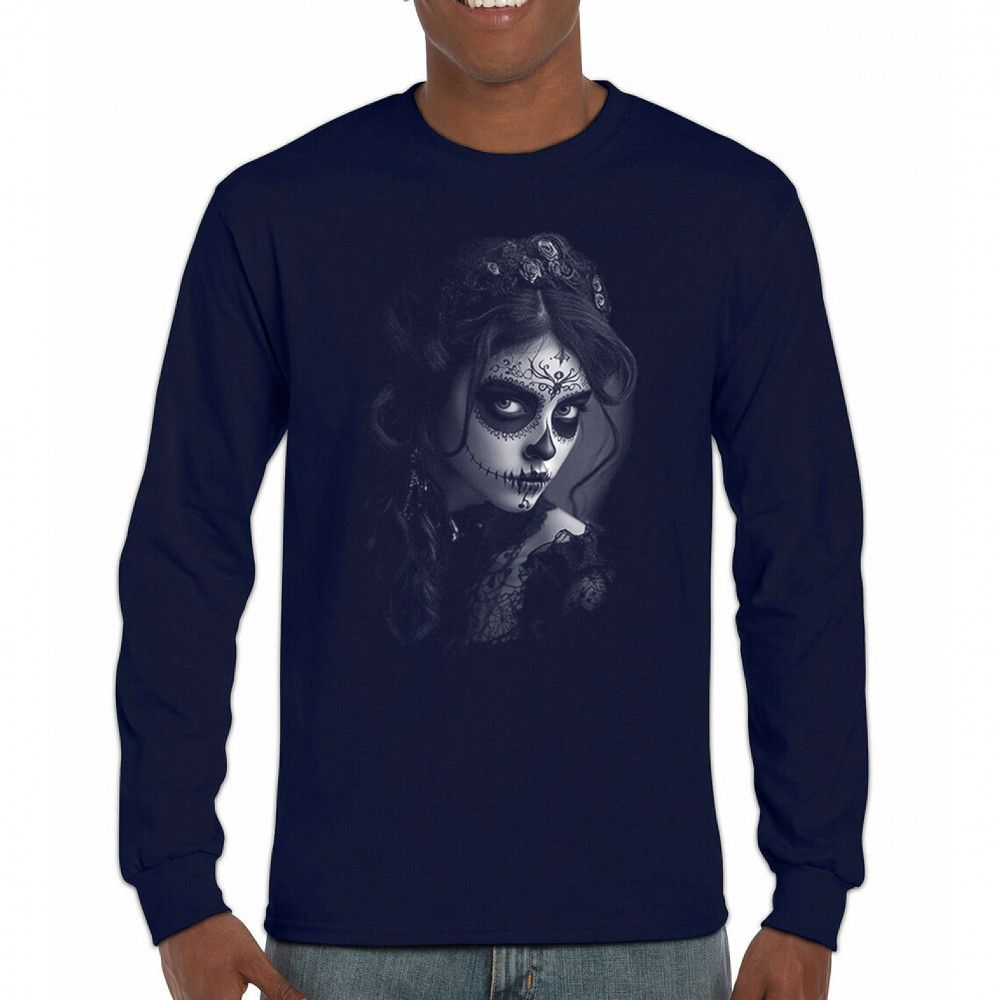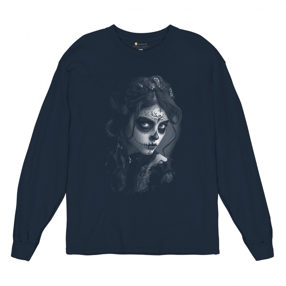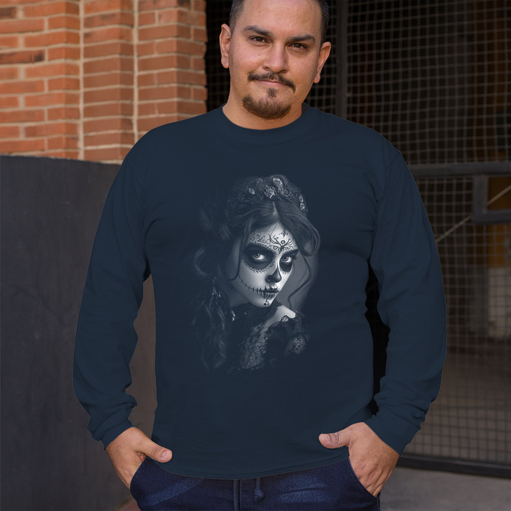 Showcasing a gothic woman with a sugar skull face, this black-and-white design blends DÃa de los Muertos tradition with dark elegance. Intricate face makeup, detailed lace, and a bold monochrome aesthetic create a dramatic visual tribute. A perfect piece for lovers of skull motifs, alt style, and haunting beauty.