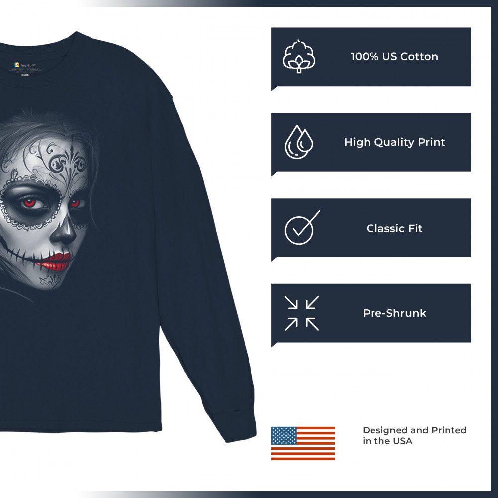 Bold sugar skull design with red eyes, red lips, and gothic makeup. Perfect for Day of the Dead, Halloween, or dark fashion vibes.