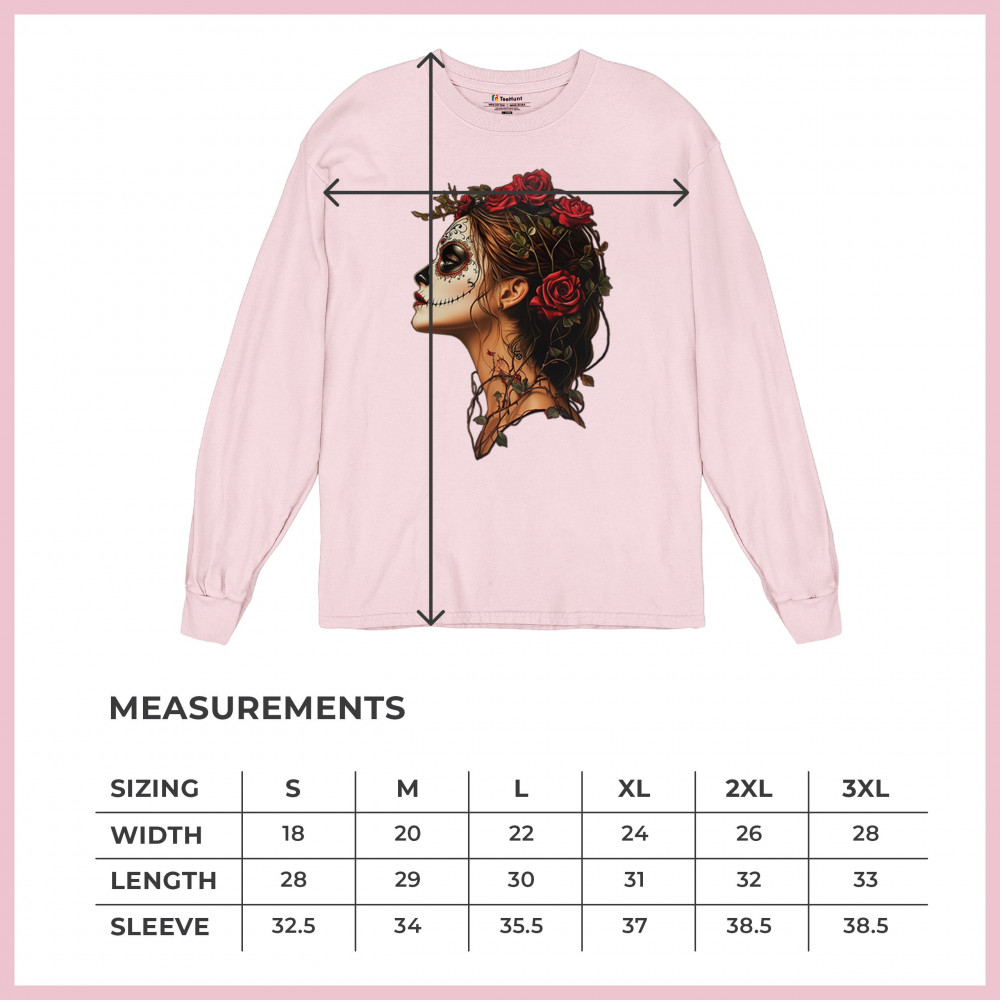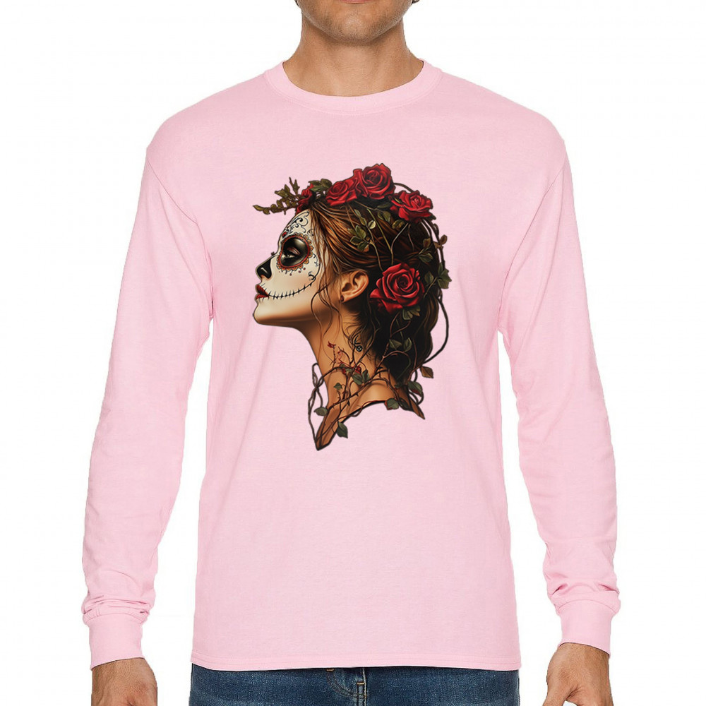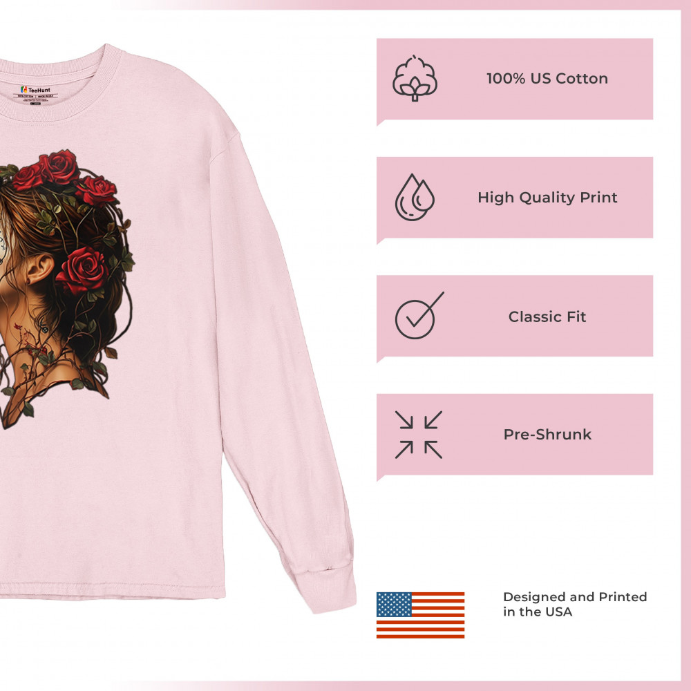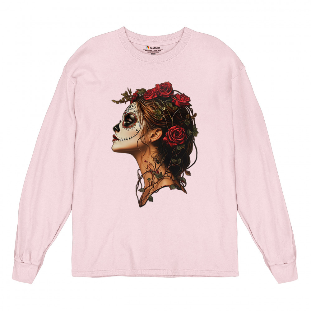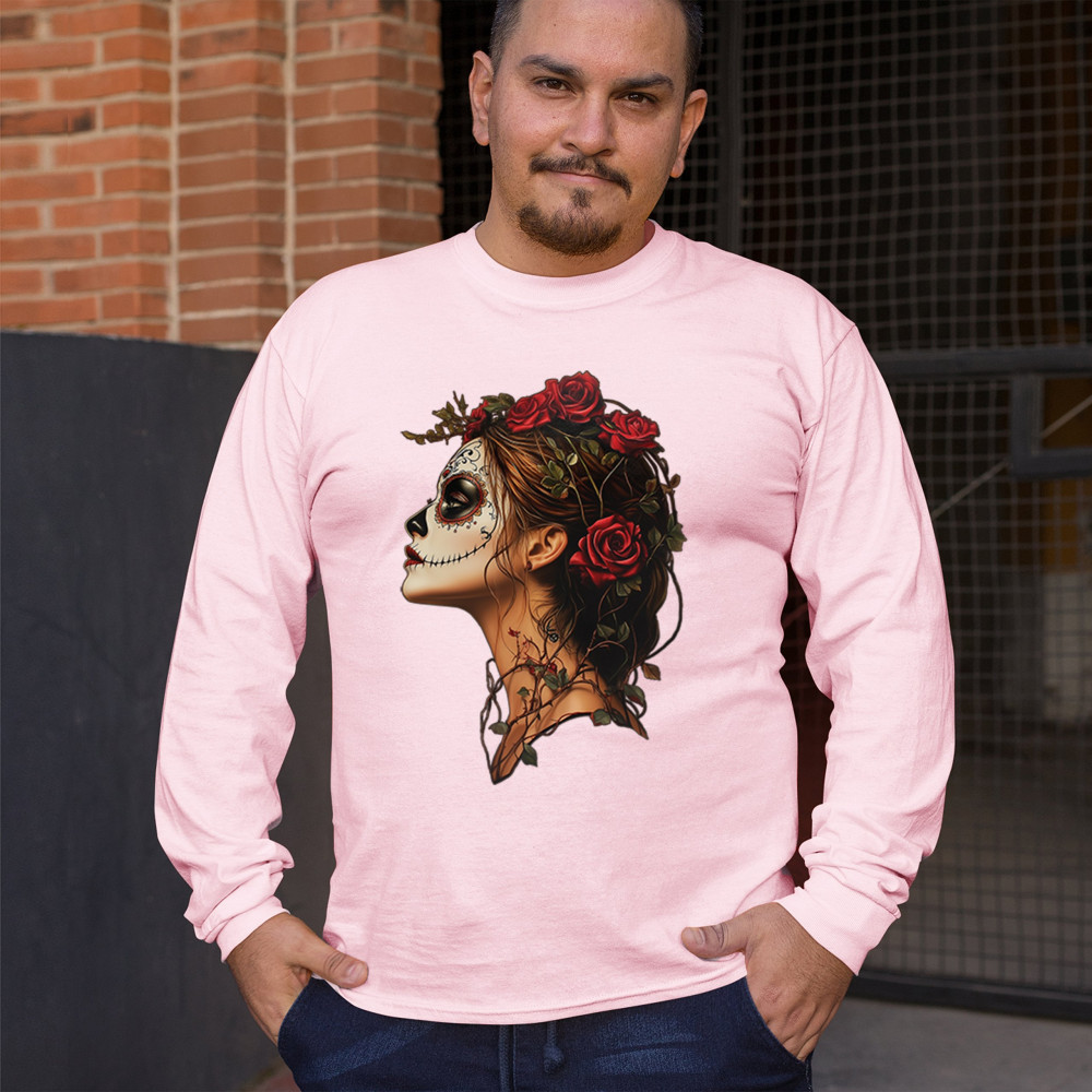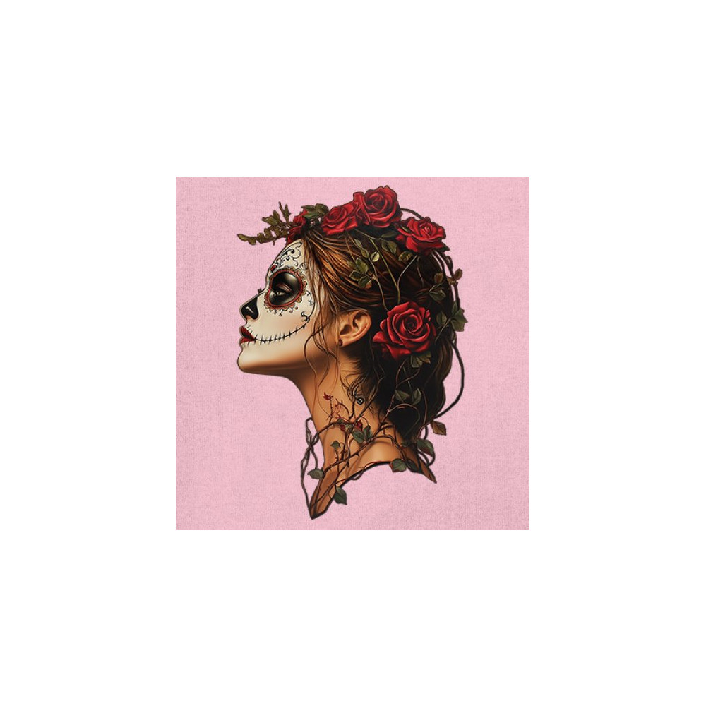 Celebrate feminine power and gothic elegance with this captivating DÃa de los Muertos design. Featuring a woman in profile with sugar skull makeup, blooming red roses, natural vines, dark hair, and symbolic floral skull art, this bold tribute captures beauty, death, and strength in one romantic, detailed visual.