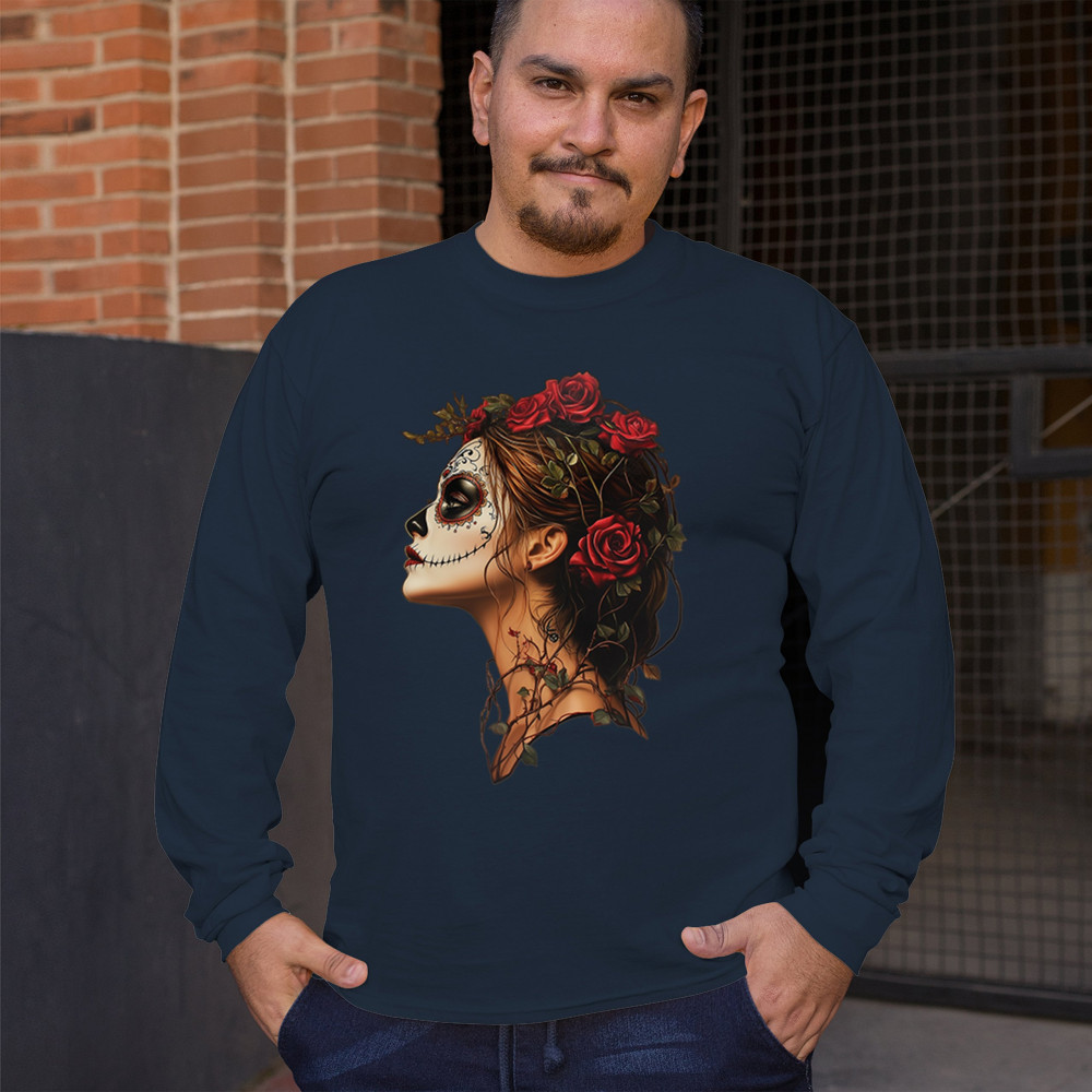 Celebrate feminine power and gothic elegance with this captivating DÃa de los Muertos design. Featuring a woman in profile with sugar skull makeup, blooming red roses, natural vines, dark hair, and symbolic floral skull art, this bold tribute captures beauty, death, and strength in one romantic, detailed visual.