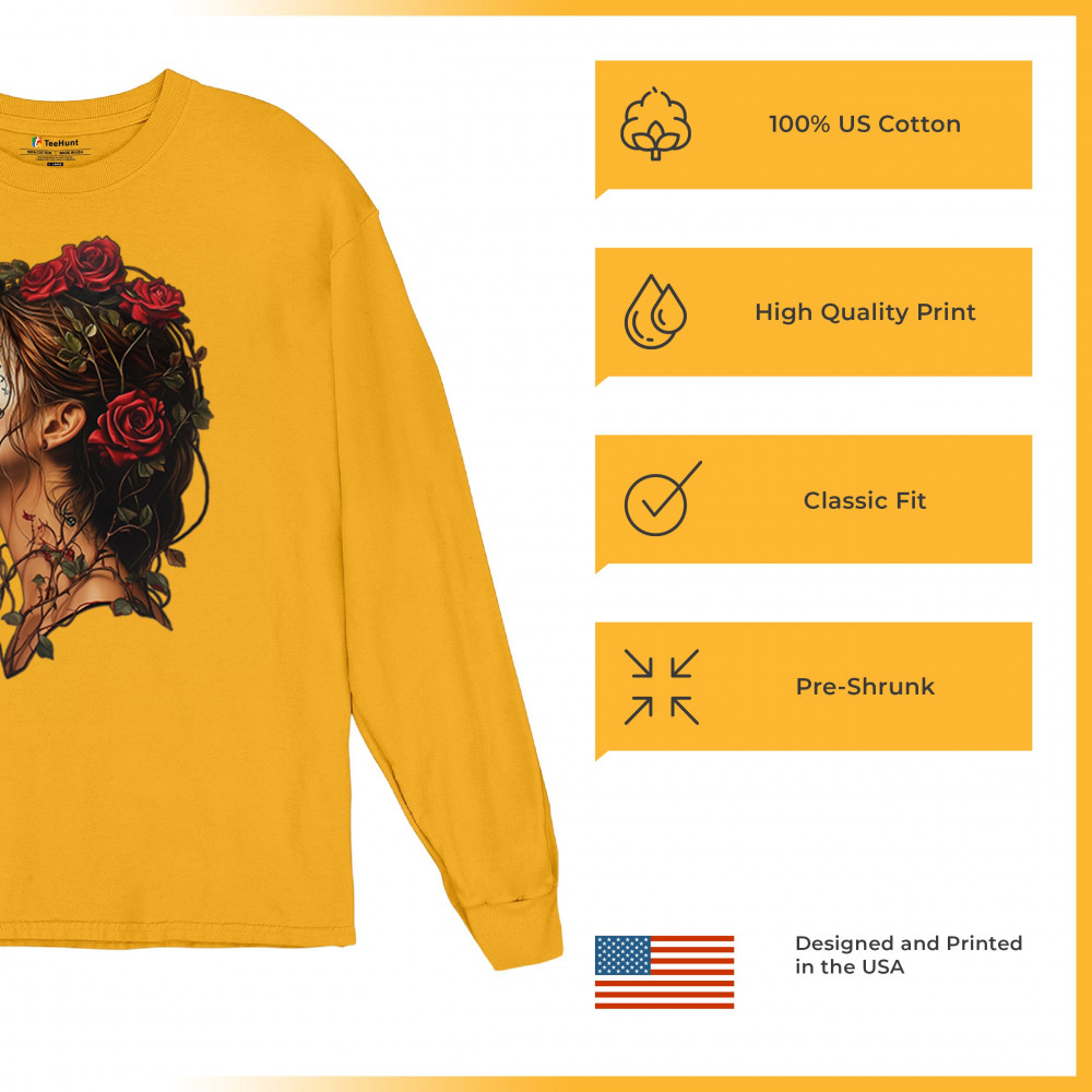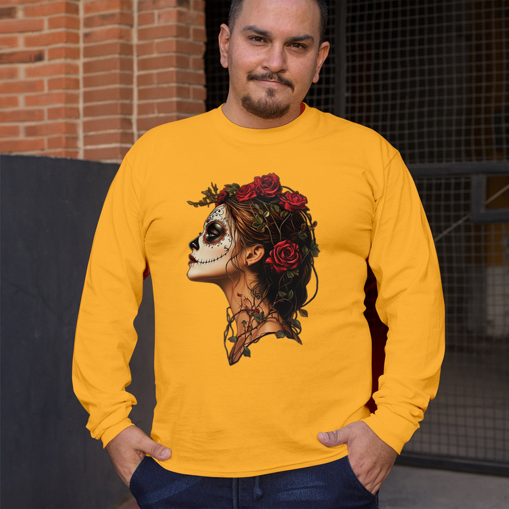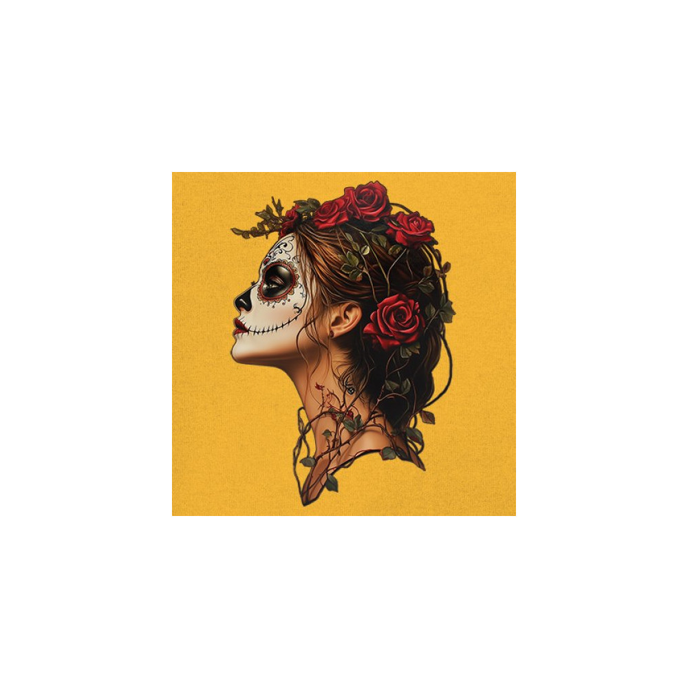 Celebrate feminine power and gothic elegance with this captivating DÃa de los Muertos design. Featuring a woman in profile with sugar skull makeup, blooming red roses, natural vines, dark hair, and symbolic floral skull art, this bold tribute captures beauty, death, and strength in one romantic, detailed visual.