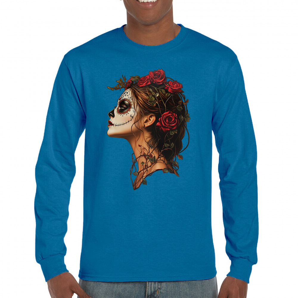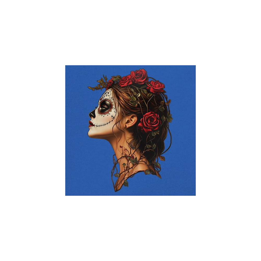 Celebrate feminine power and gothic elegance with this captivating DÃa de los Muertos design. Featuring a woman in profile with sugar skull makeup, blooming red roses, natural vines, dark hair, and symbolic floral skull art, this bold tribute captures beauty, death, and strength in one romantic, detailed visual.