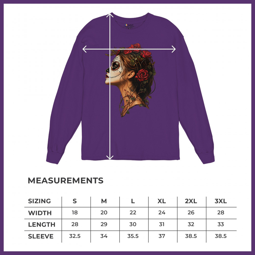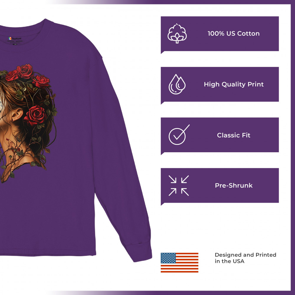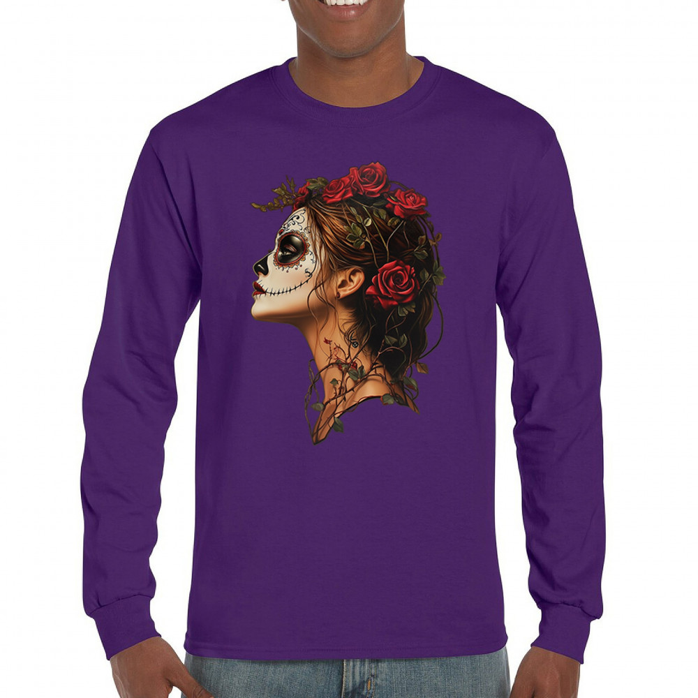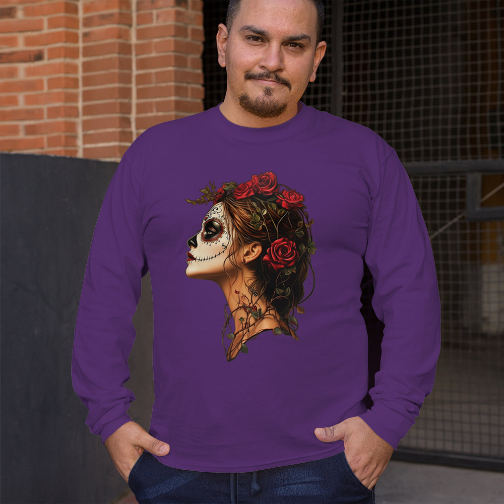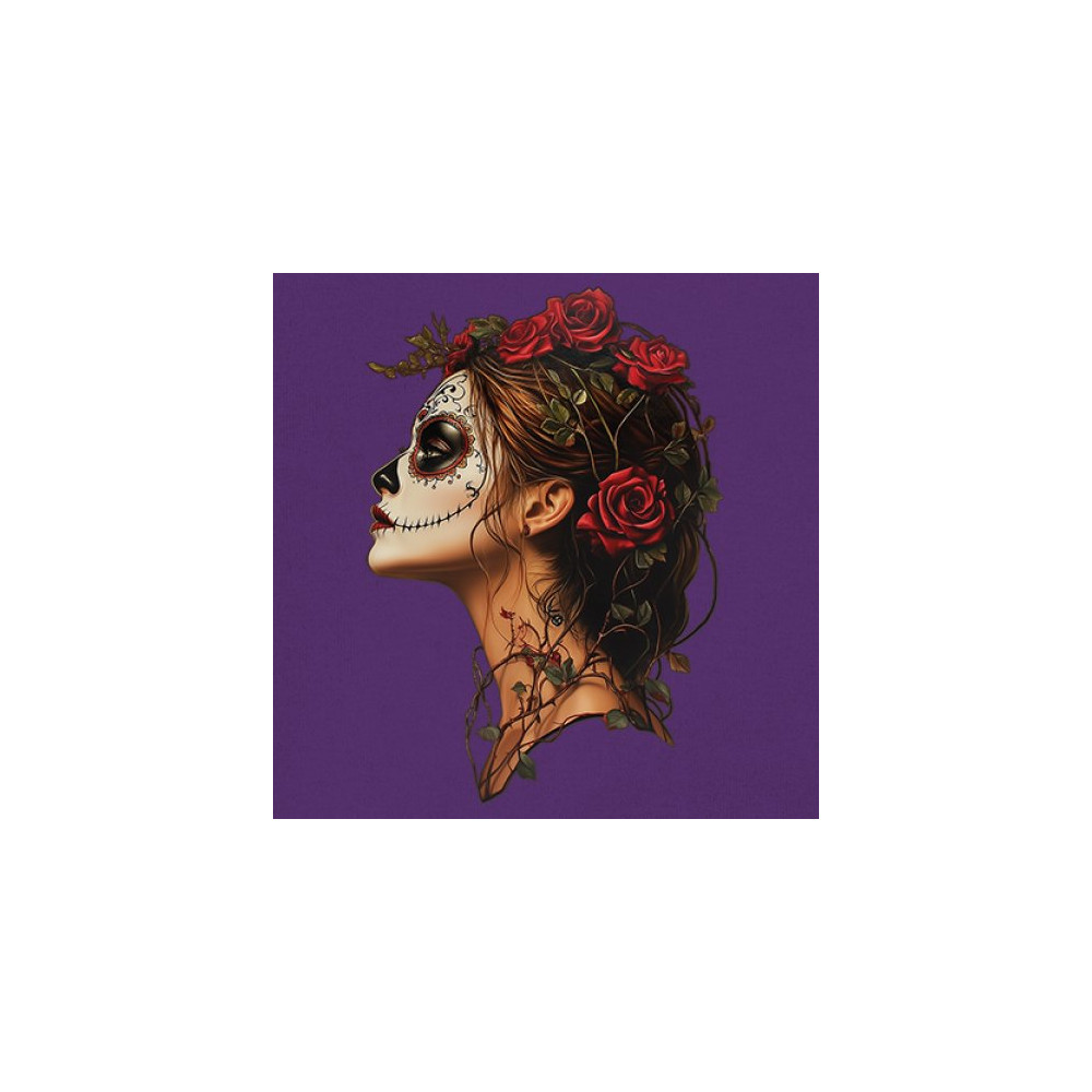Celebrate feminine power and gothic elegance with this captivating DÃa de los Muertos design. Featuring a woman in profile with sugar skull makeup, blooming red roses, natural vines, dark hair, and symbolic floral skull art, this bold tribute captures beauty, death, and strength in one romantic, detailed visual.