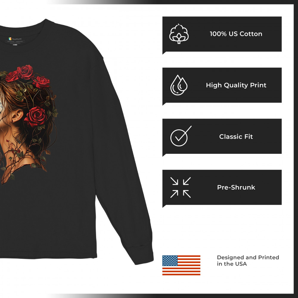 Bold floral skull art with sugar skull makeup, red roses, vines, and gothic elegance - perfect for DÃa de los Muertos and symbolic beauty fans.