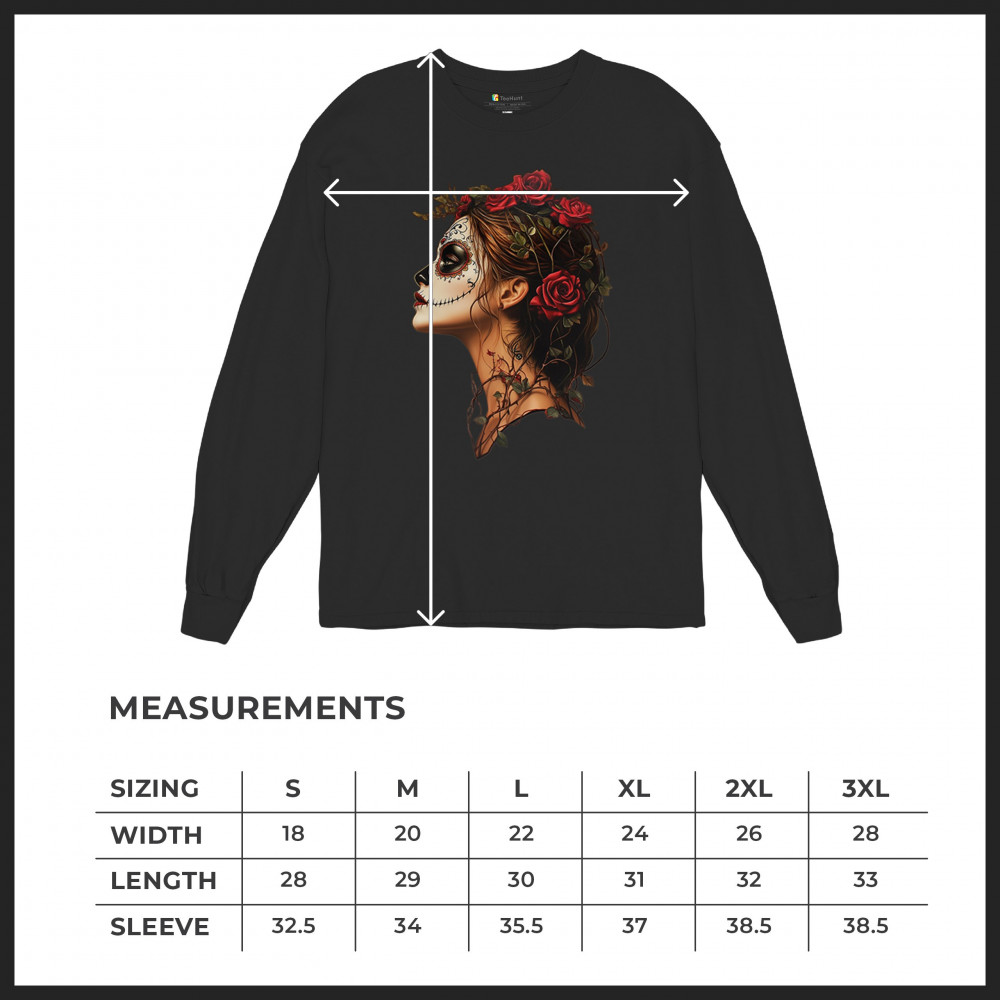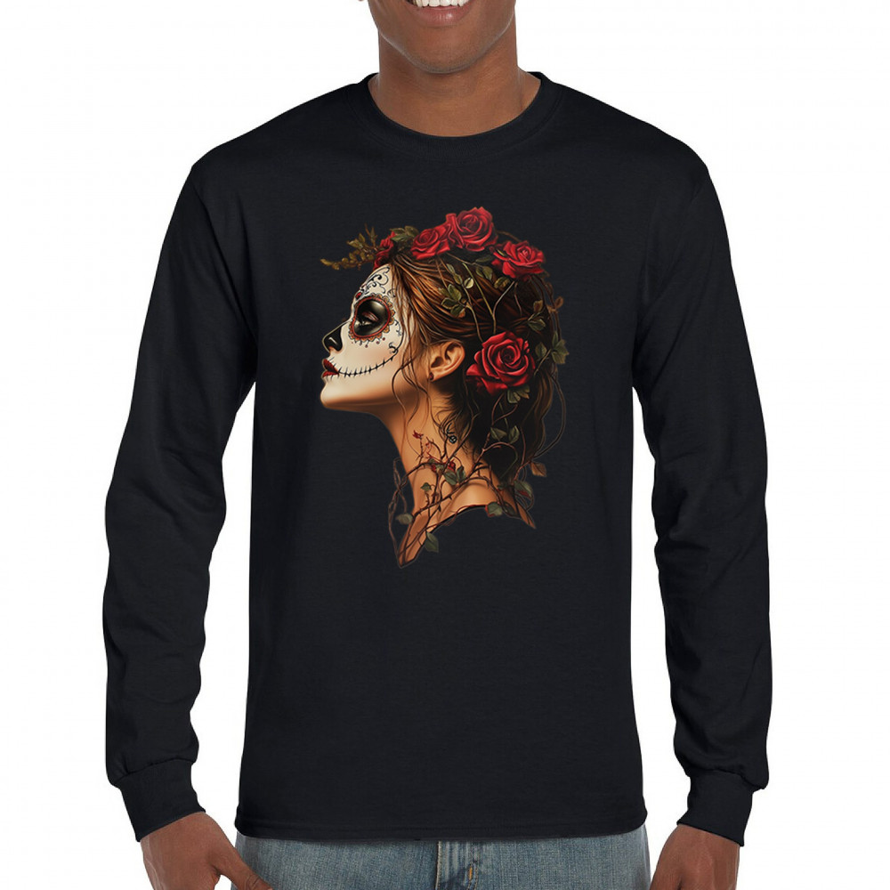 Celebrate feminine power and gothic elegance with this captivating DÃa de los Muertos design. Featuring a woman in profile with sugar skull makeup, blooming red roses, natural vines, dark hair, and symbolic floral skull art, this bold tribute captures beauty, death, and strength in one romantic, detailed visual.
