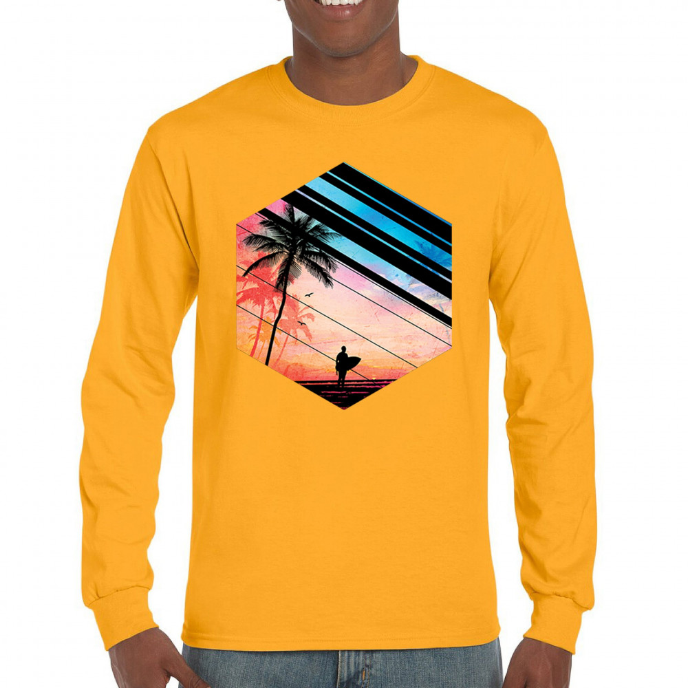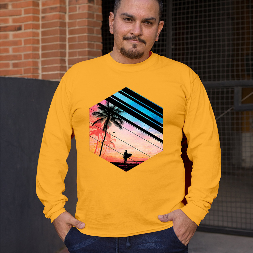 Catch the vibe of endless summer with our surf-inspired tee. Featuring silhouetted palms, warm gradients, and cool geometric shapes, it’s a visual journey from the urban grind to tropical tranquility. This tee is for the soul surfers and dreamers, made to be as enduring as the memories of your last wave. It's more than apparel—it’s a horizon of possibilities. Add this staple to your collection and let the good times roll.