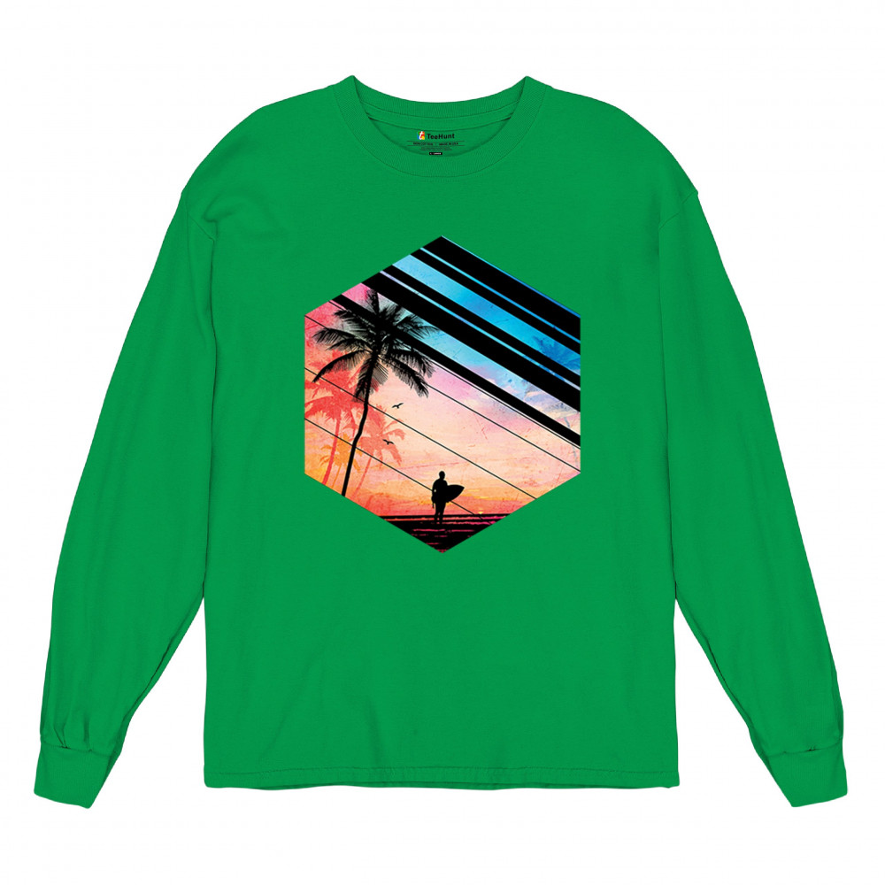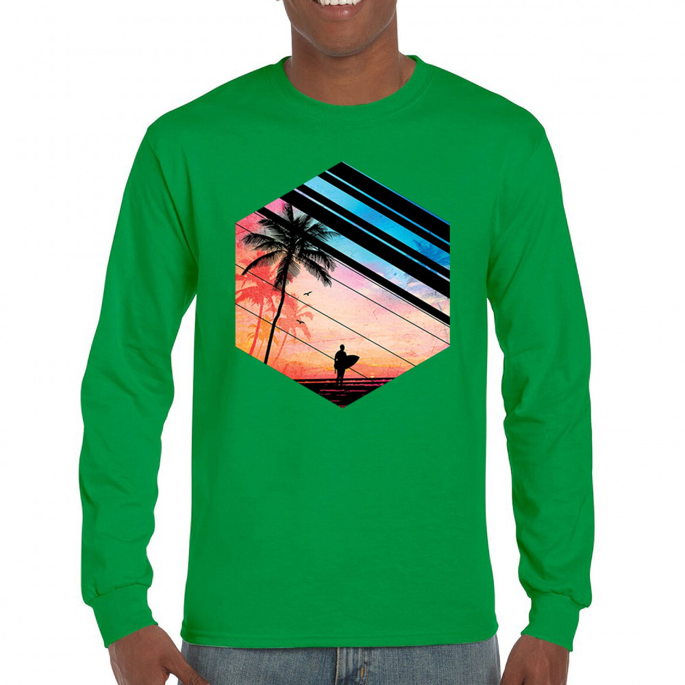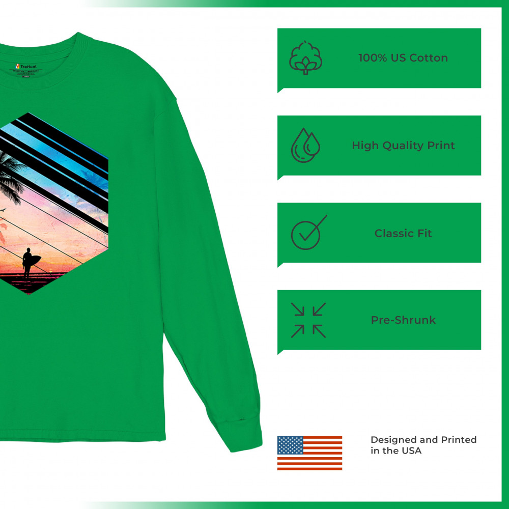 Catch the vibe of endless summer with our surf-inspired tee. Featuring silhouetted palms, warm gradients, and cool geometric shapes, it’s a visual journey from the urban grind to tropical tranquility. This tee is for the soul surfers and dreamers, made to be as enduring as the memories of your last wave. It's more than apparel—it’s a horizon of possibilities. Add this staple to your collection and let the good times roll.
