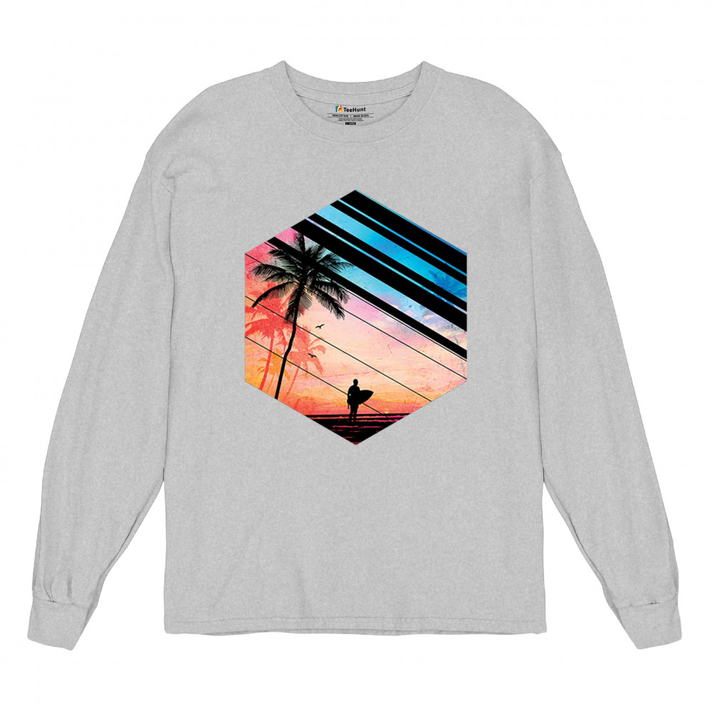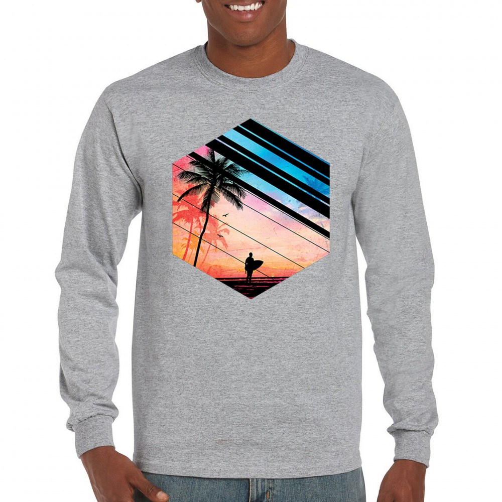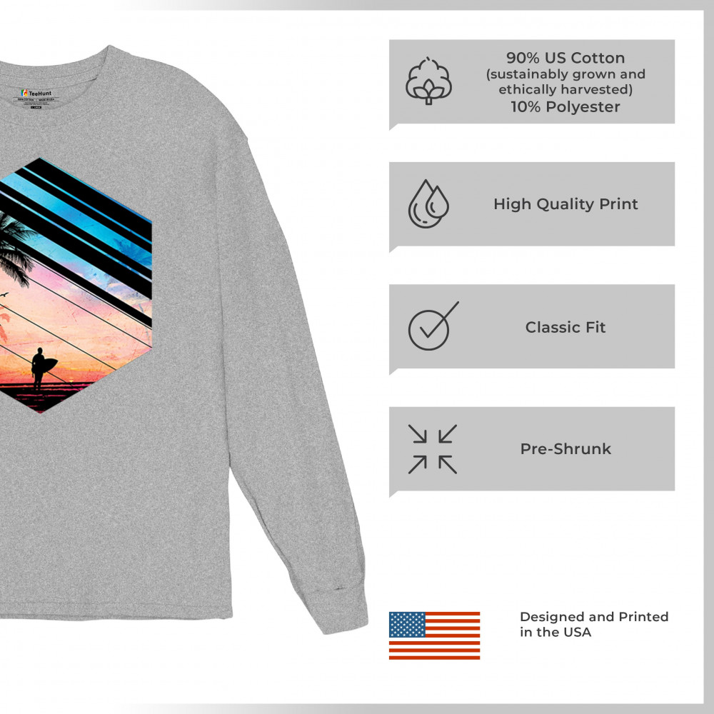 Catch the vibe of endless summer with our surf-inspired tee. Featuring silhouetted palms, warm gradients, and cool geometric shapes, it’s a visual journey from the urban grind to tropical tranquility. This tee is for the soul surfers and dreamers, made to be as enduring as the memories of your last wave. It's more than apparel—it’s a horizon of possibilities. Add this staple to your collection and let the good times roll.