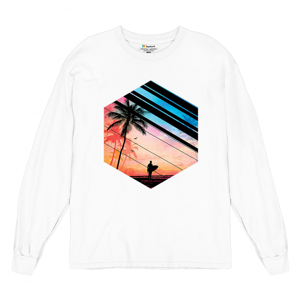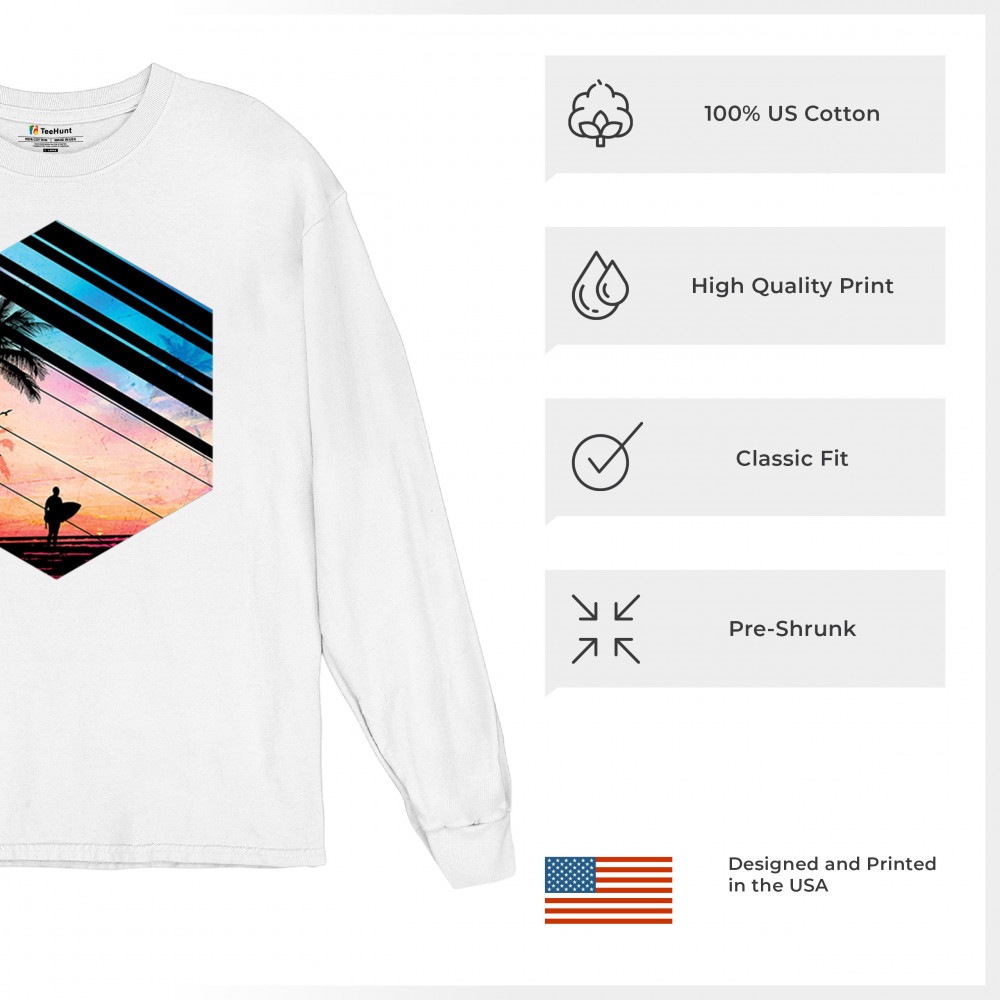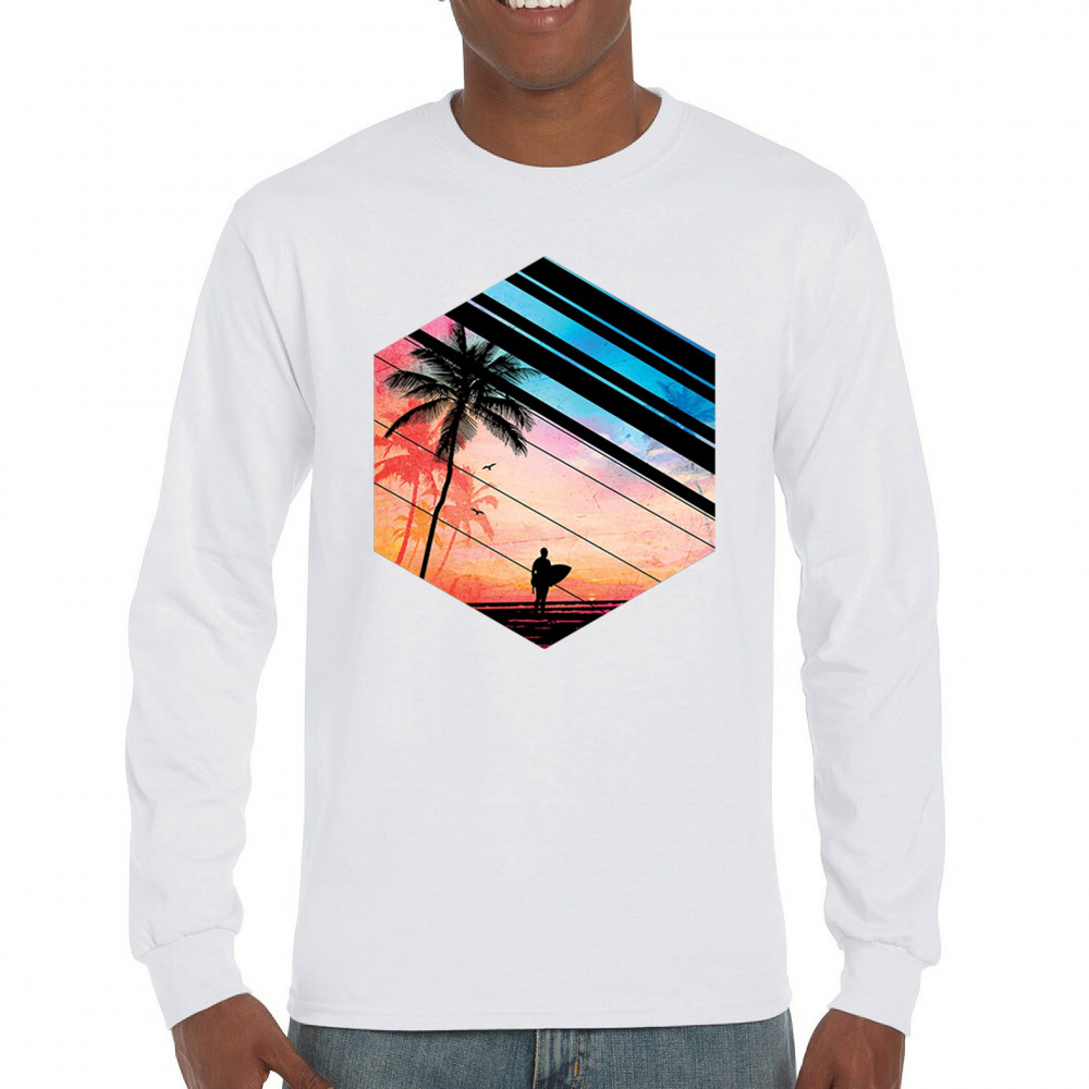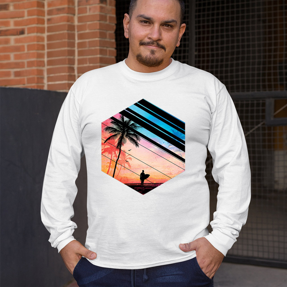 Catch the vibe of endless summer with our surf-inspired tee. Featuring silhouetted palms, warm gradients, and cool geometric shapes, it’s a visual journey from the urban grind to tropical tranquility. This tee is for the soul surfers and dreamers, made to be as enduring as the memories of your last wave. It's more than apparel—it’s a horizon of possibilities. Add this staple to your collection and let the good times roll.