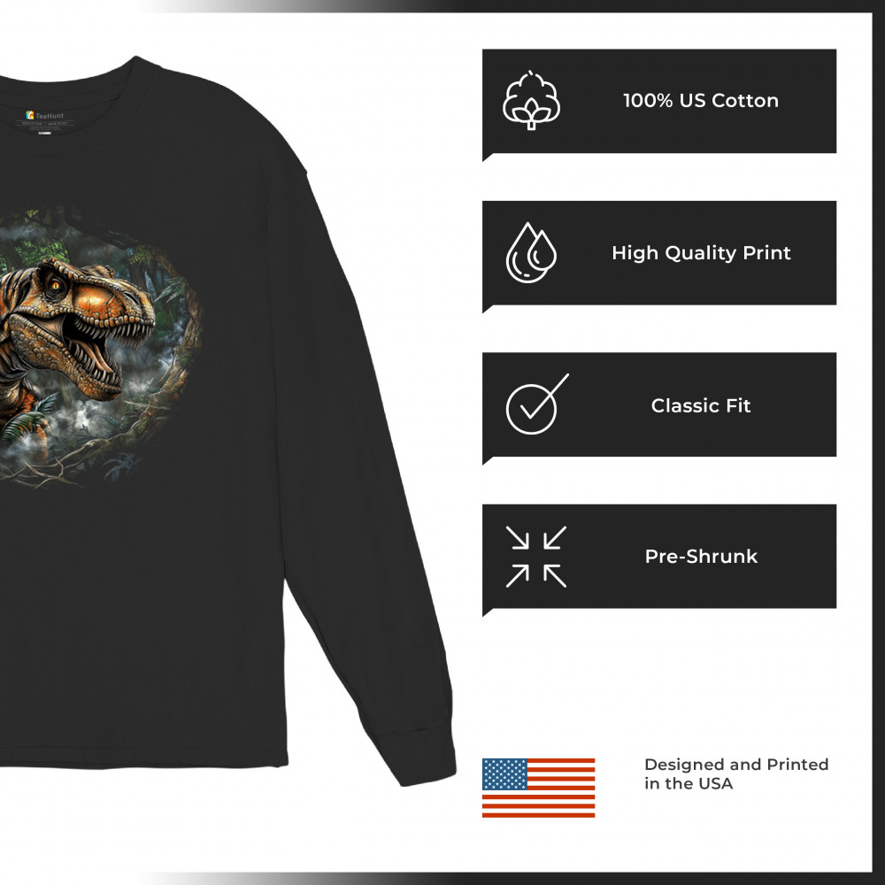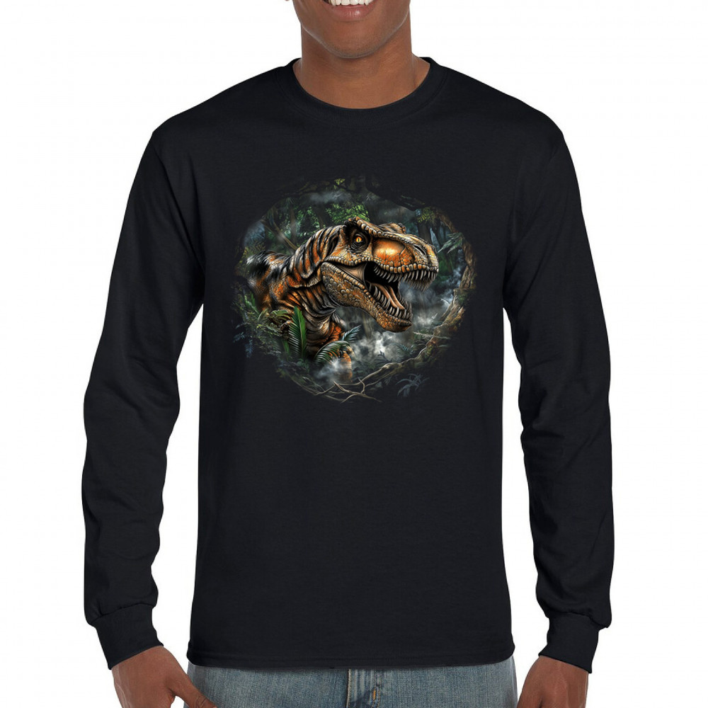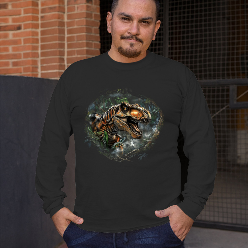 Step into the Jurassic jungle with this electrifying t rex design. With sharp teeth, rugged scales, and mist swirling through lush greenery, this tyrannosaurus roars to life. Perfect for dinosaur fans, fossil lovers, and nature explorers. Wear it to museums, theme parks, or wherever ancient beasts still rule the imagination.
