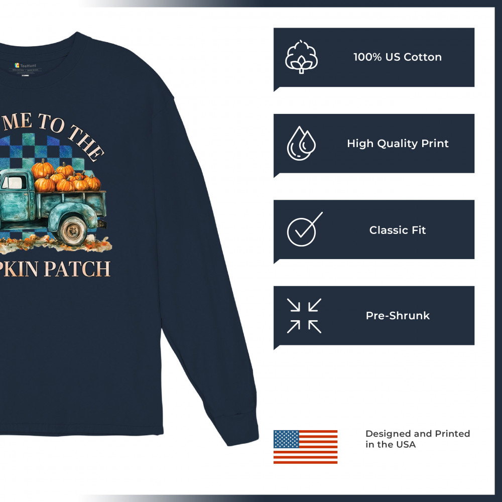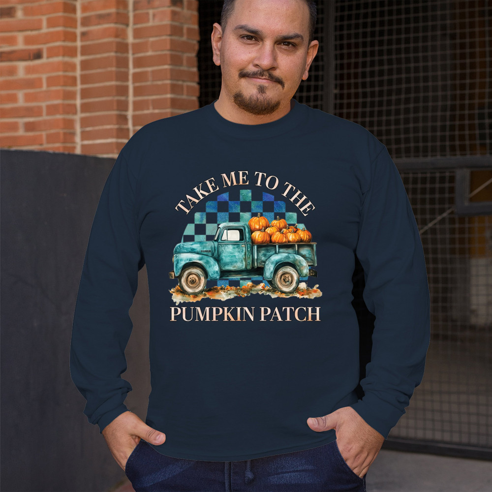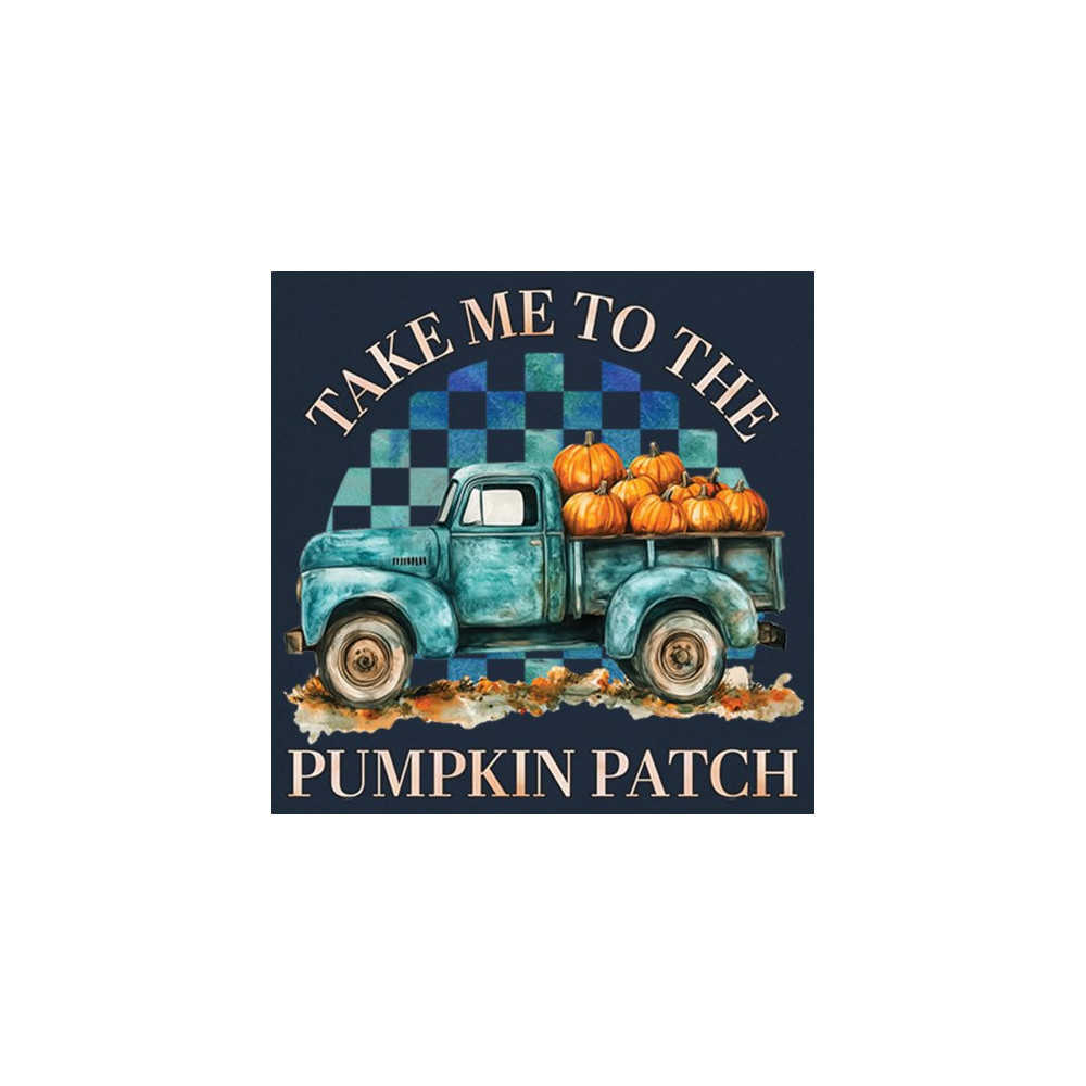 Celebrate autumn in style with the "Take Me to the Pumpkin Patch" design, featuring a vintage truck and festive pumpkins—perfect for fall lovers!