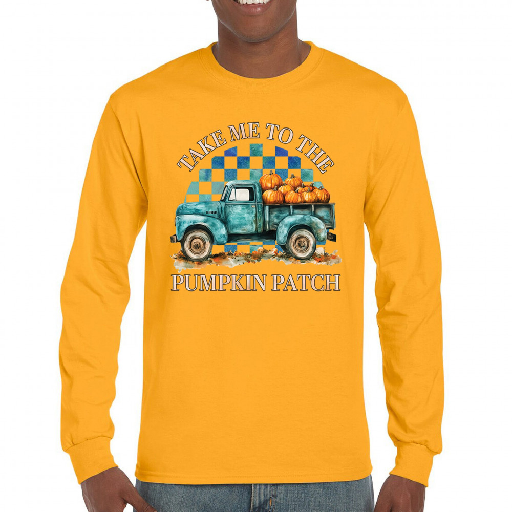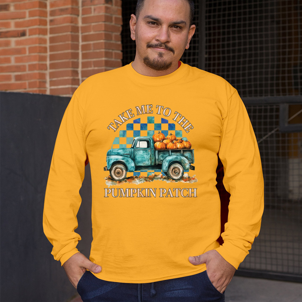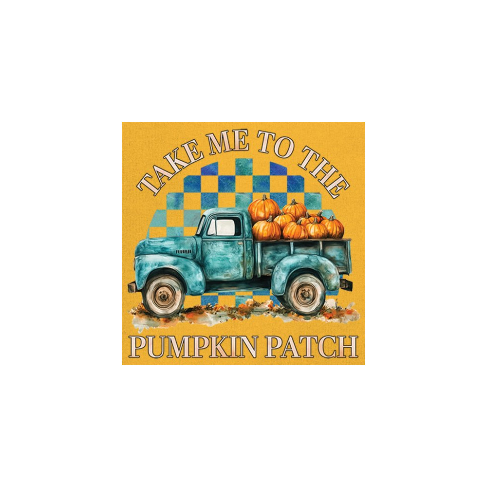 Celebrate autumn in style with the "Take Me to the Pumpkin Patch" design, featuring a vintage truck and festive pumpkins—perfect for fall lovers!