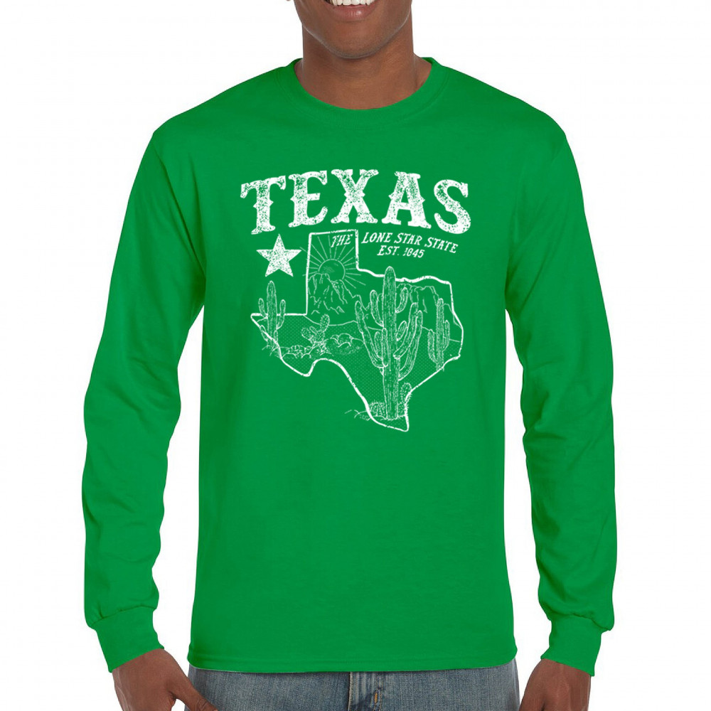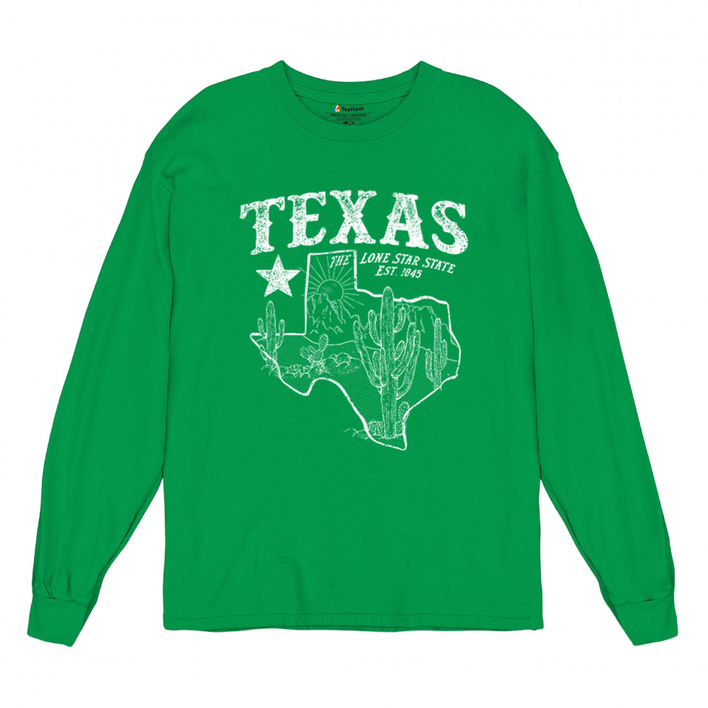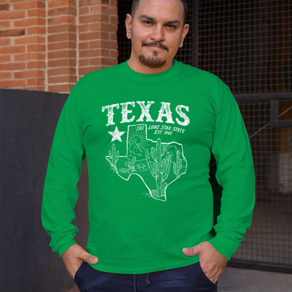 Celebrate the Lone Star State with this rugged Texas map design featuring cactus, mountains, and bold state pride text. A rustic southwestern tribute to the state’s heritage, established in 1845, it’s the perfect look for rodeos, country festivals, and lovers of the Texas desert lifestyle and scenery.