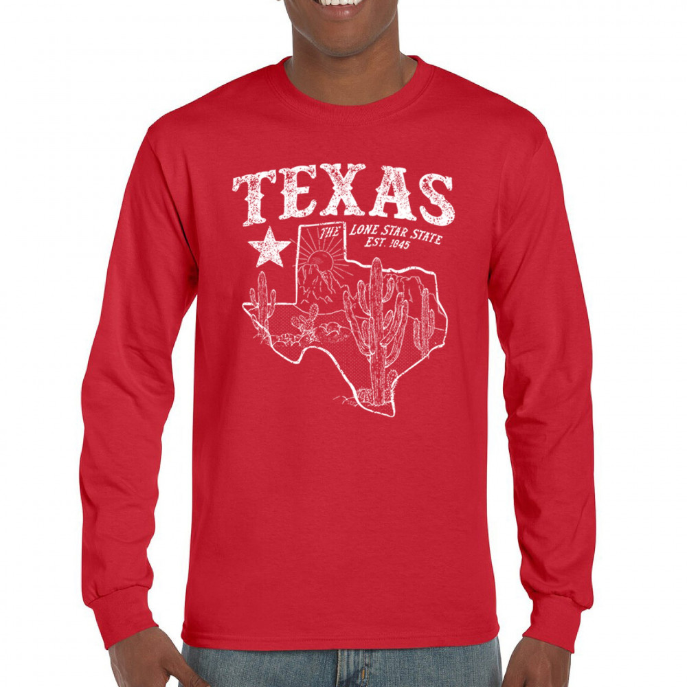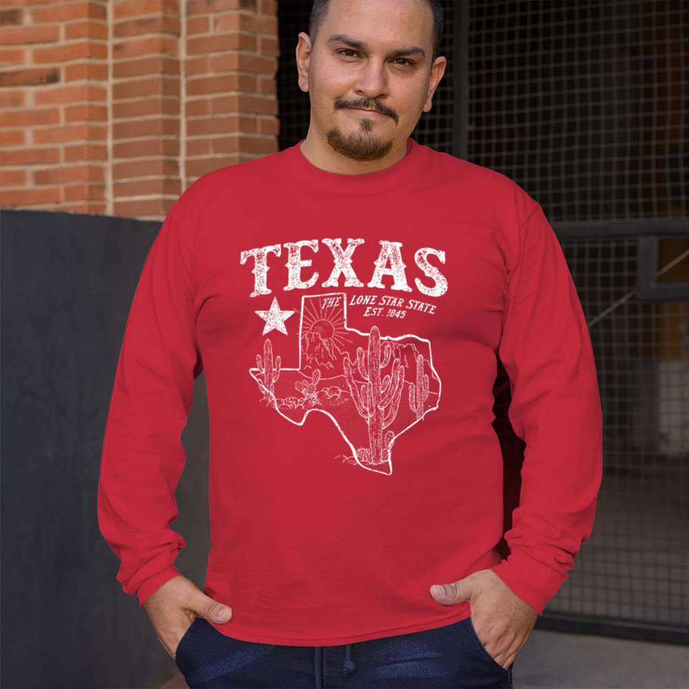 Vintage Texas pride design with cactus, mountains, Lone Star symbol, and 1845 tribute—perfect for rodeos and western events.