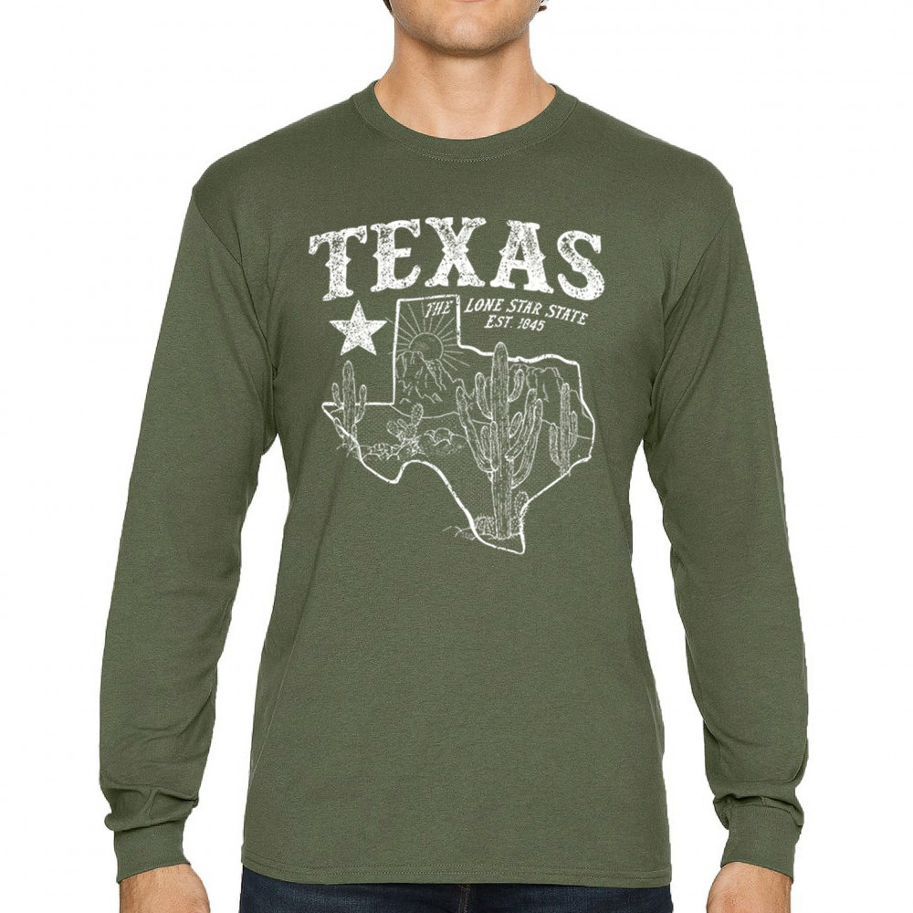 Vintage Texas pride design with cactus, mountains, Lone Star symbol, and 1845 tribute—perfect for rodeos and western events.