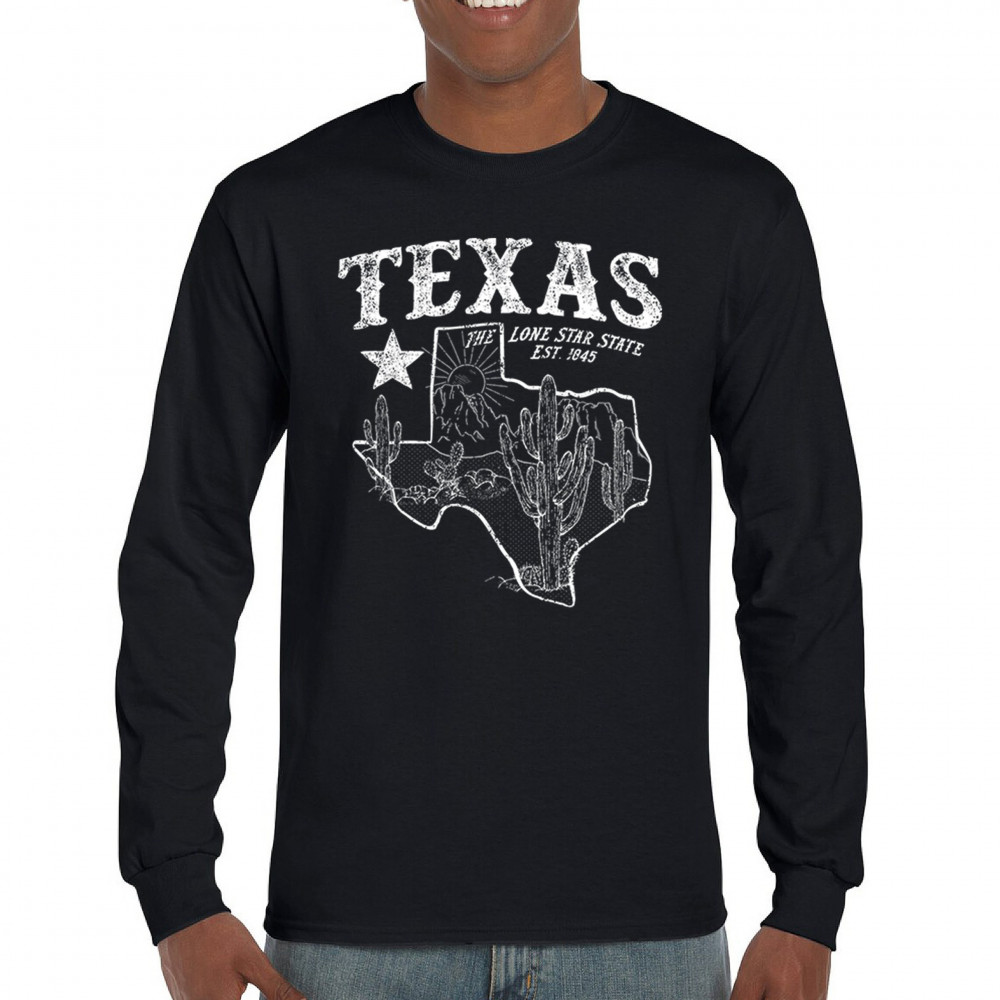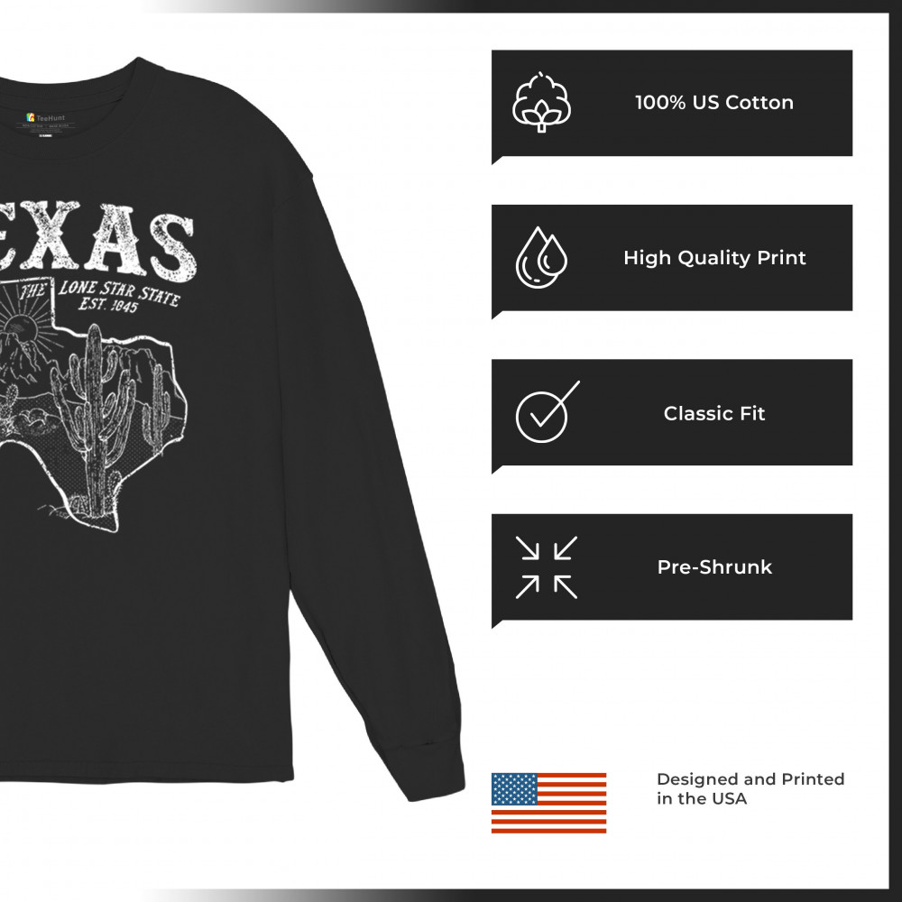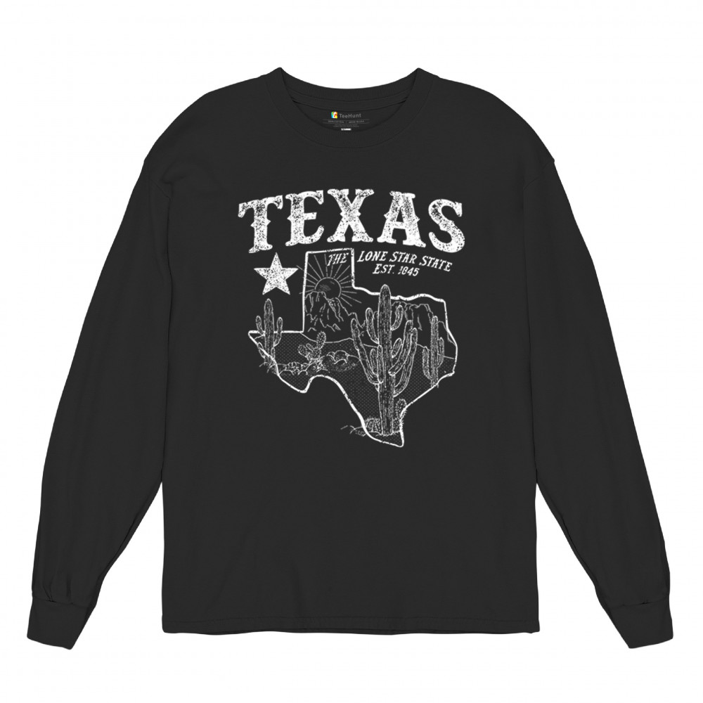 Vintage Texas pride design with cactus, mountains, Lone Star symbol, and 1845 tribute—perfect for rodeos and western events.