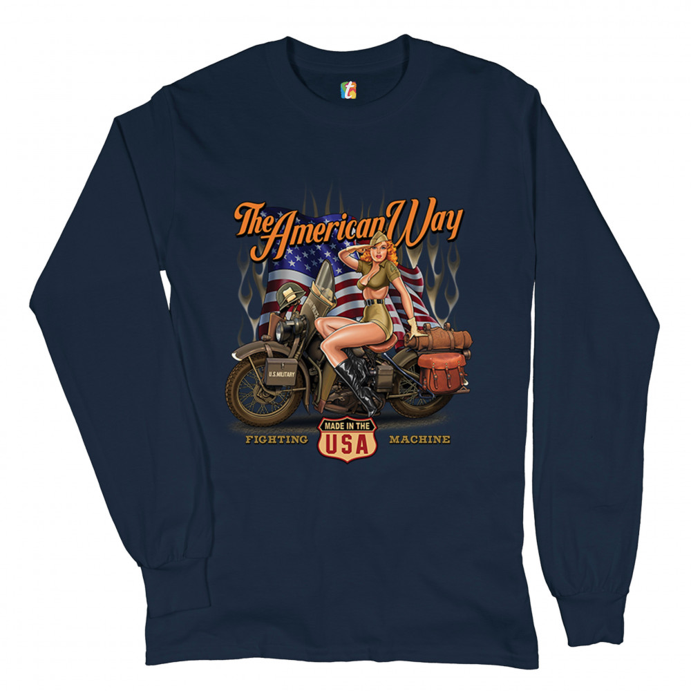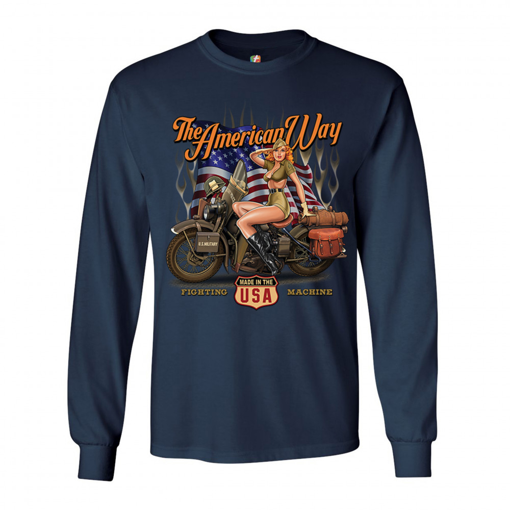 A print featuring a beautiful pin-up girl in leather boots sitting on a U.S. military motorcycle. There is the American Flag in the background and the words "The American Way" above it. At the bottom of the picture there is a shield which says: "made in the USA". "Fighting Machine" is written under the motorcycle's wheels. A great choice for a motorcycle enthusiast.